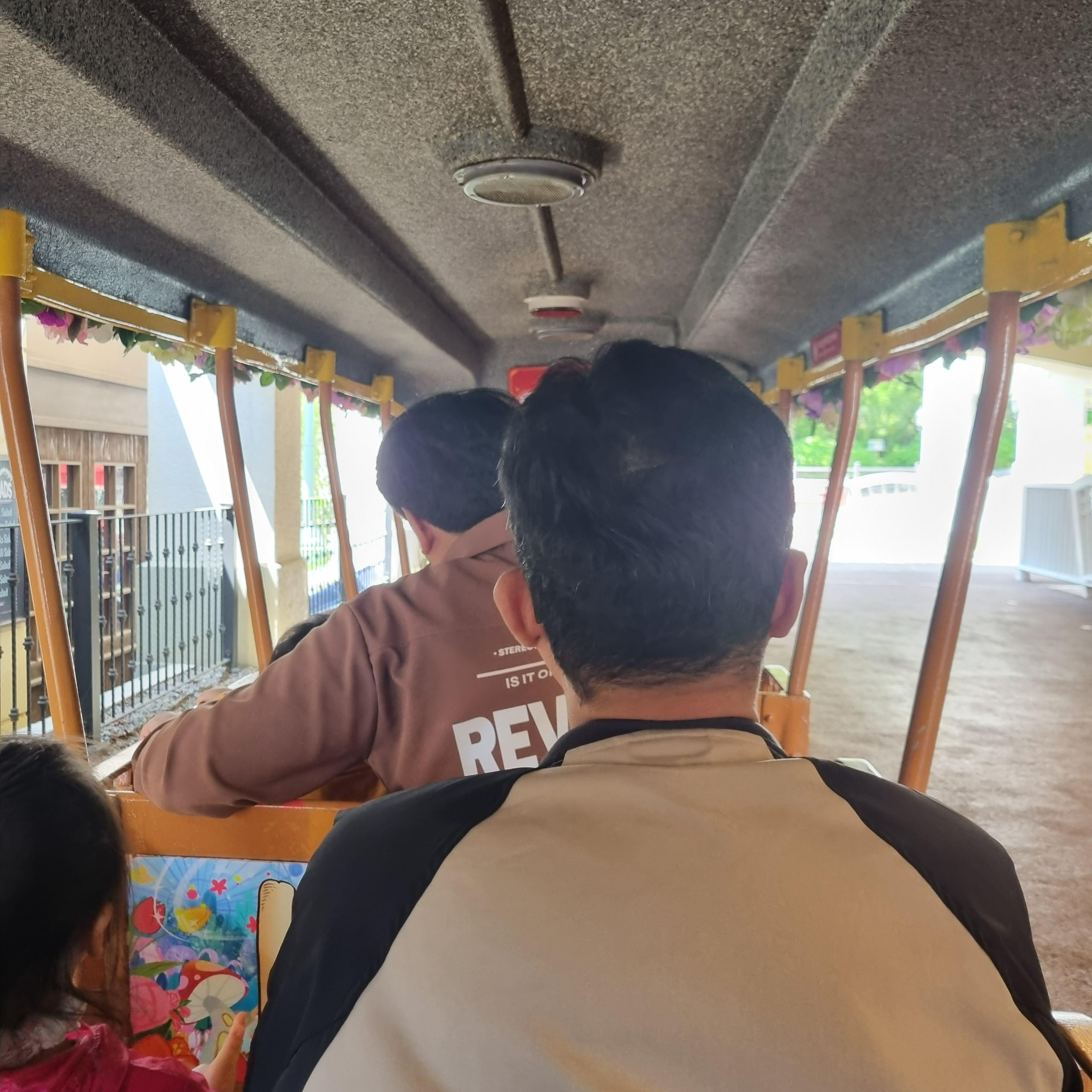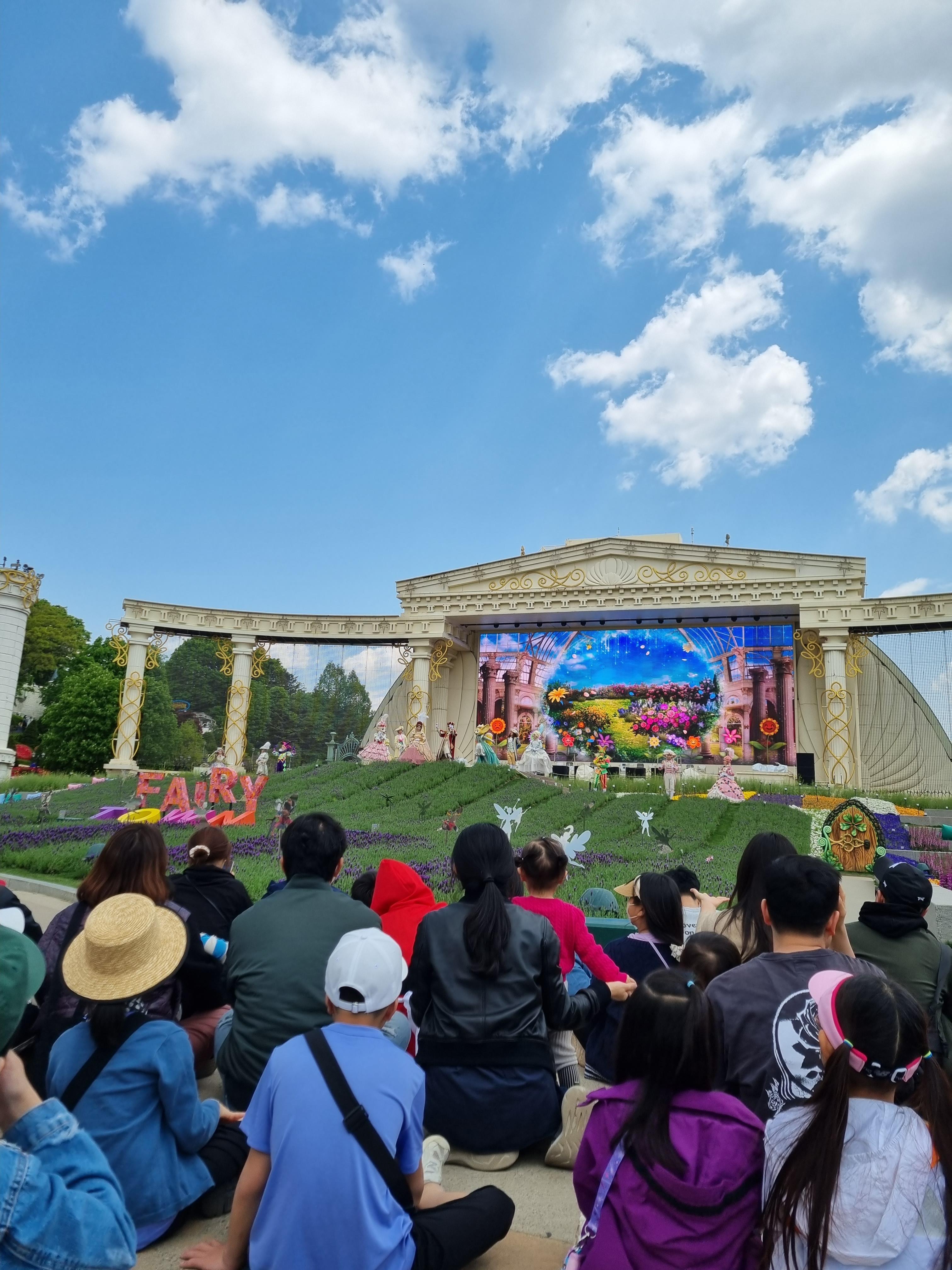 어린이 놀이기구를 포기하고 예약된 페스티벌 트레인을 타러 왔습니다. 한참 순서를 기다리다 드디어 탑승했습니다. 페스티벌 트레인에서 사진 찍어봅니다. 포시즌스 가든을 보니 아직은 여유가 있어 보여요.