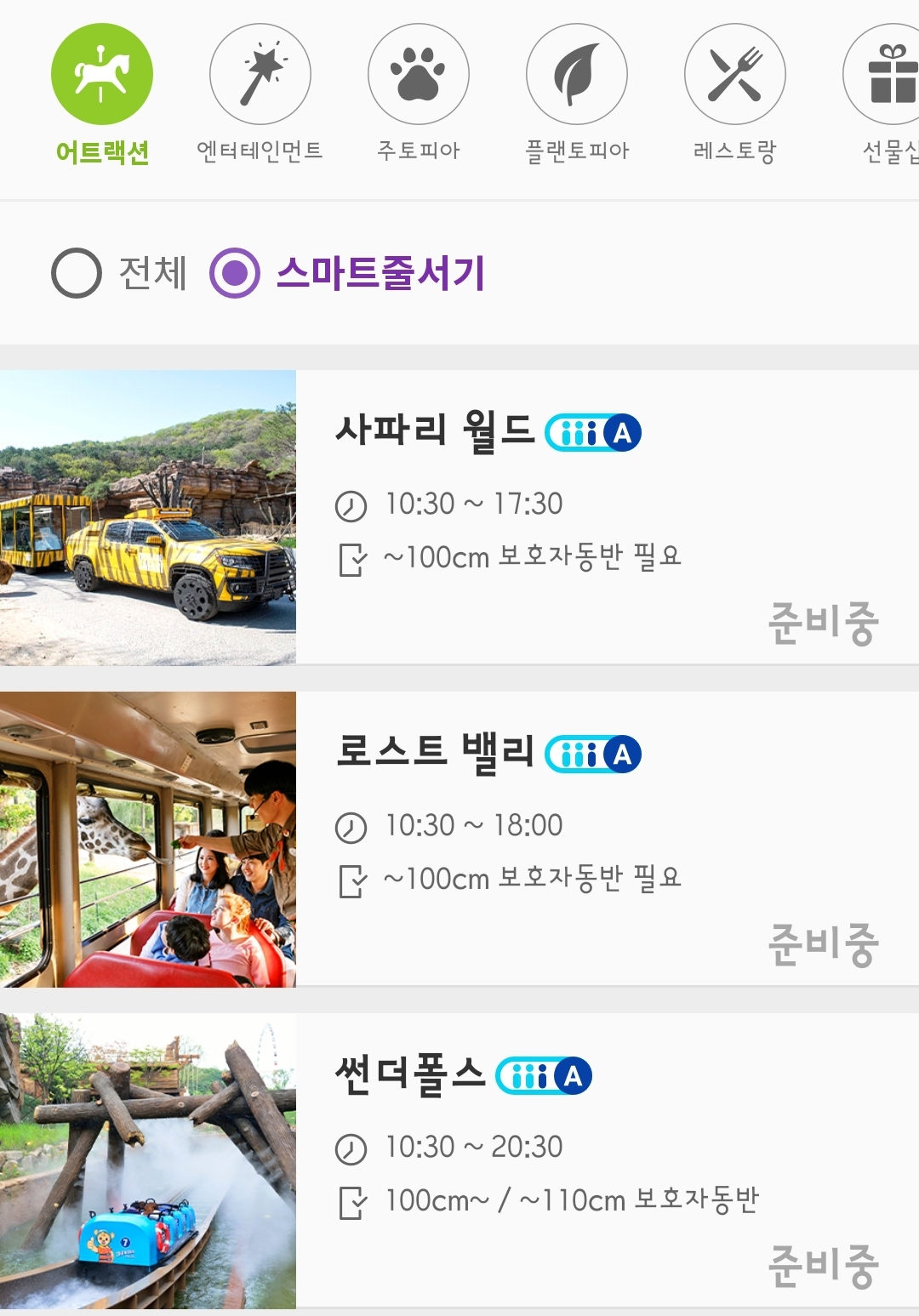 그리고 검표하자마자 에버랜드 앱으로 스마트 줄 서기 하세요. 딱 1개만 되니까 제일 타고 싶은 거부터 하세요. 아이들이 있는 경우, 보통 사파리, 로스트밸리 중에 많이 선택하더라고요.
