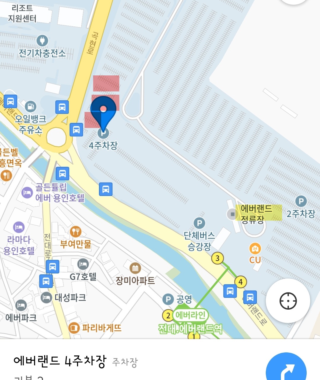 4 주차장은 골든튤립 호텔 로터리 근처예요. 전대 에버랜드역 앞에 2 주차장과 붙어 있습니다. 정문 방향 인근 도로도 밀려서 4 주차장에 세웠습니다.