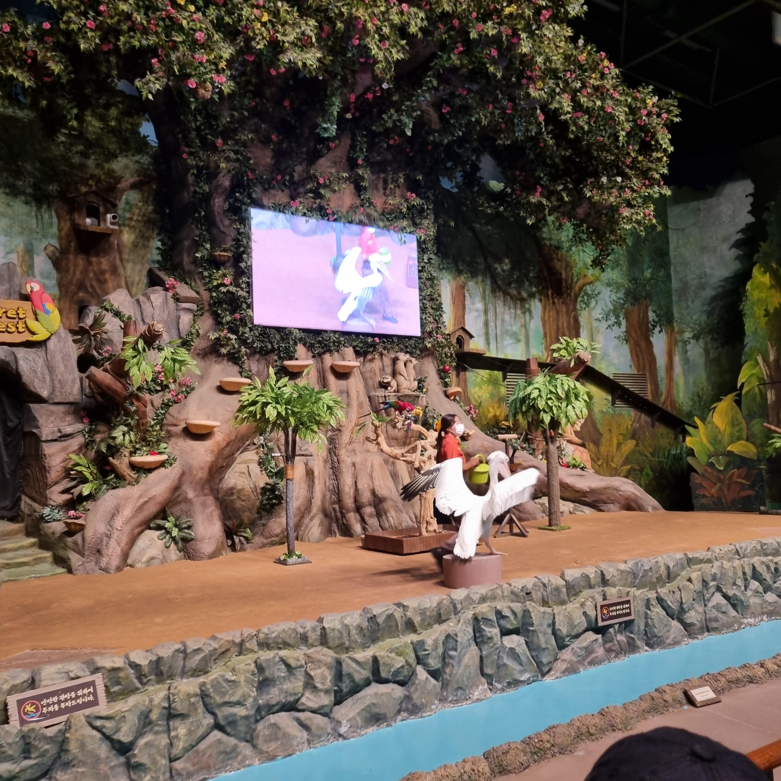 판타스틱 윙스 14시 공연 봤습니다. 슈퍼윙스 애니멀 톡과 다른 스케일이 느껴집니다. 저희가 있던 쪽에서도 새들이 나오고 사진 오른편 나무 사이로도 나오고 들어갑니다.