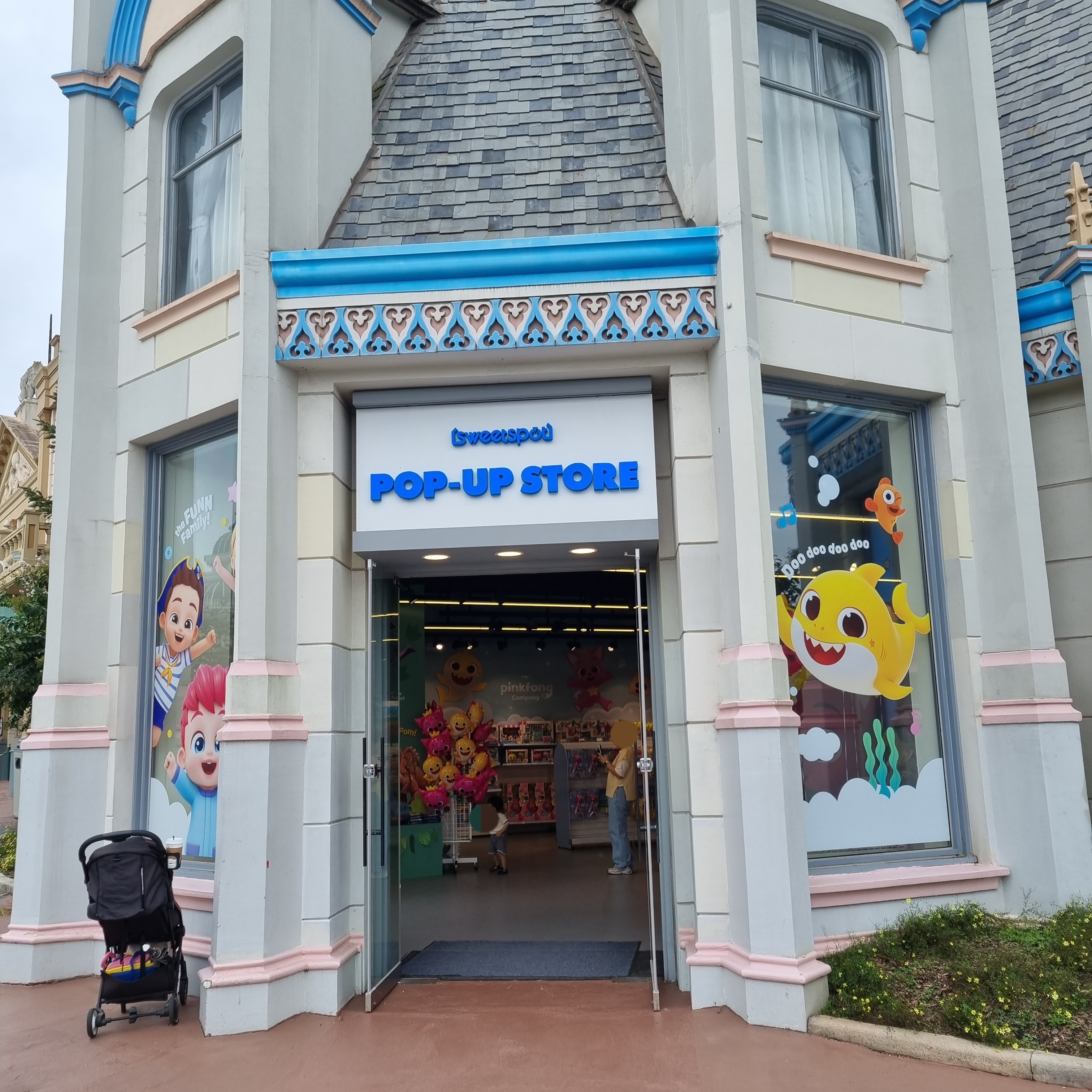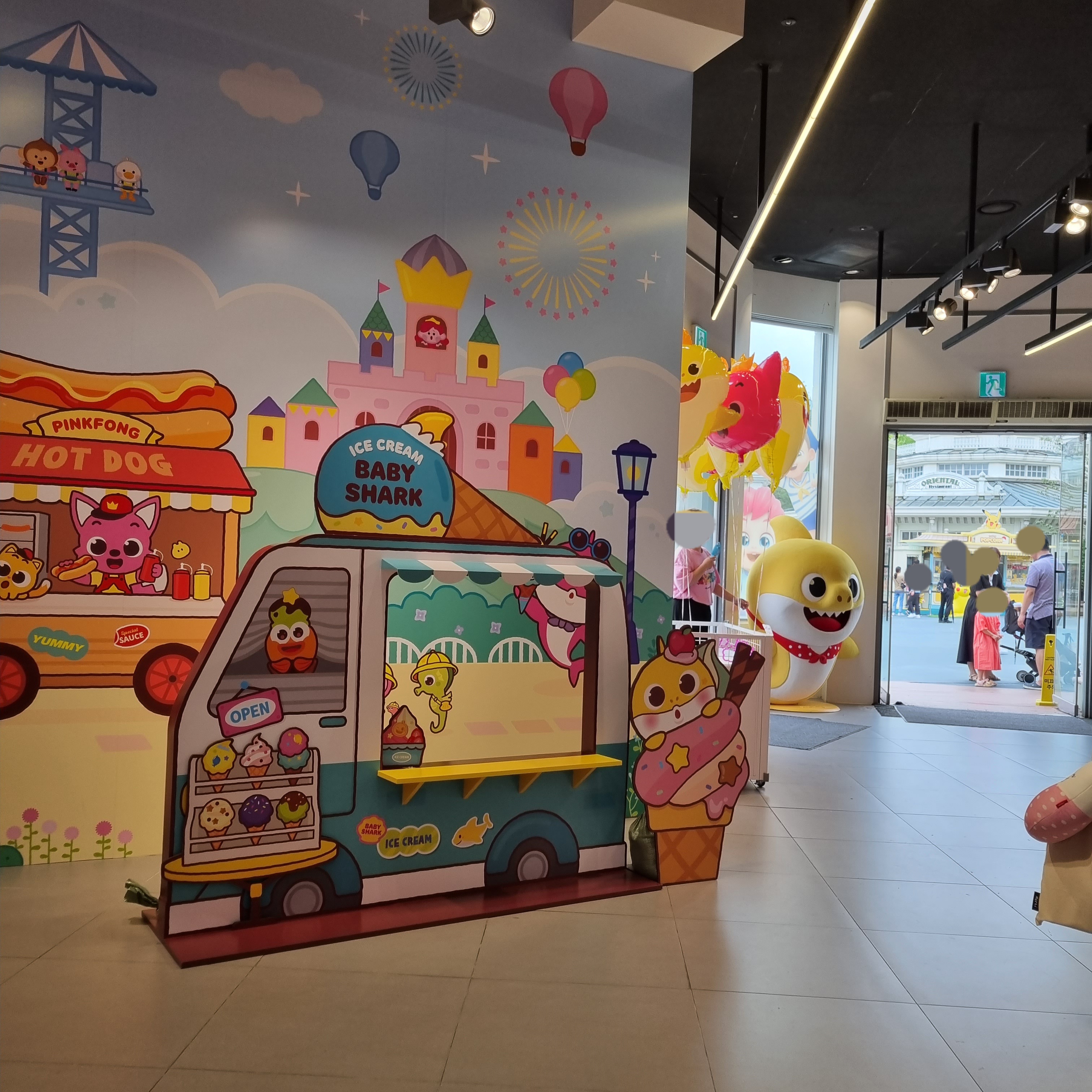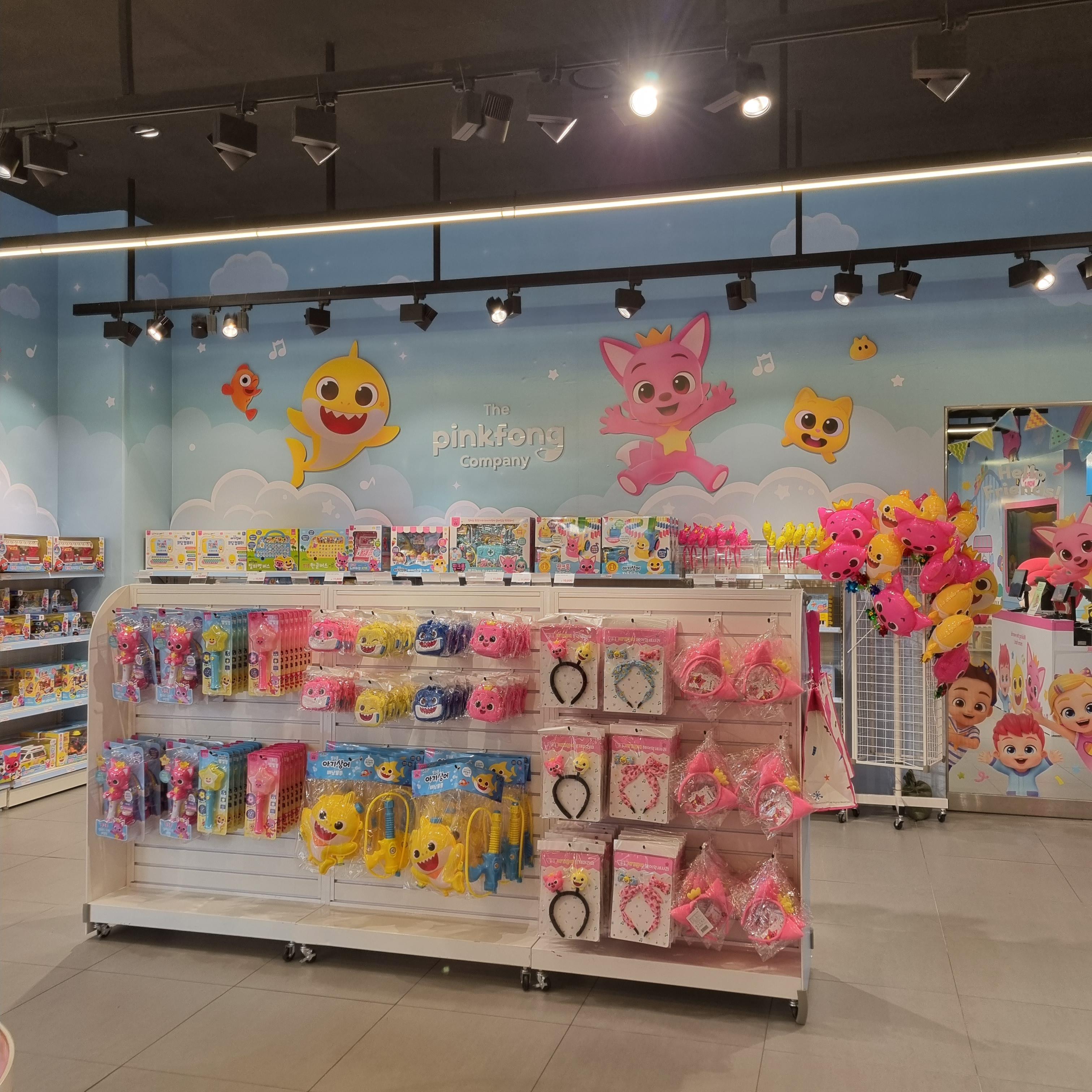 들어와서 왼쪽엔 핑크퐁 물건을 팔아요. 스티커, 가방, 트럭부터 골프게임, 사운드북, 풍선머리띠, 알파벳/한글 버스, 쿠션, 풍선, 인형, 주스부터 솜사탕 등 뭐가 많아요.