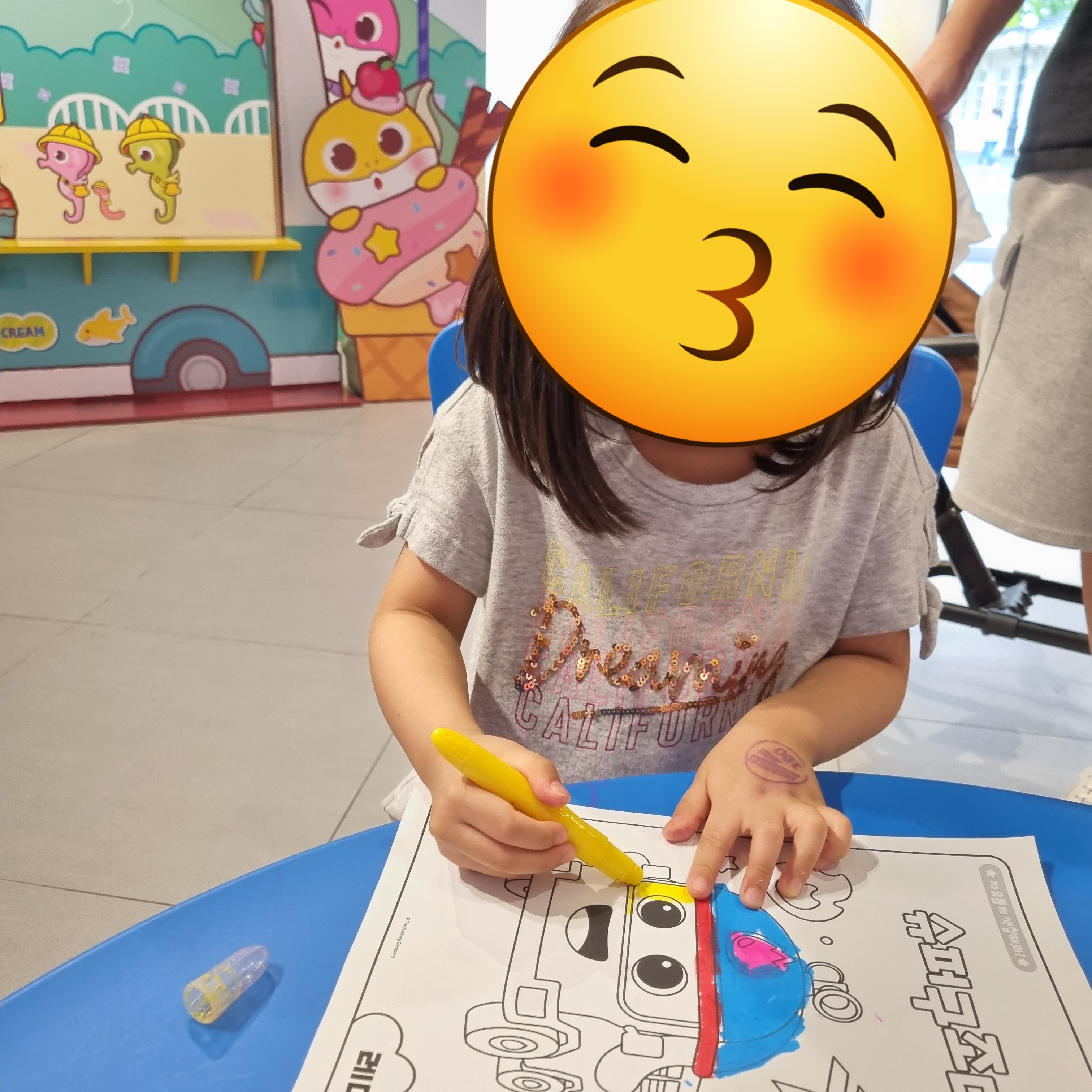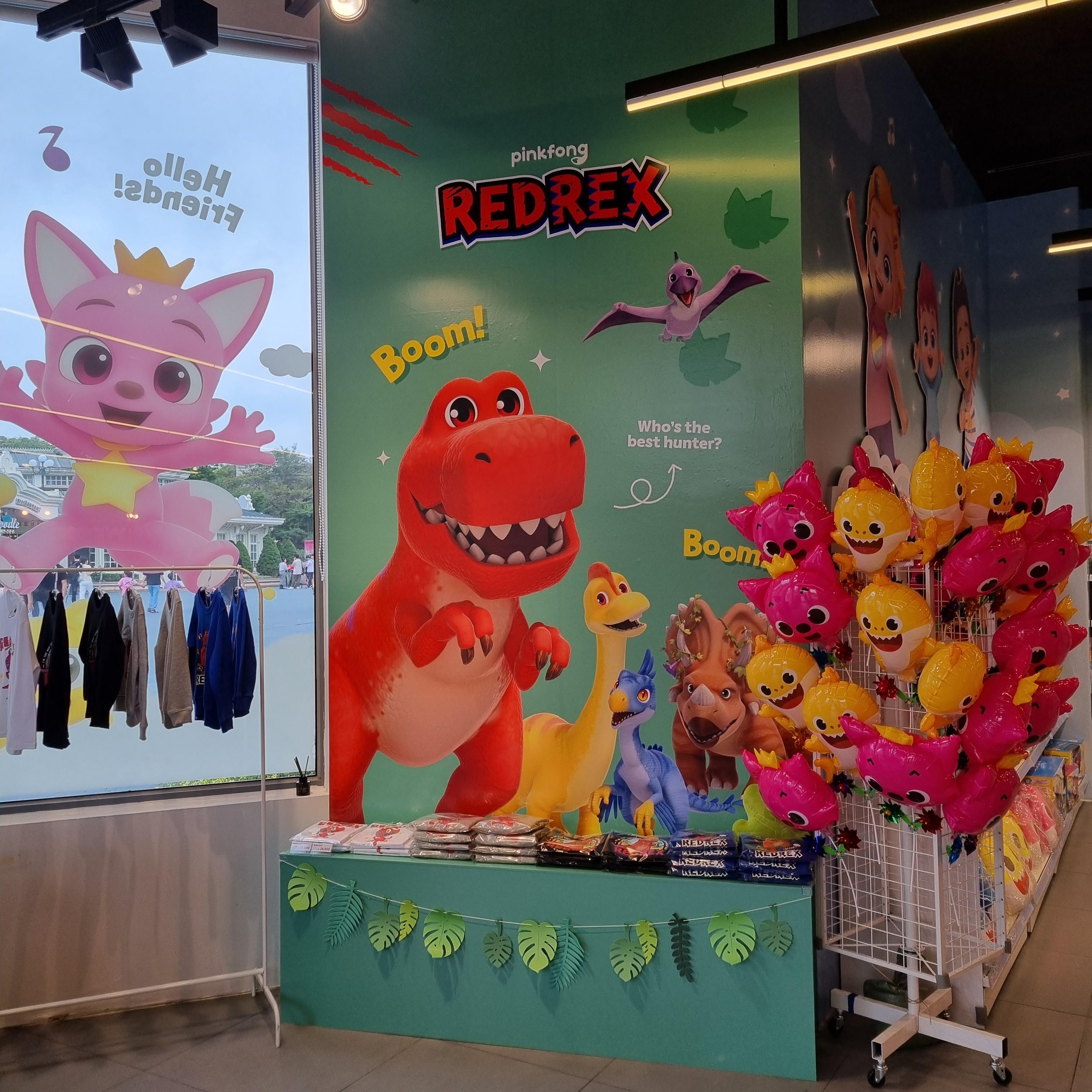 들어와서 왼쪽엔 핑크퐁 물건을 팔아요. 스티커, 가방, 트럭부터 골프게임, 사운드북, 풍선머리띠, 알파벳/한글 버스, 쿠션, 풍선, 인형, 주스부터 솜사탕 등 뭐가 많아요.