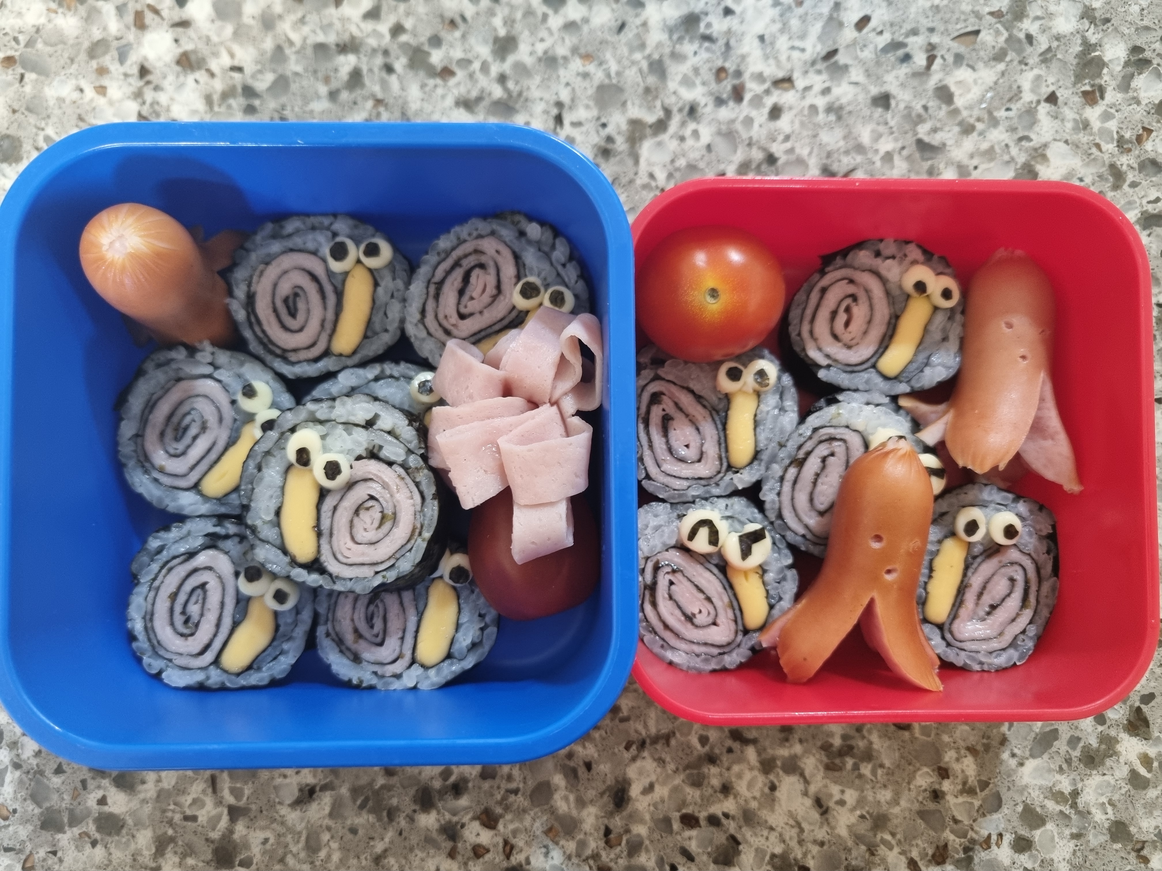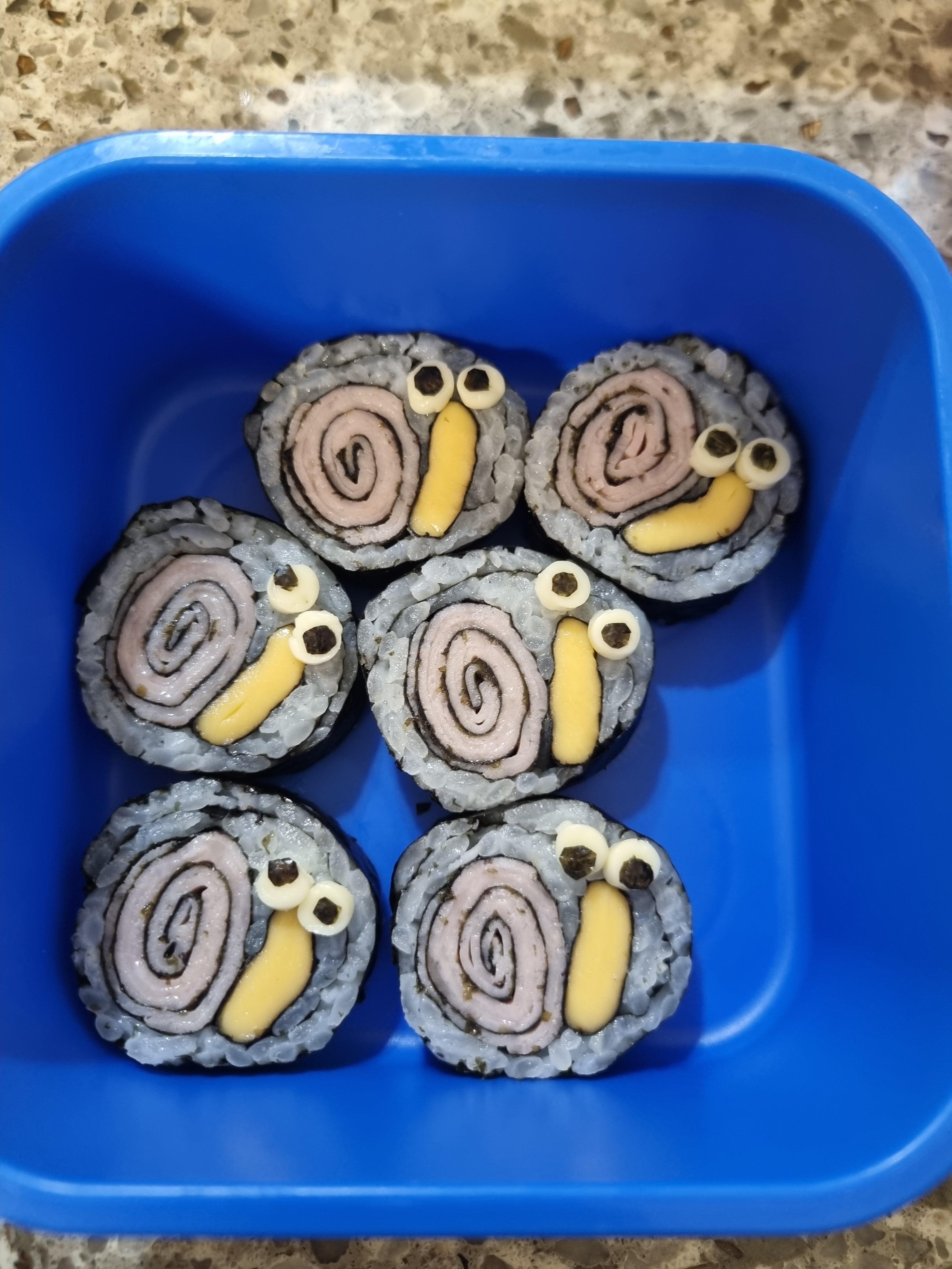 달팽이 눈은 검은깨가 나은 거 같아요. 김펀치를 사다가 활용하셔도 되지만요. 올해는 문어 소시지도 제가 안 하고 오아시스에서 문어 소시지를 샀어요. 끓는 물에 삶기만 해도 문어다리와 눈이 생기니 편하더군요.