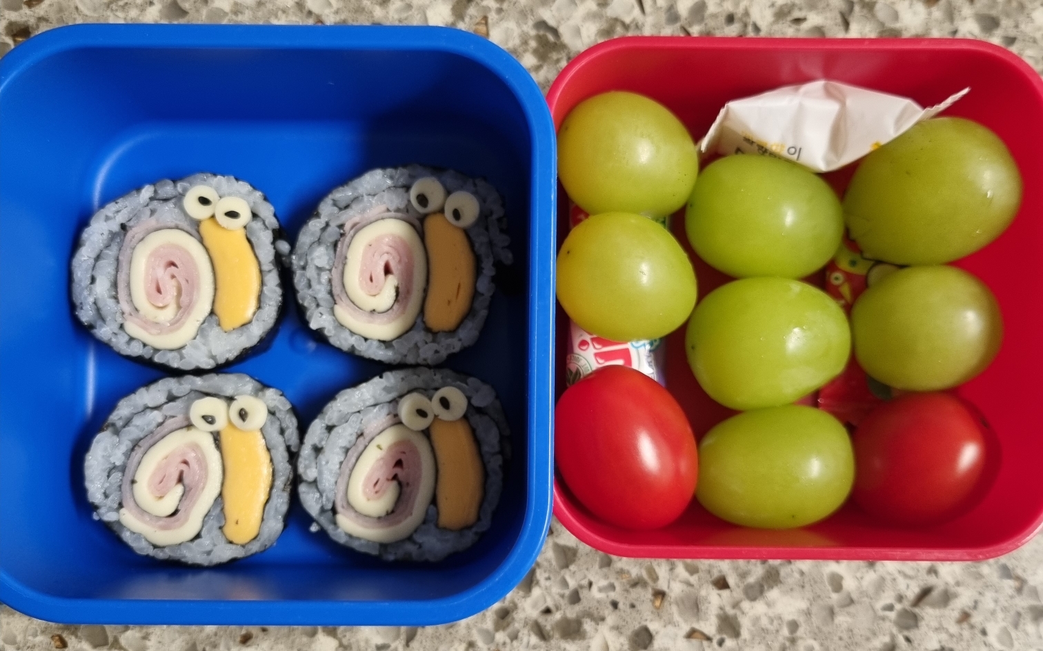작년 봄 사진은 못 찾았는데 가을엔 과일, 캔디류와 함께 달팽이 김밥을 보냈네요. 소박한 듯 하지만 아이가 기뻐하니 즐겁더라고요. 달팽이 김밥을 넣고 남은  빈 공간엔 하트 계란말이, 너겟, 햄꽃도 넣어보았어요.
