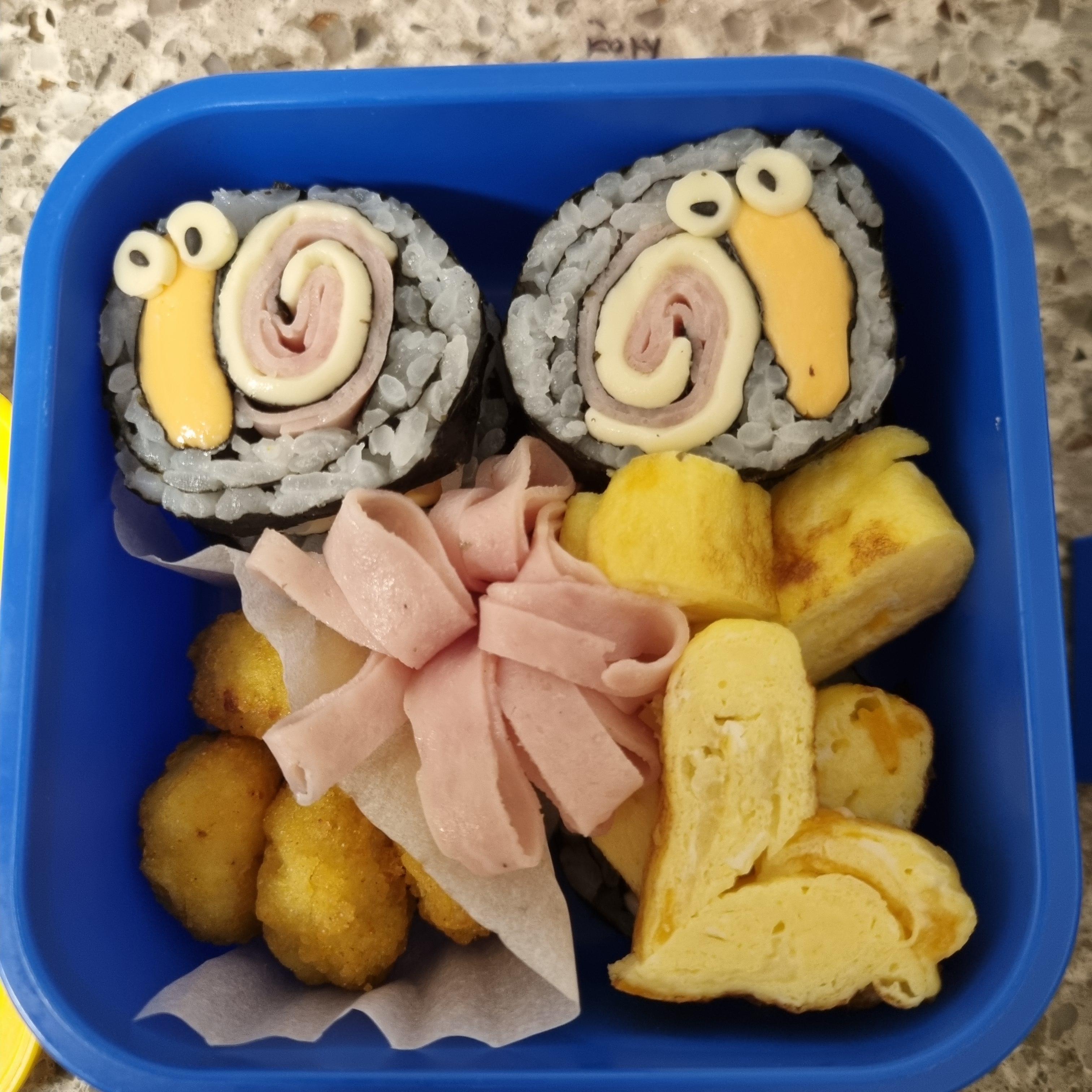 기온에 영향받지 않아 상하지 않을 도시락으로 고민해 보았어요. 아이는 치즈를 좋아하니 치즈가 들어간 달팽이 김밥이 제격이었어요. 달팽이 김밥의 주재료는 햄이랑 치즈로 야채는 없지만 한 끼쯤은 괜찮을 거 같았지요.