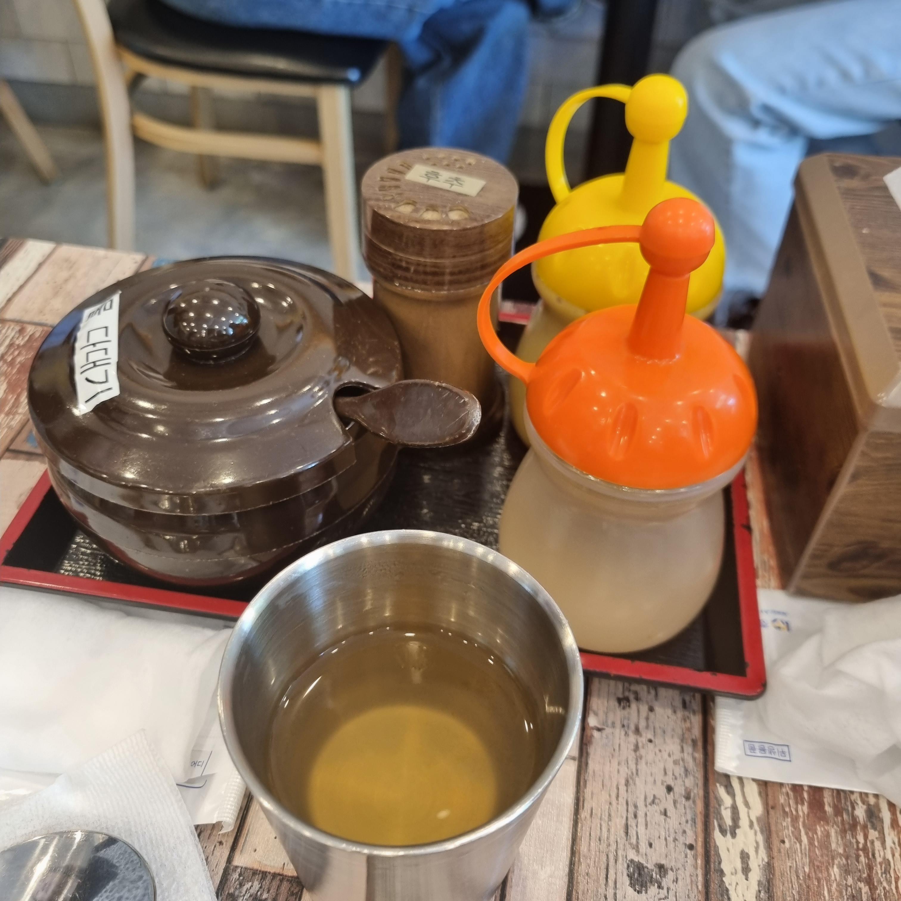 온육수는 셀프입니다. 온육수 여러 잔을 떠가기 편하게 작은 쟁반도 준비되어 있습니다. 온육수는 마음껏 마실 수 있습니다. 따뜻하고 깔끔하니 맛있습니다. 온육수 맛을 보니 밀면이 더 기대됩니다.