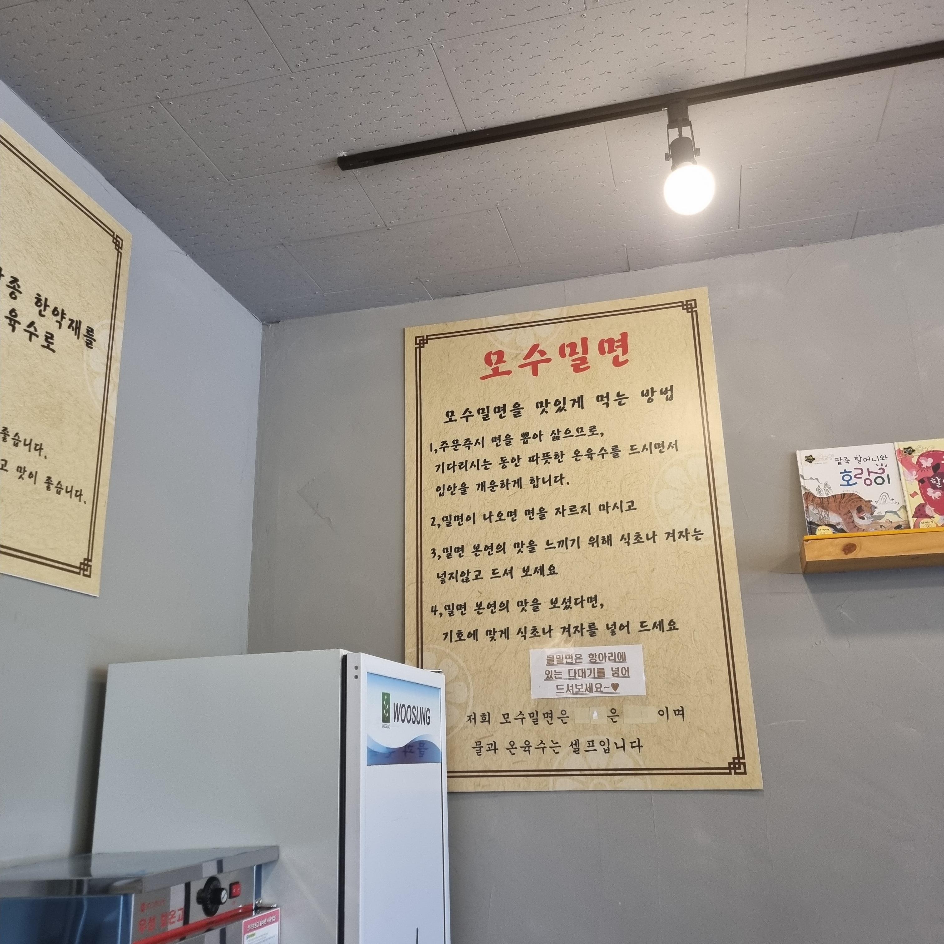 음식을 주문하고 벽면에 붙어 있는 안내글에 시선이 갑니다. 모수밀면 맛있게 먹는 방법을 읽어봅니다. 주문 즉시 면을 뽑기 때문에 대기 시간이 발생하니 따뜻한 온육수를 마시며 기다리라는 안내가 있습니다. 그렇다면 온육수를 떠 와 봅니다.