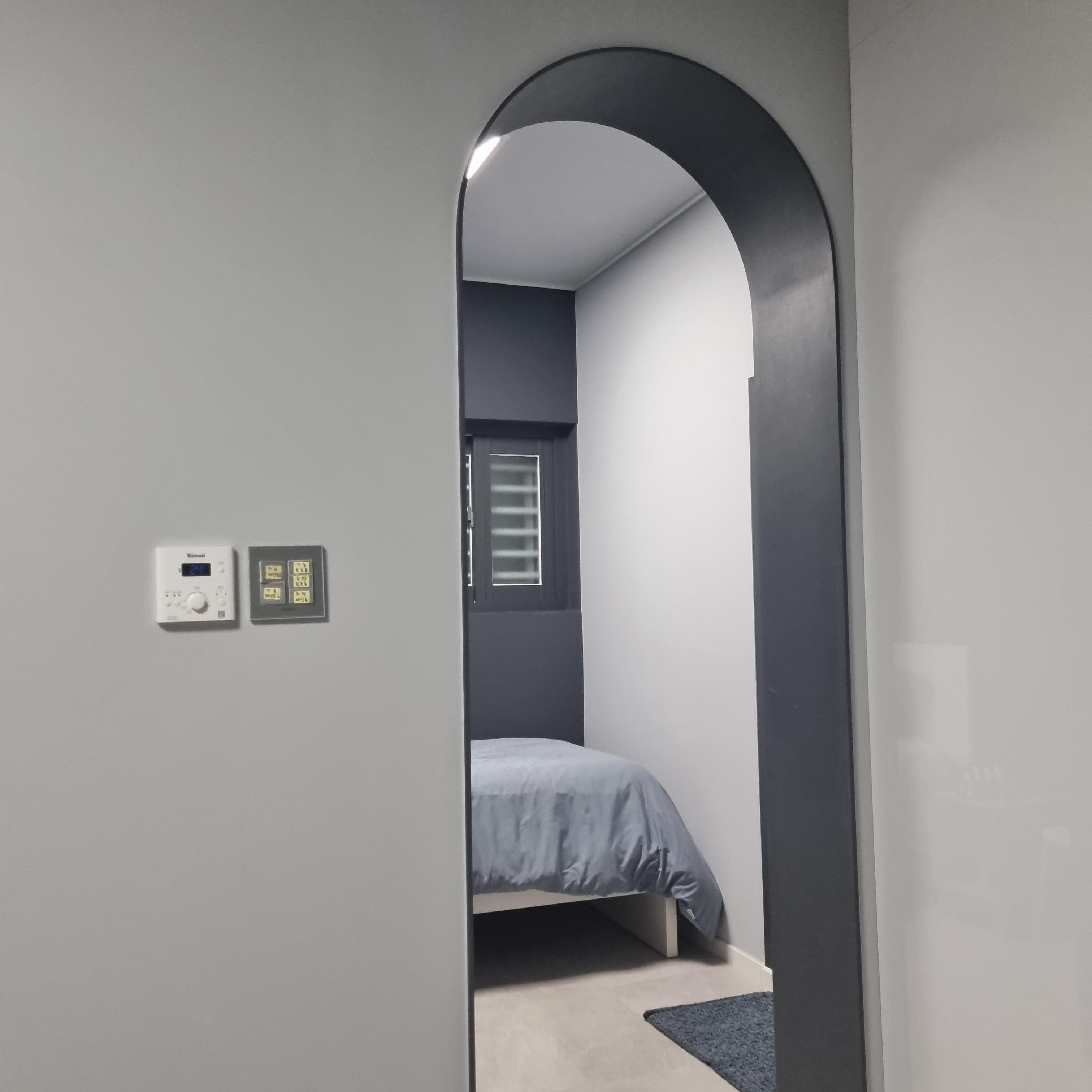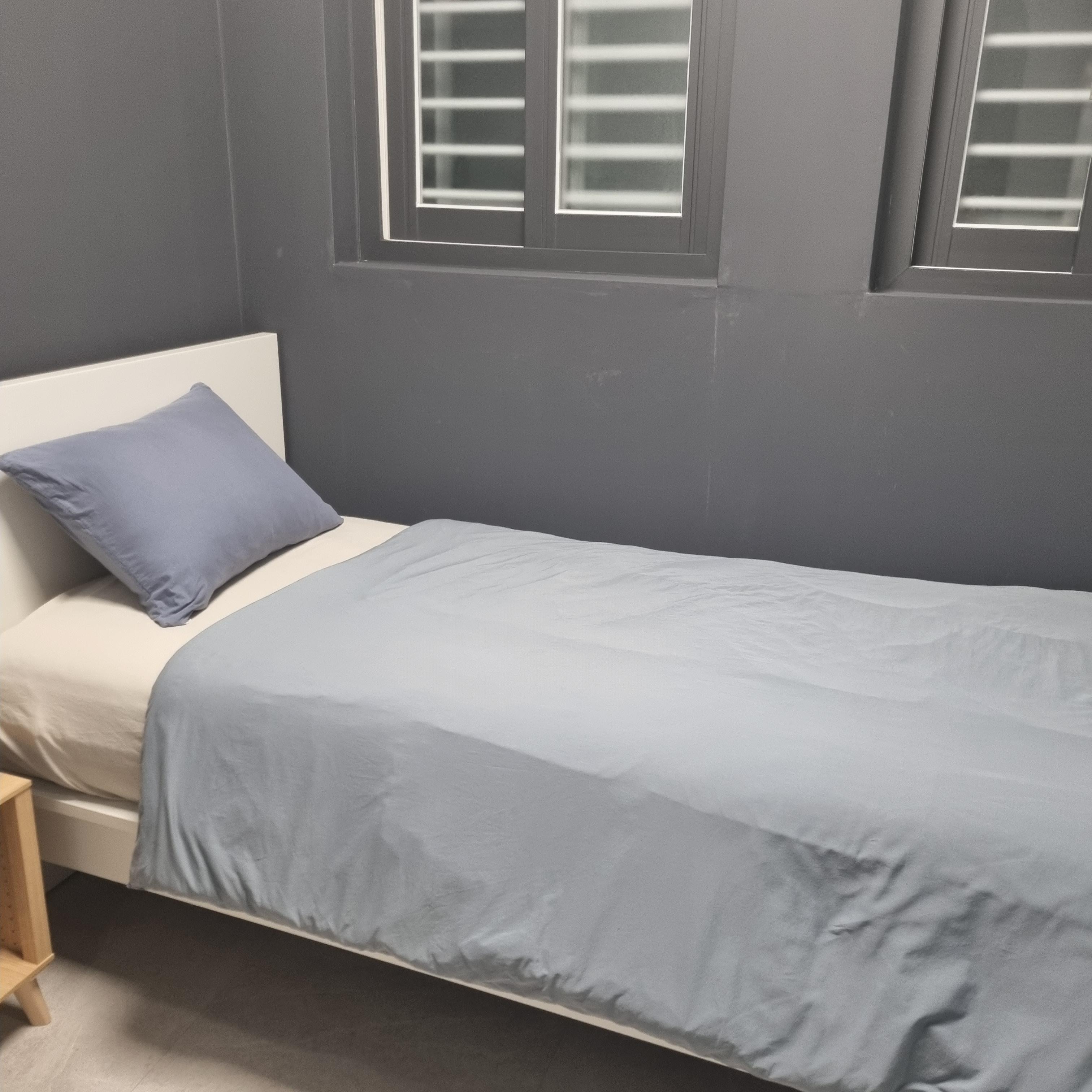 이제 침실을 알아봐야합니다. 침실은 TV가 있는 벽면 옆에 사진과 같이 아치형 문으로 공간을 나누어 두었습니다. 거실에서 들어가면 정면에 1인용 침대가 놓였습니다. 매트리스나 침구가 모두 새것이었습니다. 베개는 솜이 너무 빵빵해서 베고 잘 수가 없었습니다. 잠은 편안히 잤습니다만 창가 옆이기 때문에 겨울에는 외풍이 있을지도 모른다는 생각이 들었습니다. 하지만 겨울을 보낸 것이 아니어서 정확하지는 않고 추측입니다.