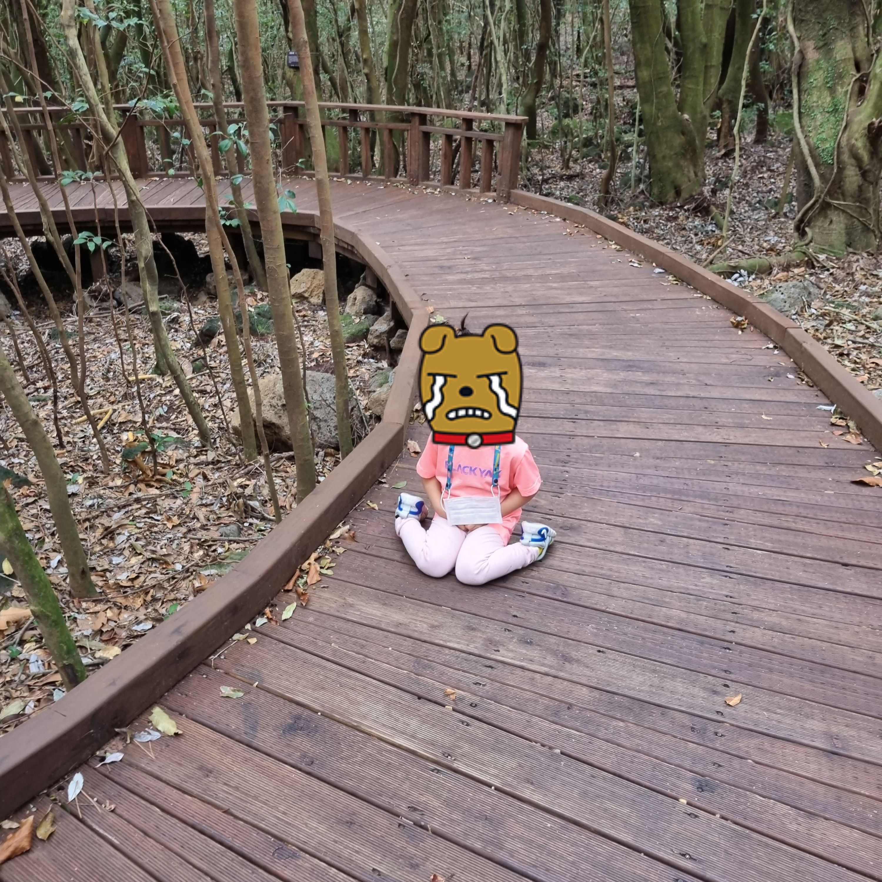 짧은 코스를 선택했음에도 불구하고 숲이 처음인 막내는 숲 힘들었던 모양입니다. 산책로에 주저앉아있는 사진이 남아 있습니다. 재미있는 놀이터에 가보자며 막내를 꼬셔서 함께 함께 걸었는데, 도착해 보니 코로나로 인하여 놀이 공간이 폐쇄되어 있었습니다. 결국 산책 끝날 무렵에는 제가 업고 걸었답니다. 부지런히 아이를 데리고 다녀서 다리 힘을 길러주는 것도 부모의 역할이라는 생각을 했던 것도 같습니다. 등산은 절대 취미가 될 수 없는 제가 아이를 업고 걸을 수 있었다는 건 정말 걷기 좋은 코스로 운영되고 있었다는 뜻이니 아이들과 함께 방문해 보시길 추천합니다.