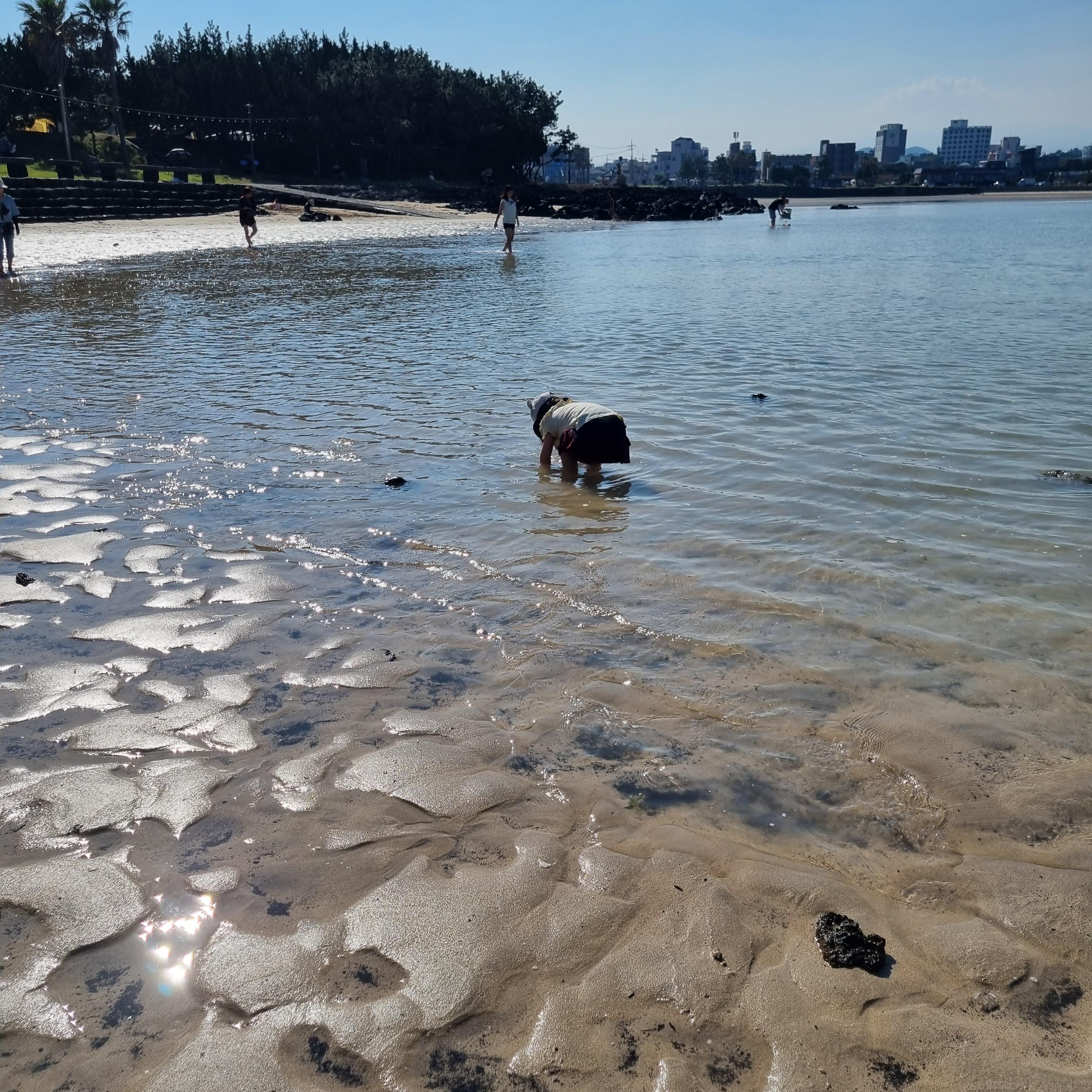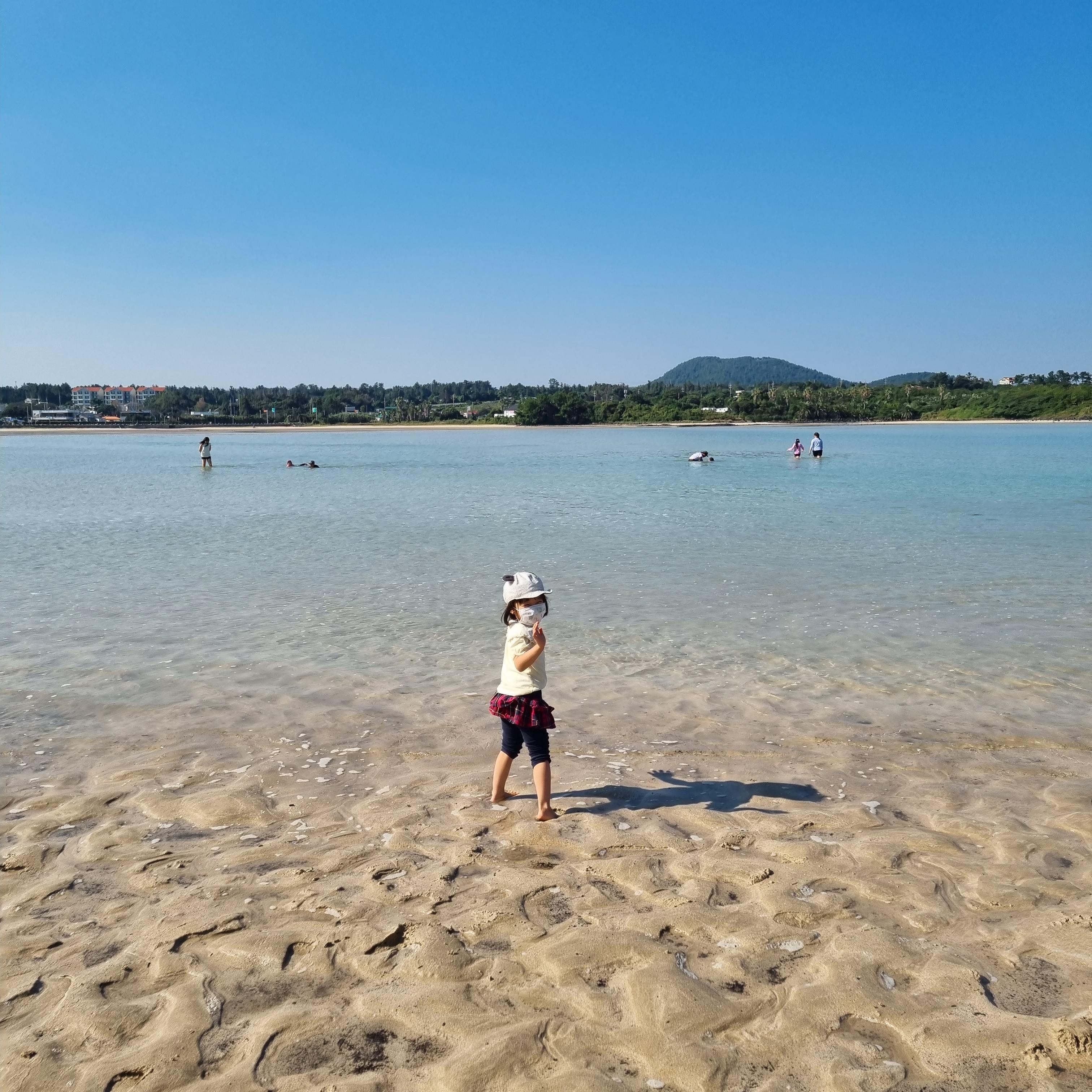 표선해수욕장은 수심이 얕아 아이들이 놀기 좋았습니다. 물이 좀 빠진 시간에 방문한 것 같았는데, 해안가 수심은 아이 발목에서 무릎까지 밖에 되지 않았습니다. 그 덕에 물을 무서워하는 아이도 겁먹지 않고 놀 수 있었답니다. 꽤 멀리 나가서 노는 이들도 간혹 보였는데 성인 허리정도 깊이로 보였습니다.