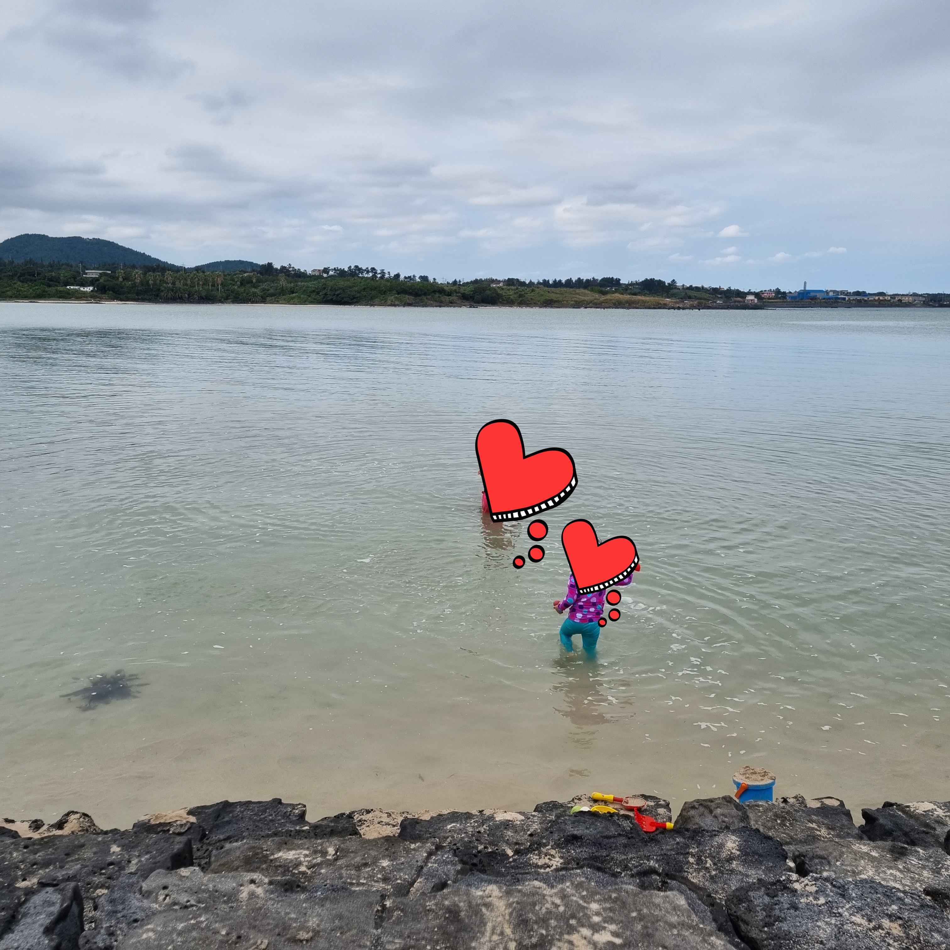표선해수욕장은 제주의 동남쪽에 위치해 있습니다. 동쪽에 위치한 아쿠아플라넷 제주를 관람하고 서귀포로 돌아가는 길에 들릴 수 있었습니다. 바다를 구경할 겸 가벼운 마음으로 찾은 것입니다. 그런데 물을 본 아이는 냉큼 바다로 들어가 버렸습니다. 9월 말에 해수욕장에서 아이가 물놀이를 할 수 있을 것이라는 생각을 못했기 때문에 챙겨 온 여벌옷도, 닦일 수건도 없었는데 말입니다. 자기 또래로 보이는 친구들이 바닷물에 발을 담그고 놀고 있었기 때문에 적당히 놀고 가자는 엄마의 만류는 먹히질 않았던 것 같습니다.