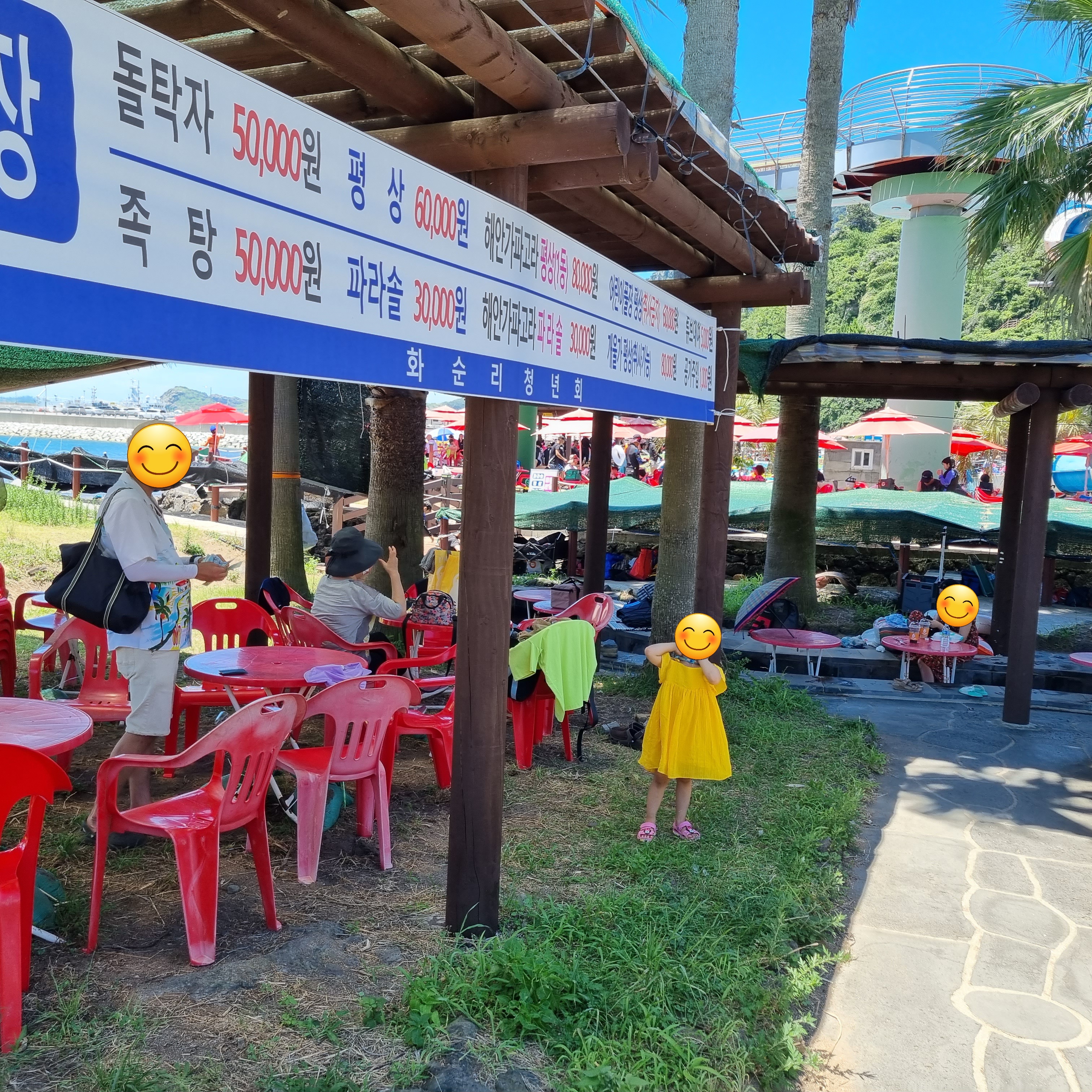 자리 이용료는 사진과 같습니다. 2022년 기준으로 돌탁자 5만 원, 평상 6만 원, 파라솔 3만 원. 수영장 이용료라고 생각하면 그리 비싸다고 느껴지지 않습니다.