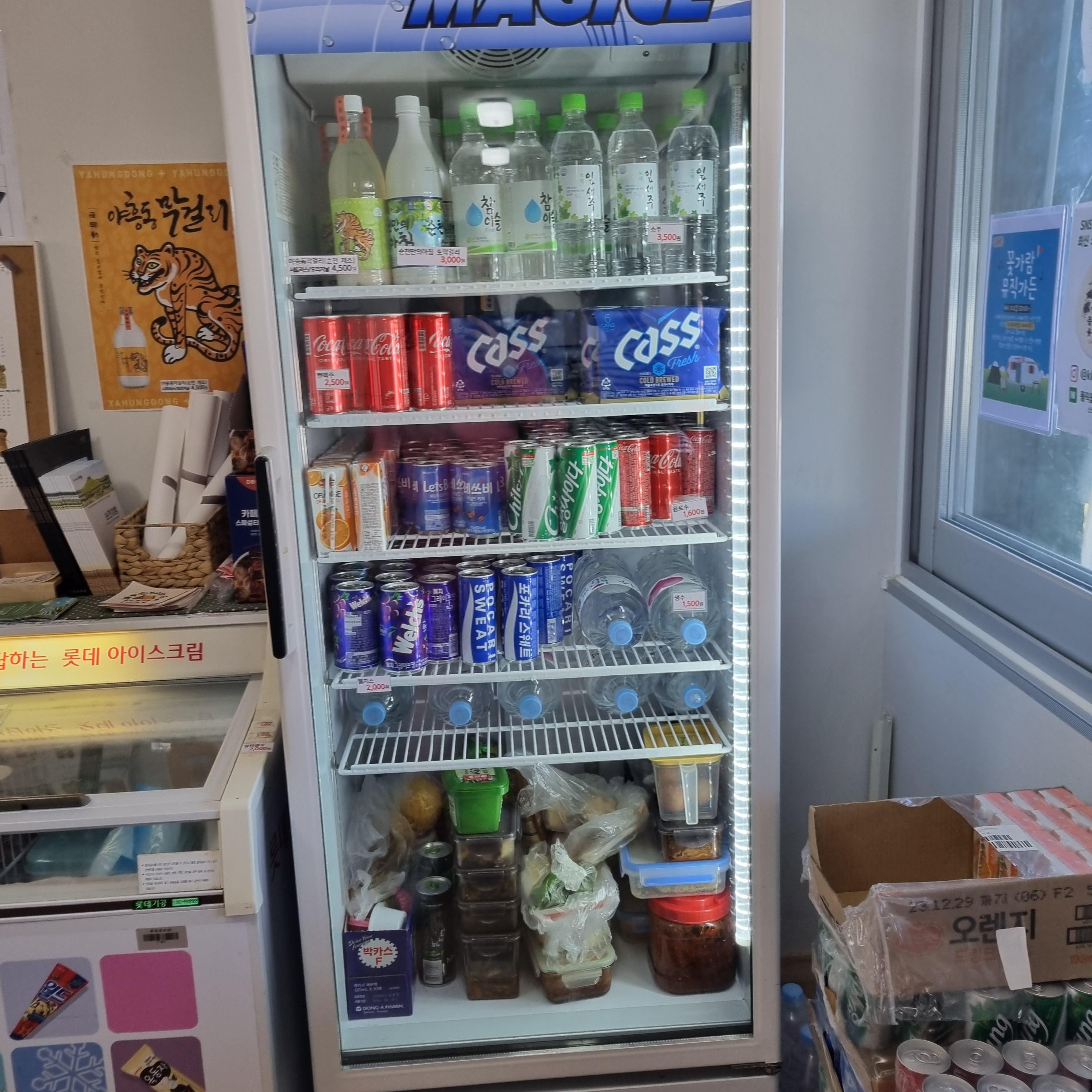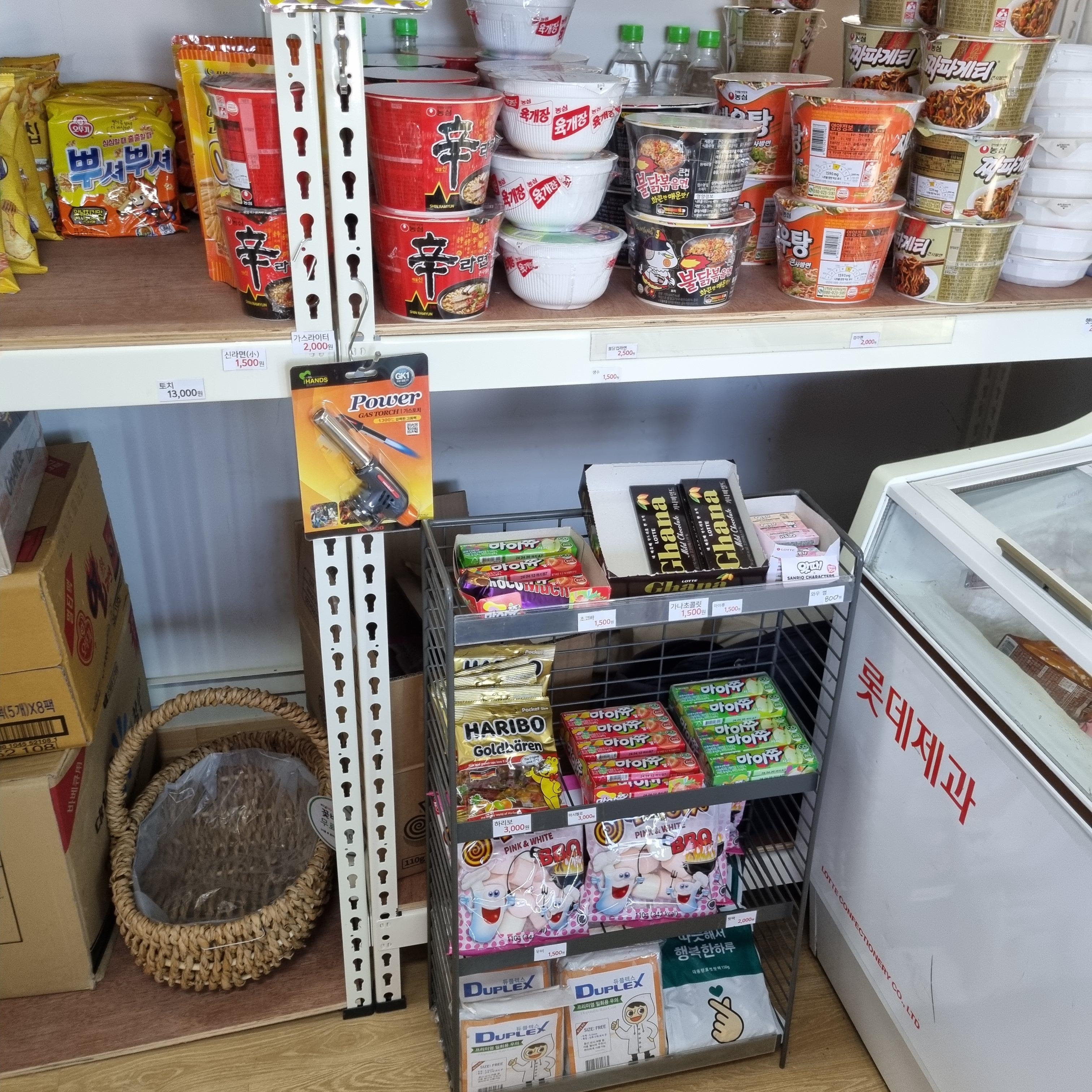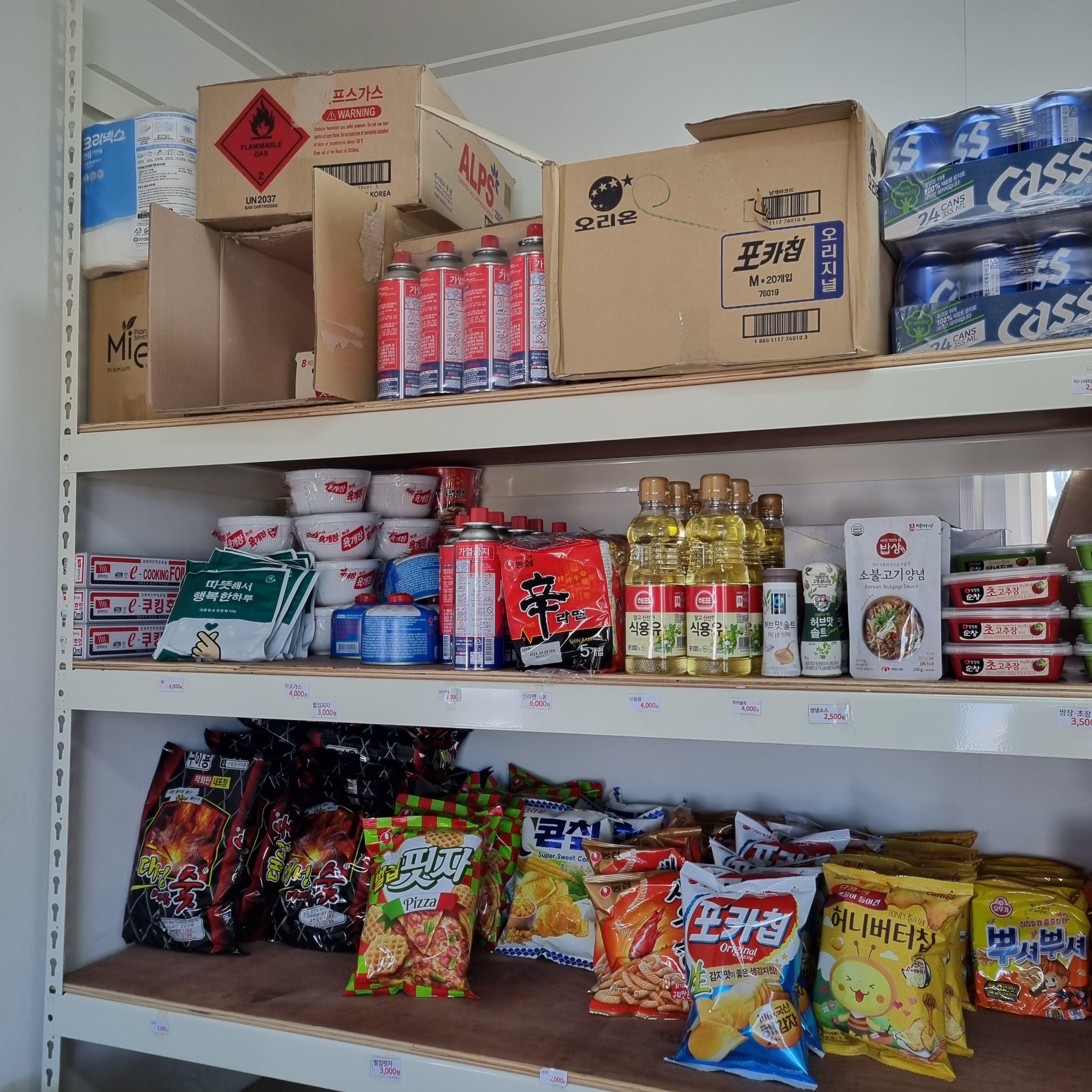캠핑에 필요한 식료품 및 간단한 도구를 팔고 있어요.