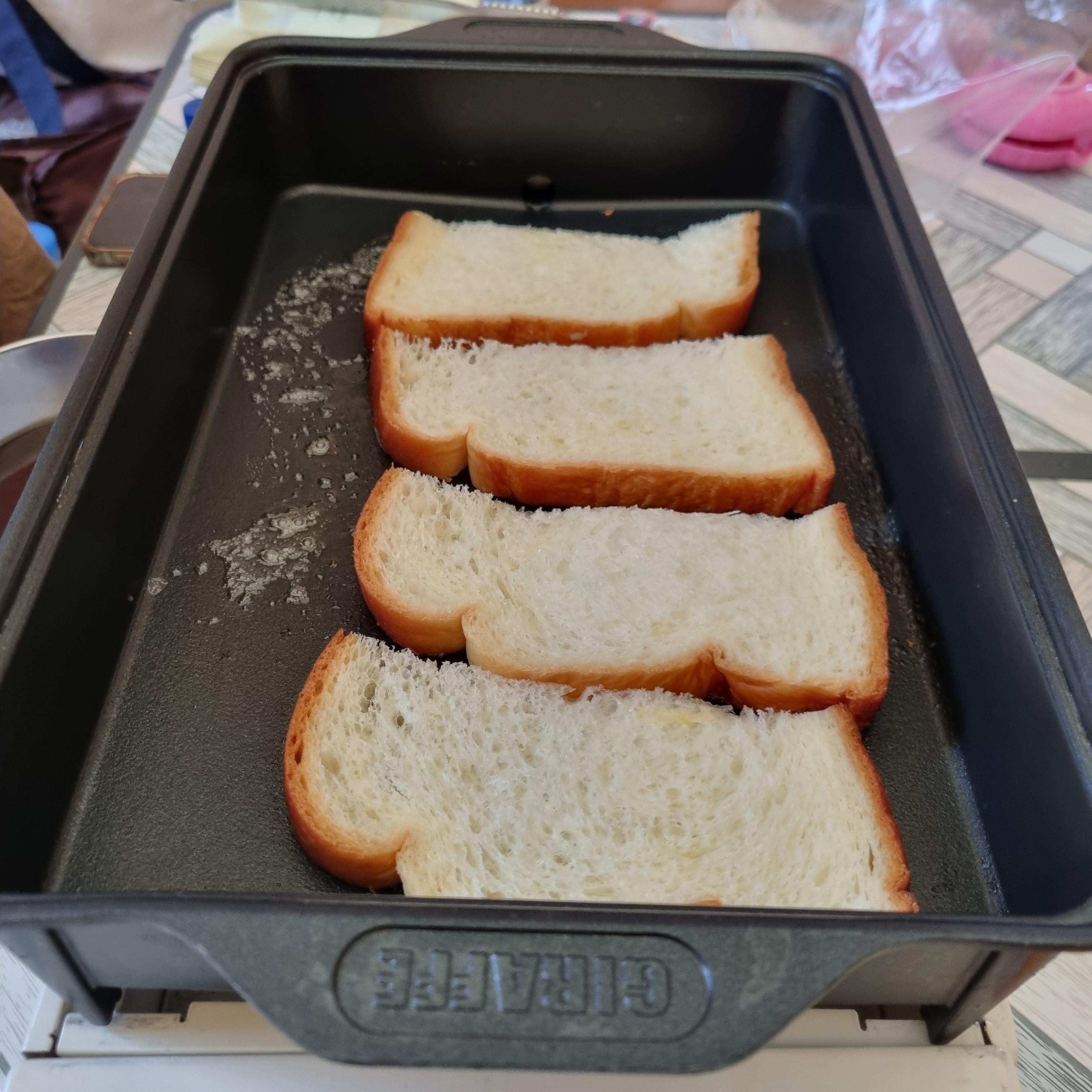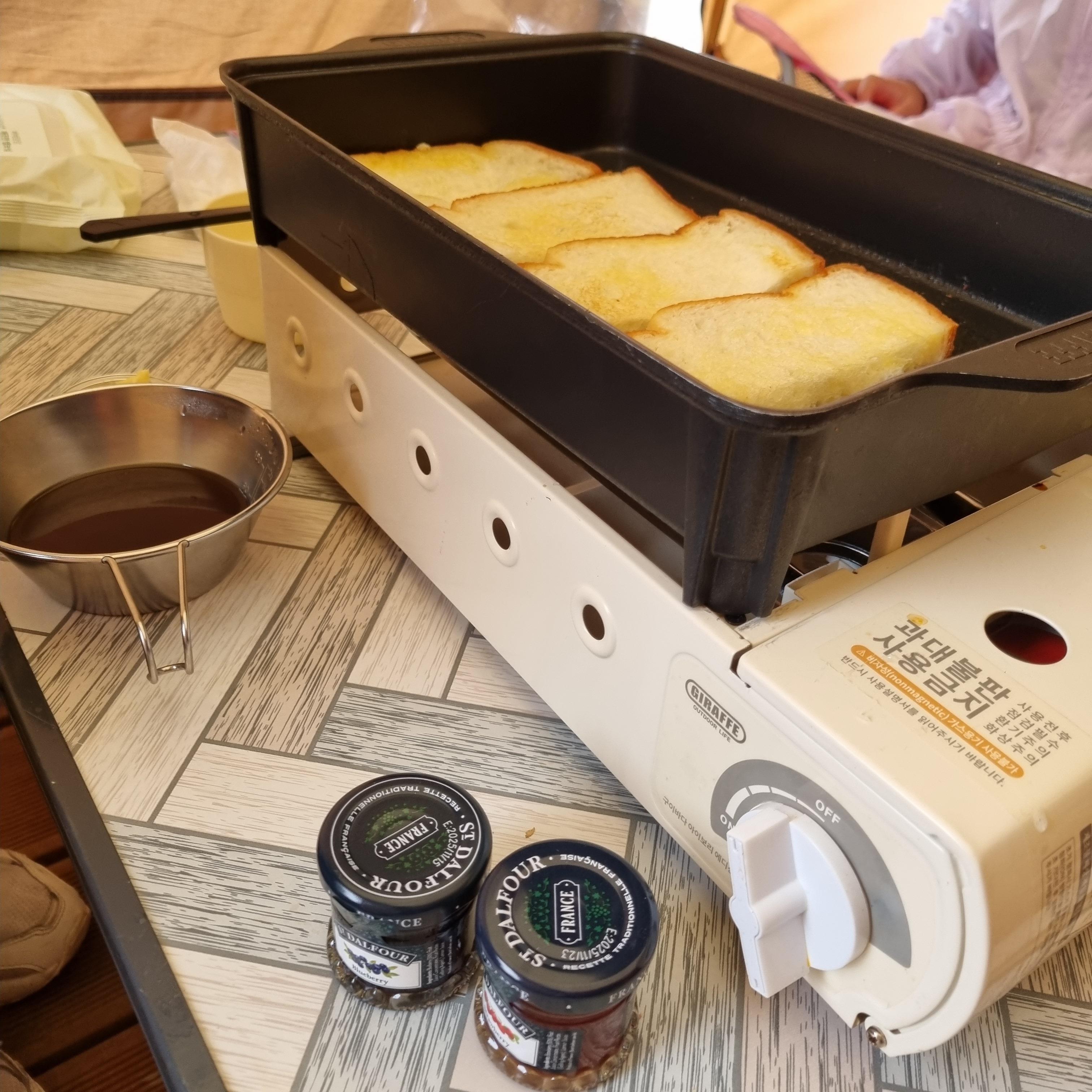 이제 아침입니다. 우유식빵을 버터에 구워줍니다. 잼을 발라 먹어요. 커피도 타서 따뜻하게 한 잔 합니다.