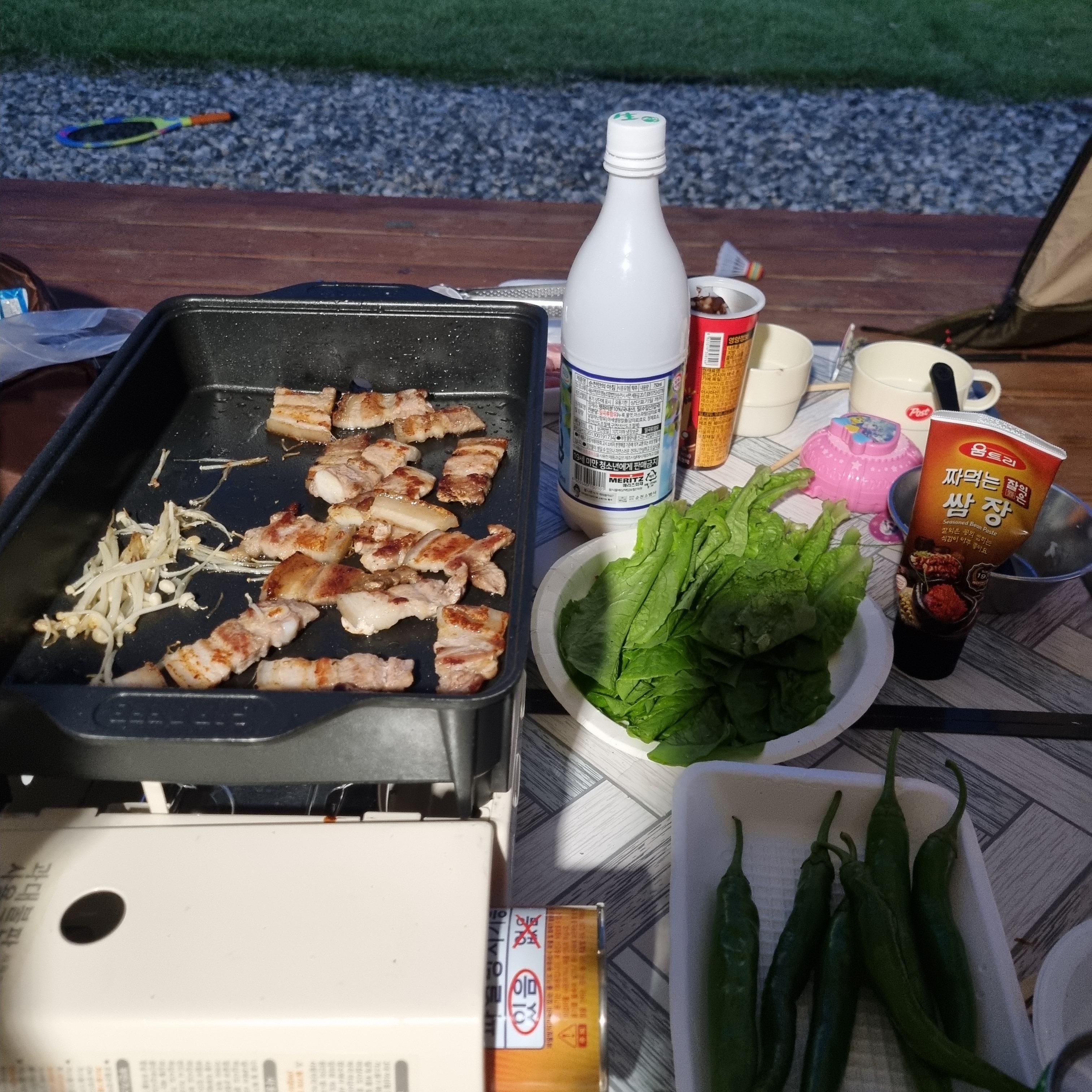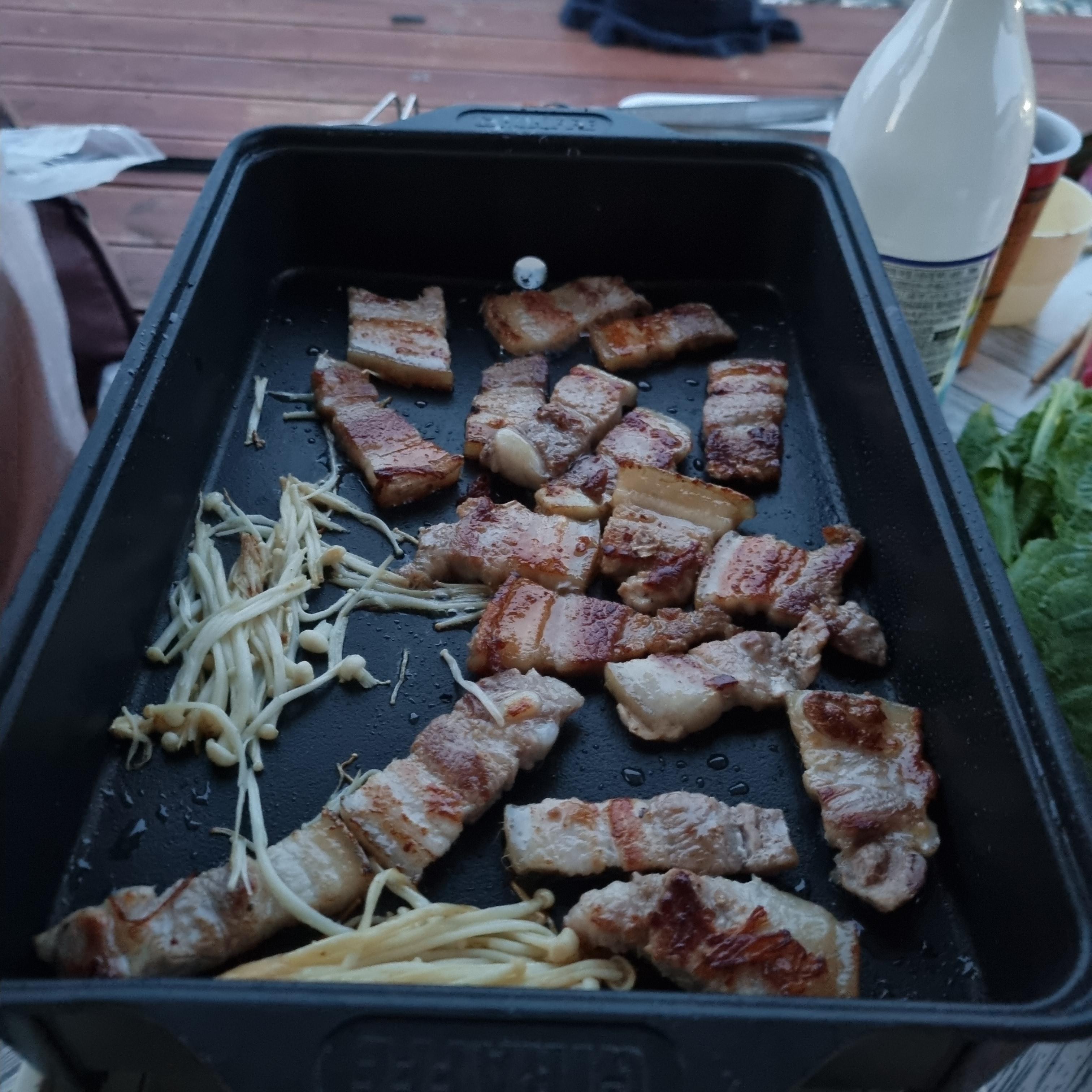 소고기가 끝나고 오겹살 타임입니다. 맛있게 잘 먹었어요. 김치를 두고 와서 아쉬웠지만 고추랑 상추가 빈자리를 대신합니다.