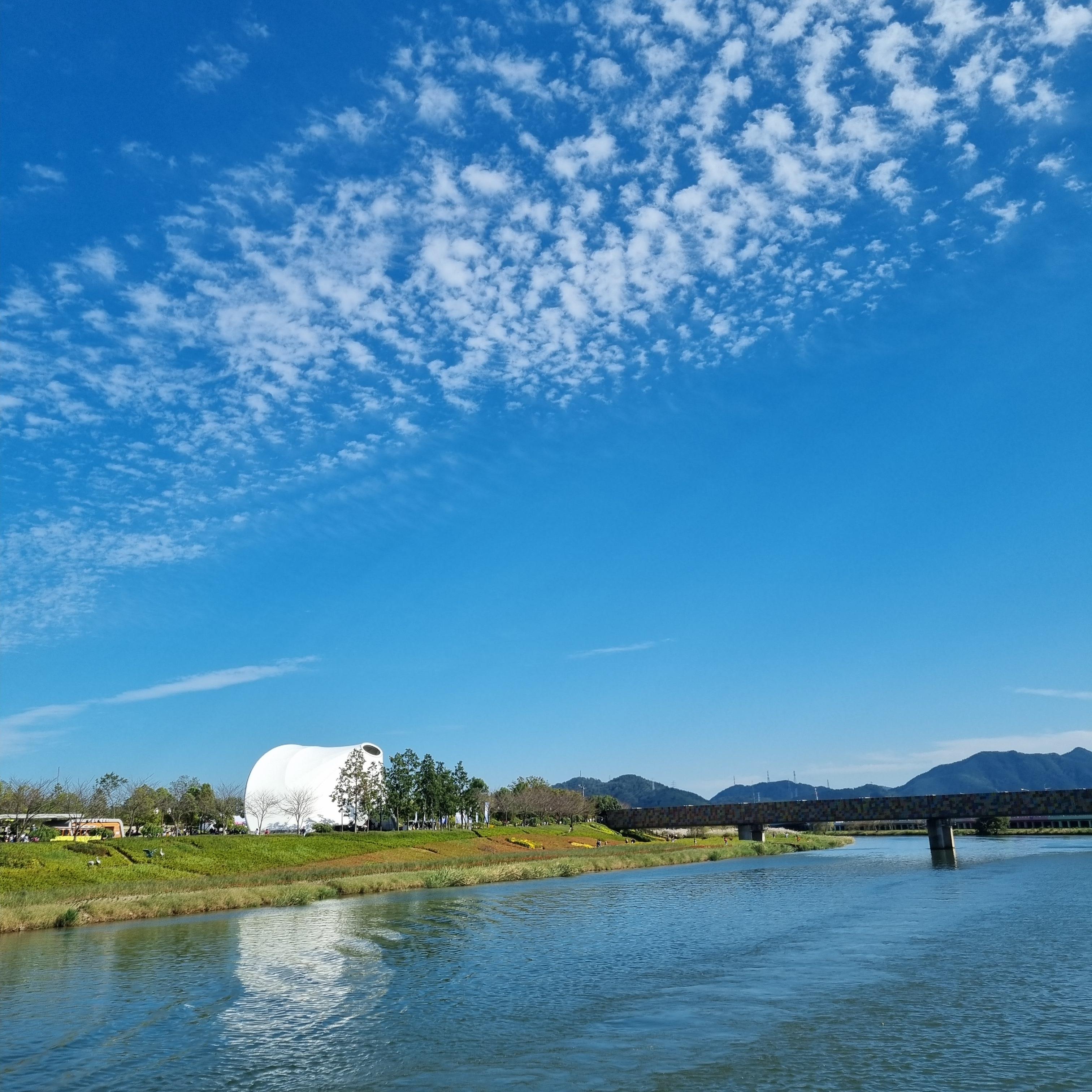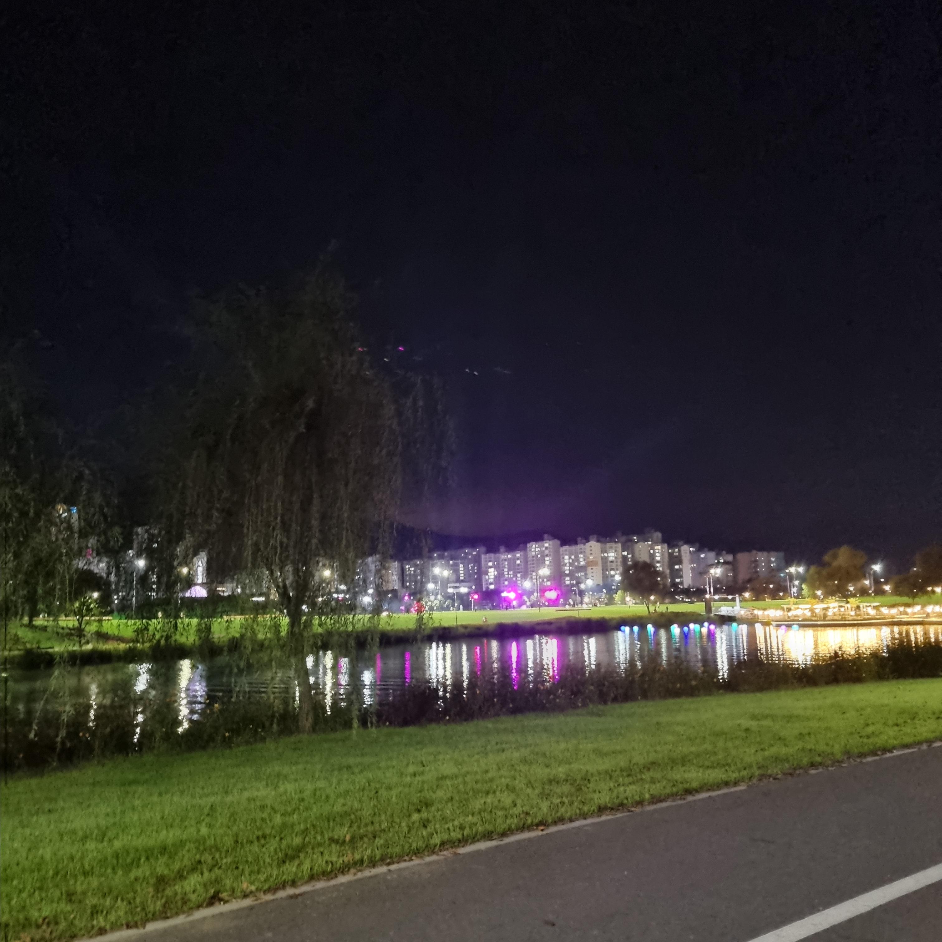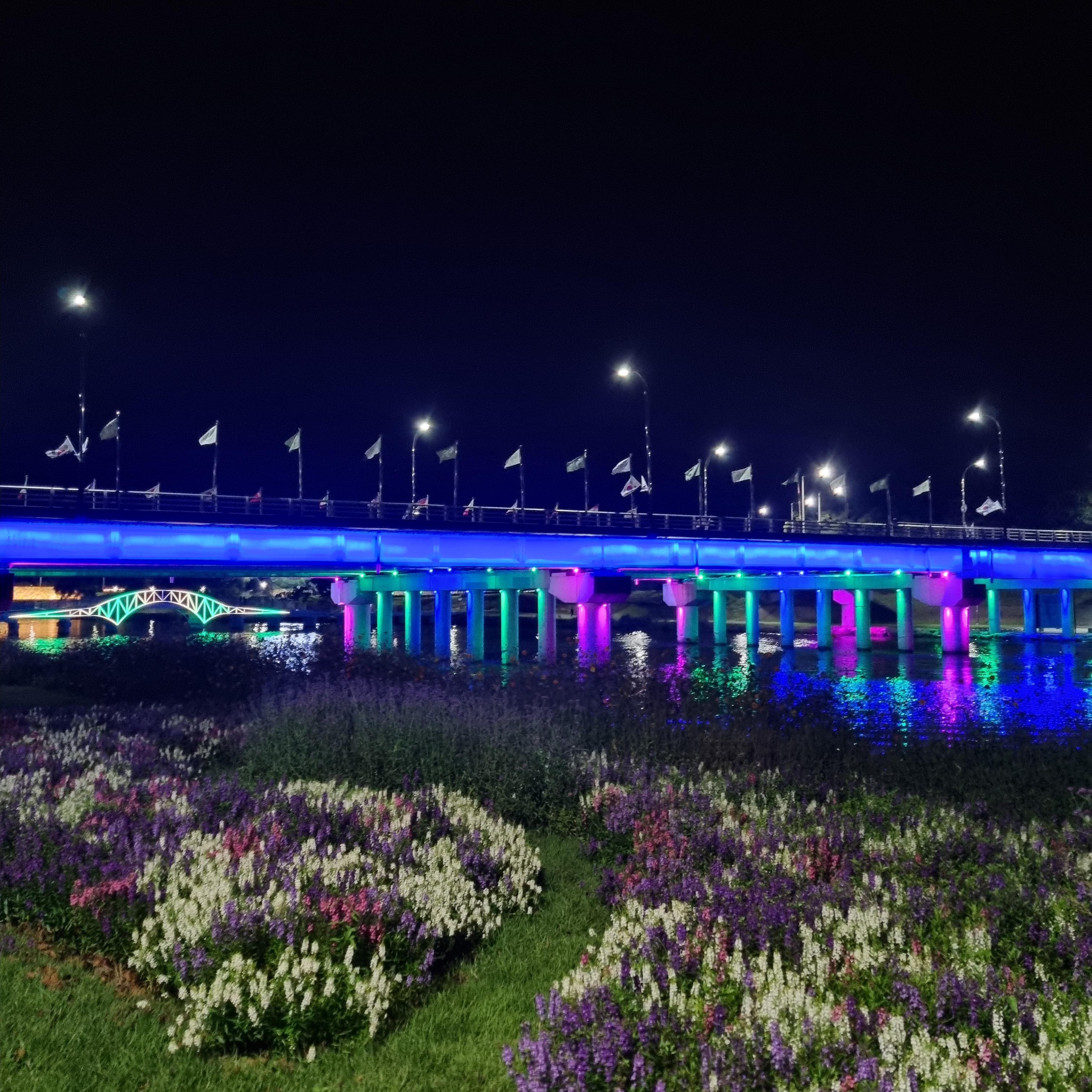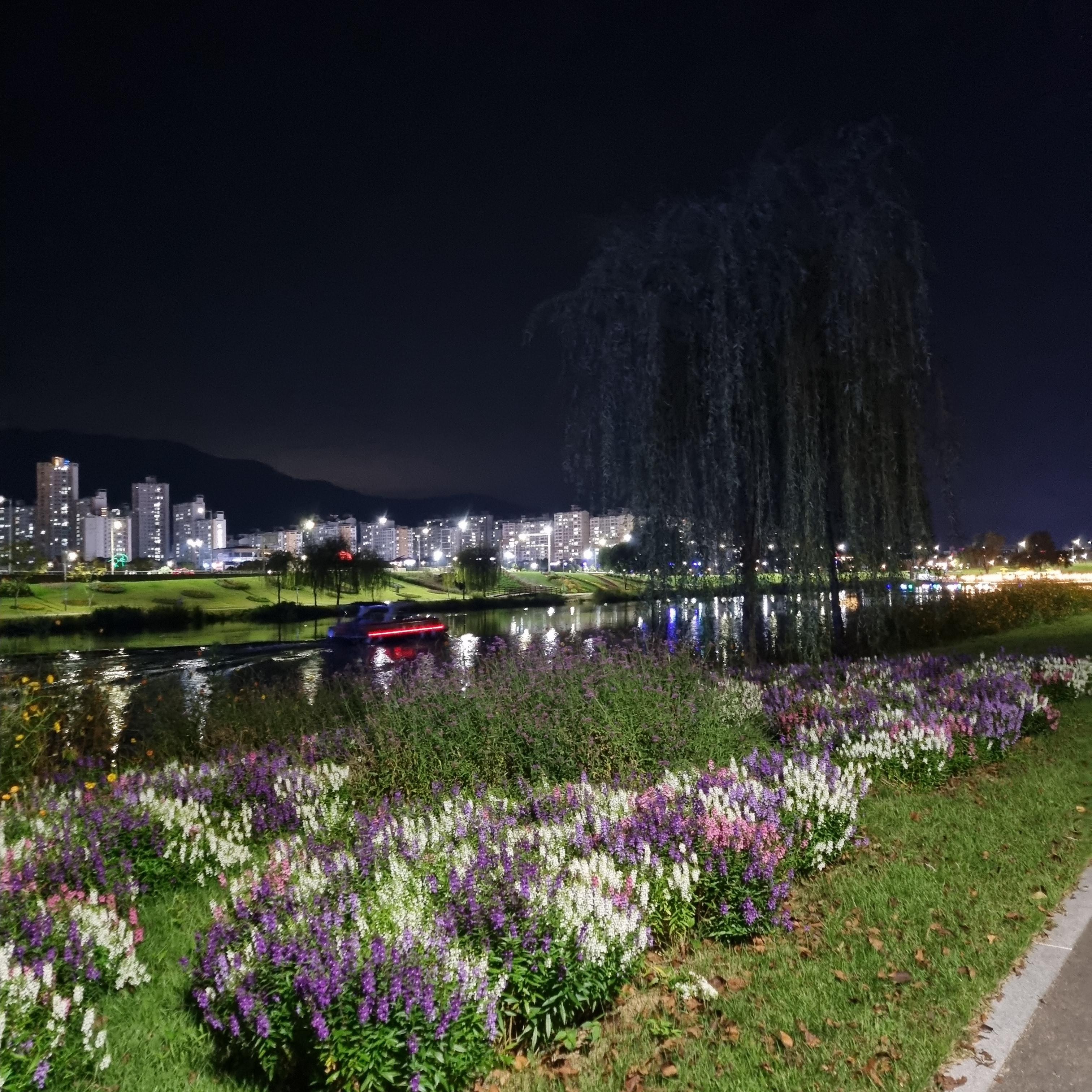 캠핑장을 나와 걷는 중입니다. 콘서트를 하는지 강 건너에서 음악이 들려왔어요.