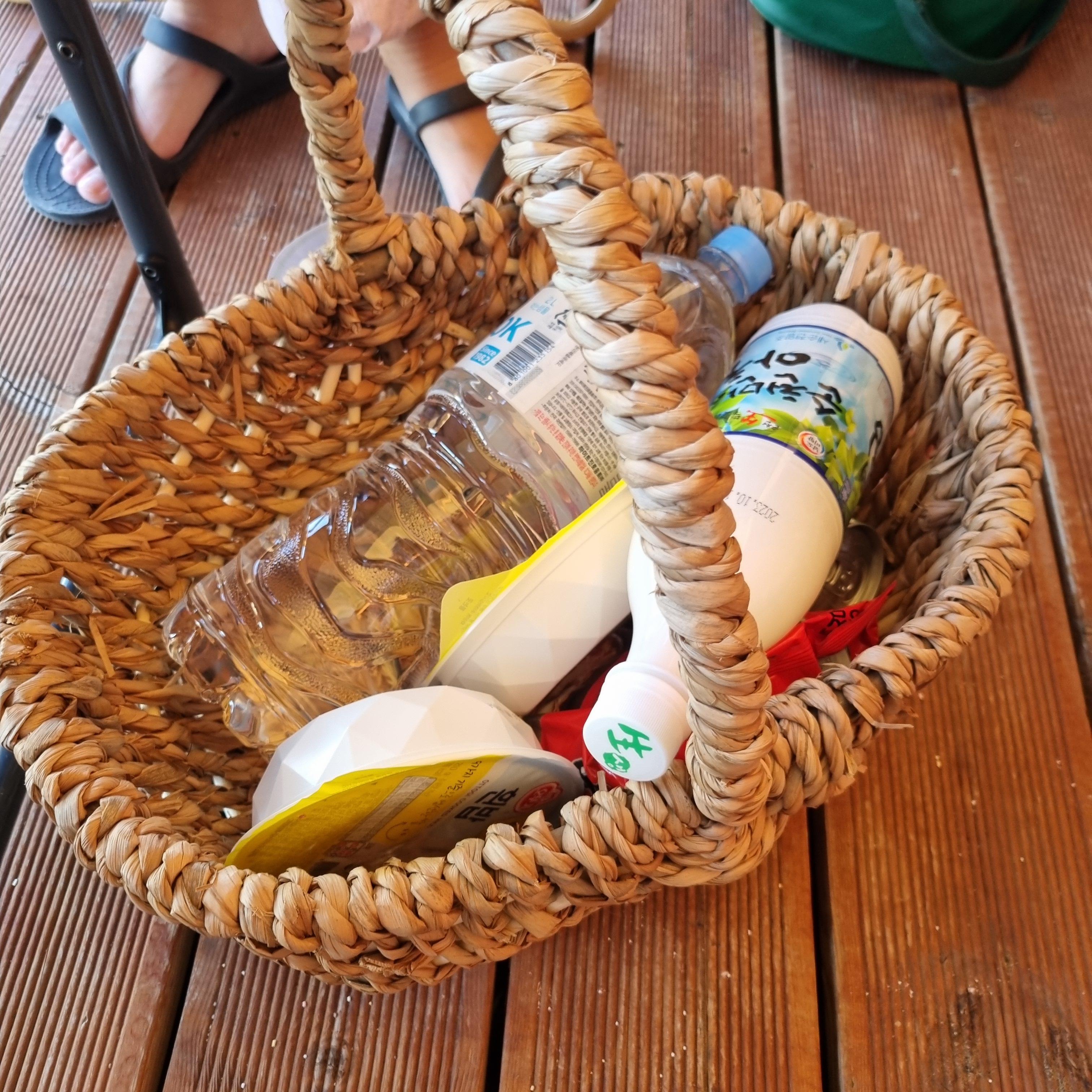 바구니는 비닐봉지 대신 빌려주시더라고요. 물건을 사면 바구니 안에 담아주십니다. 나중에 반납하는 시스템인데 감성 돋고 좋더라고요.
