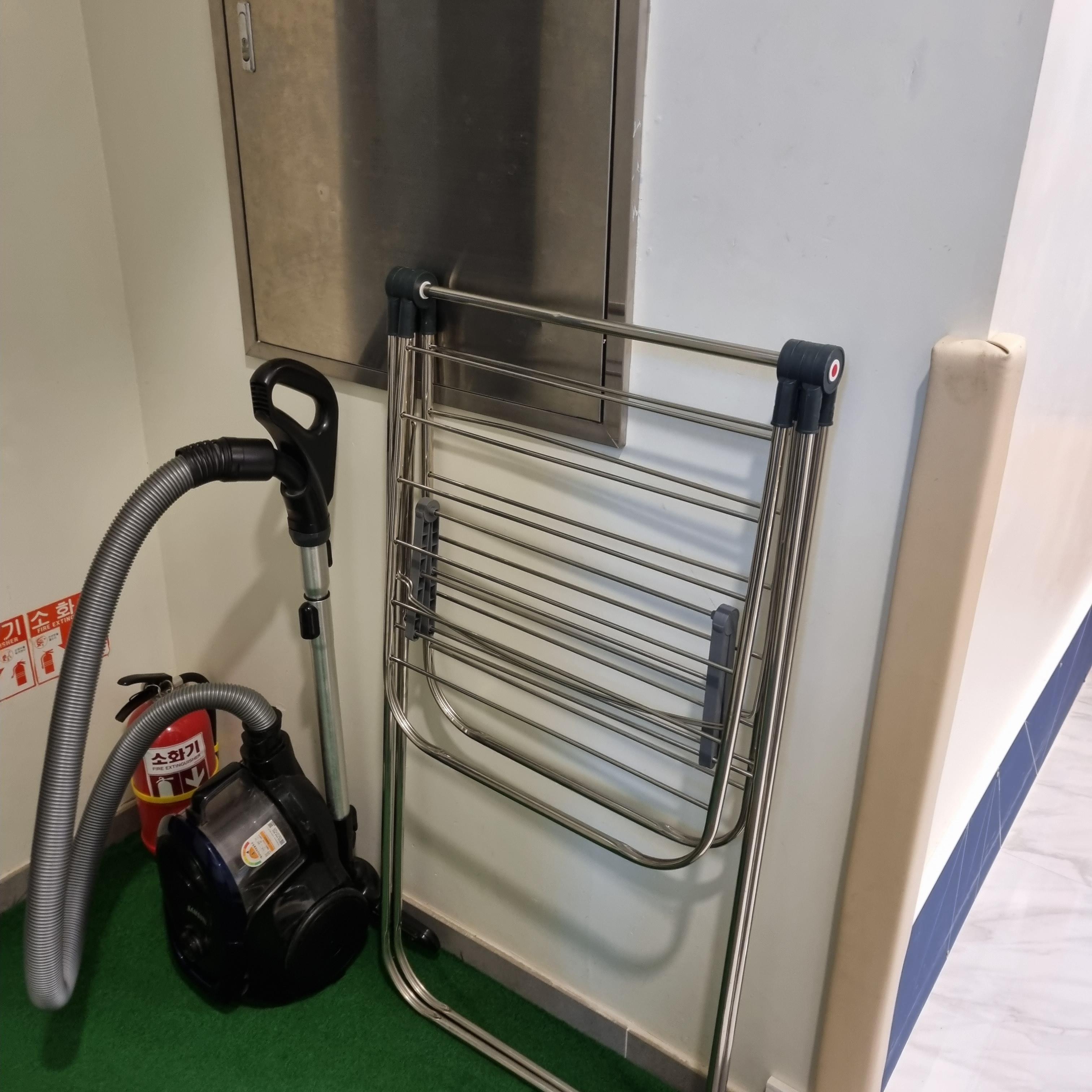 건물 좌측 출입문으로 들어서면 현관에 청소기와 빨래건조대가 있습니다. 정면에는 1층 화장실이 있는데 사진에 보이는 세면대 오른쪽으로 변기가 있습니다. 그리고 화장실 오른쪽에는 2층으로 올라가는 계단이 있습니다. 계단은 모두 쿠션처리 되어 있어서 안전해 보였습니다.