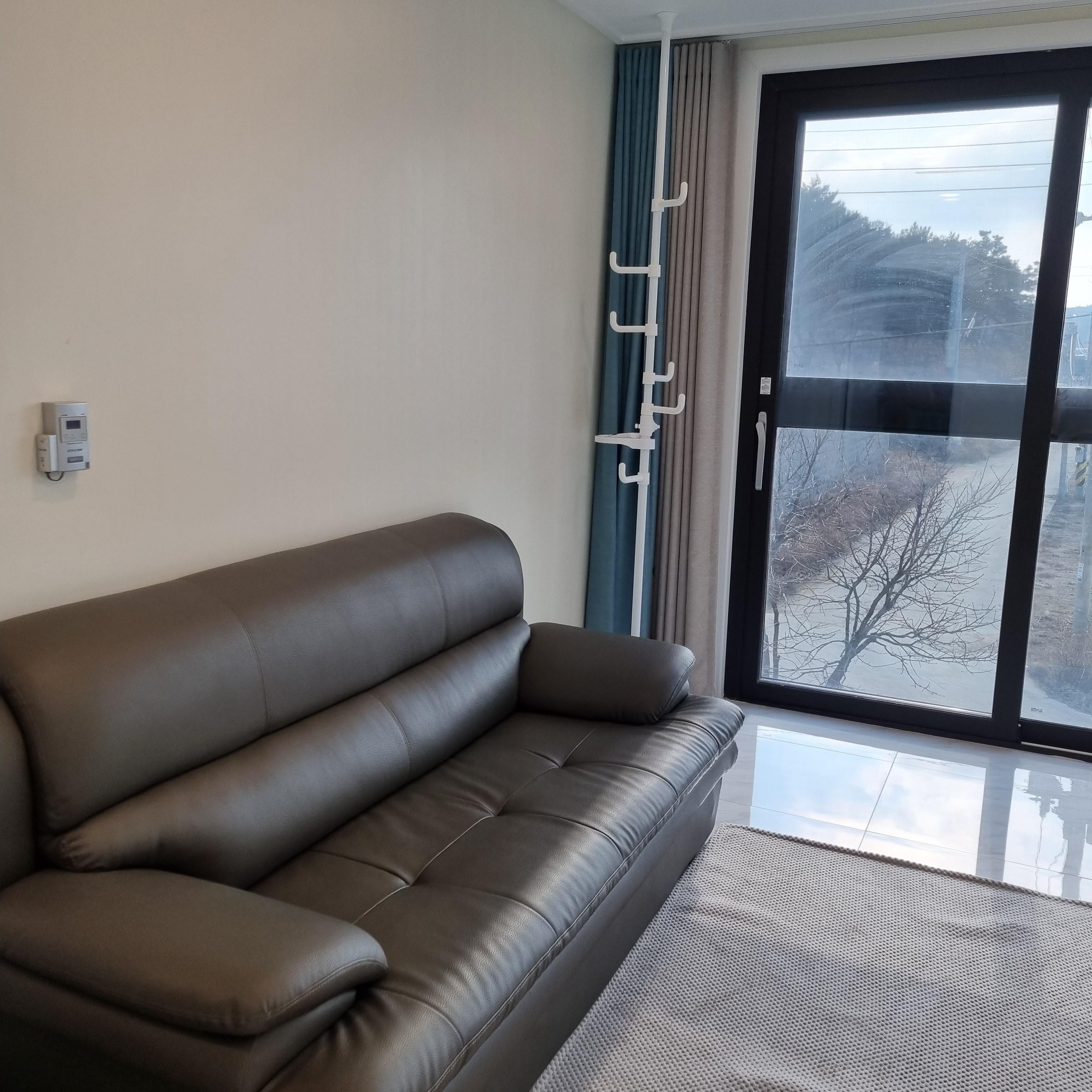 건물 정면에는 식당과 연결되는 큰 창이 베란다 창처럼 있었지만 그쪽으로 출입을 금한다고 하셨습니다. 그래서 건물 현관문으로 출입을 했고, 입실할 때 잠시 차에서 짐을 옮길 때만 식당 앞 창으로 이동시켰답니다. 좌측 문까지는 거리가 꽤 되더라고요.
