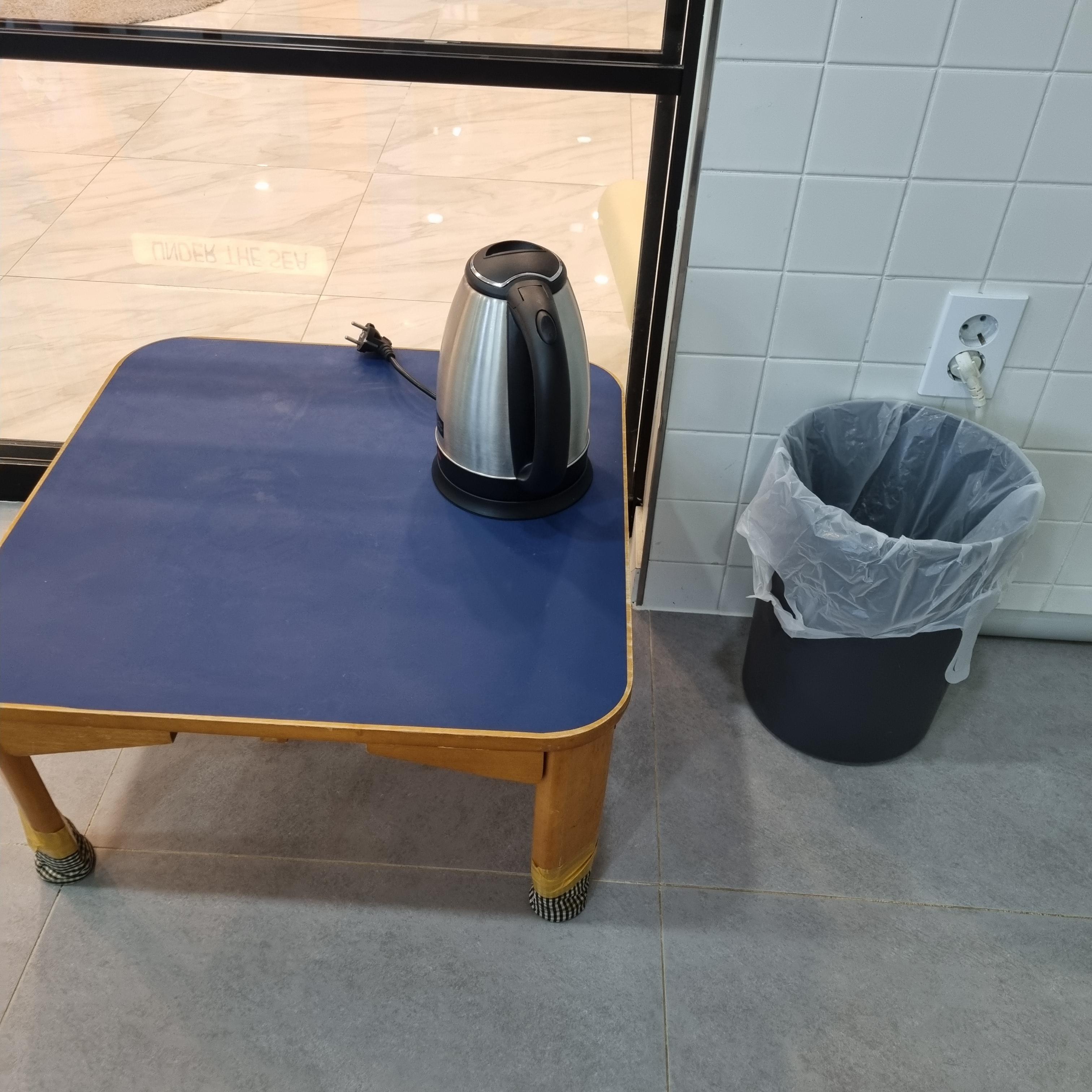 이케아에서 구입한 것 같은 접시, 컵도 보입니다. 그릇과 냄비, 칼과 가위도 있었습니다. 전기포트와 작은 테이블, 안전을 위한 소화기도 비치되어 있습니다.