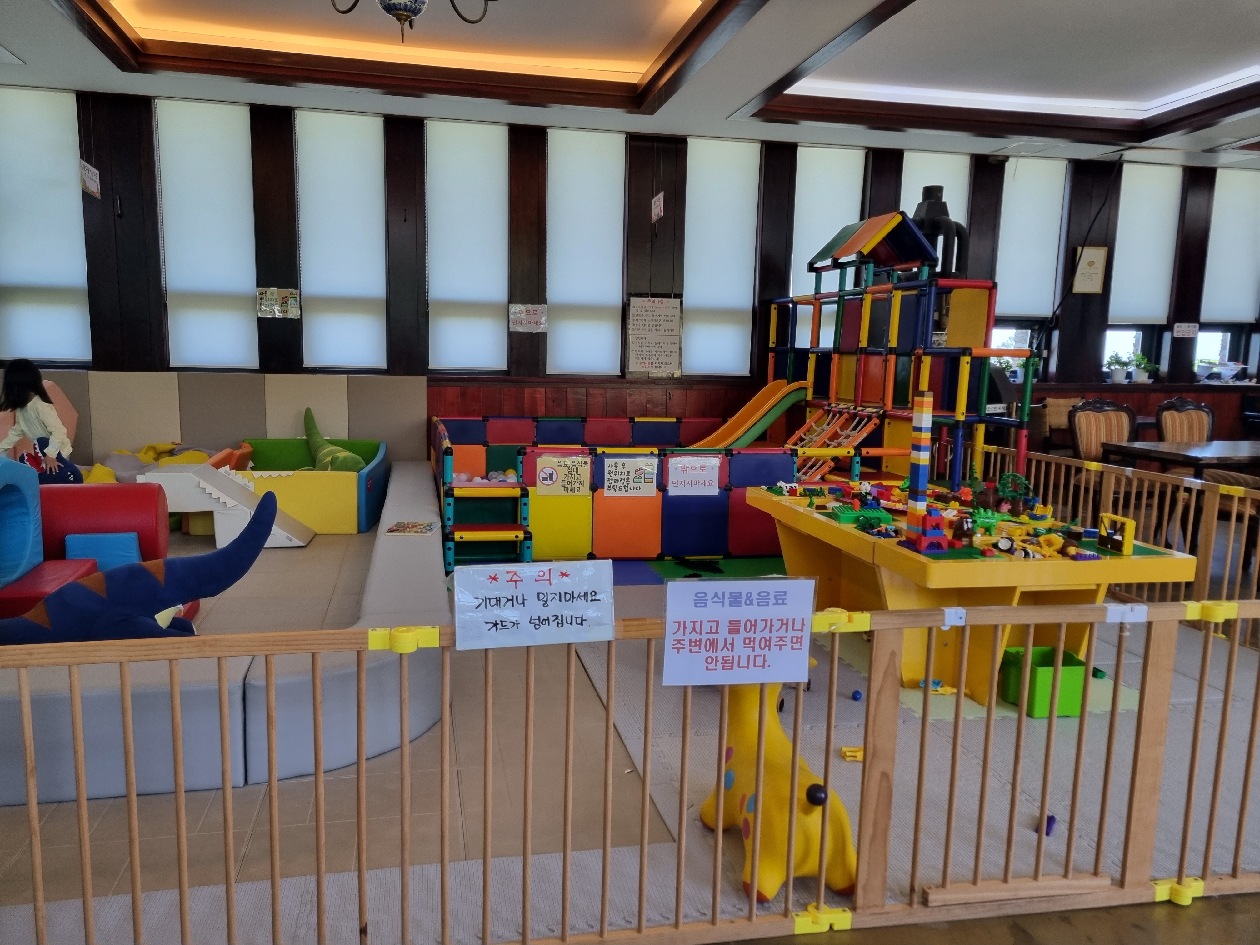 그리고 두 번째가 키즈카페인데요, 박물관에서 살짝 떨어진 다른 건물에 있어요. 커피 같은 음료를 파는 카페와 놀이방이 함께 있는 공간이었어요. 아이들이 놀기에는 좋아 보였지만, 끼니를 때울 만한 음식이 없었어요. 점심때가 되니 배는 고픈데 먹을만한 것이 없어서 일찍 나오게 되었습니다.
