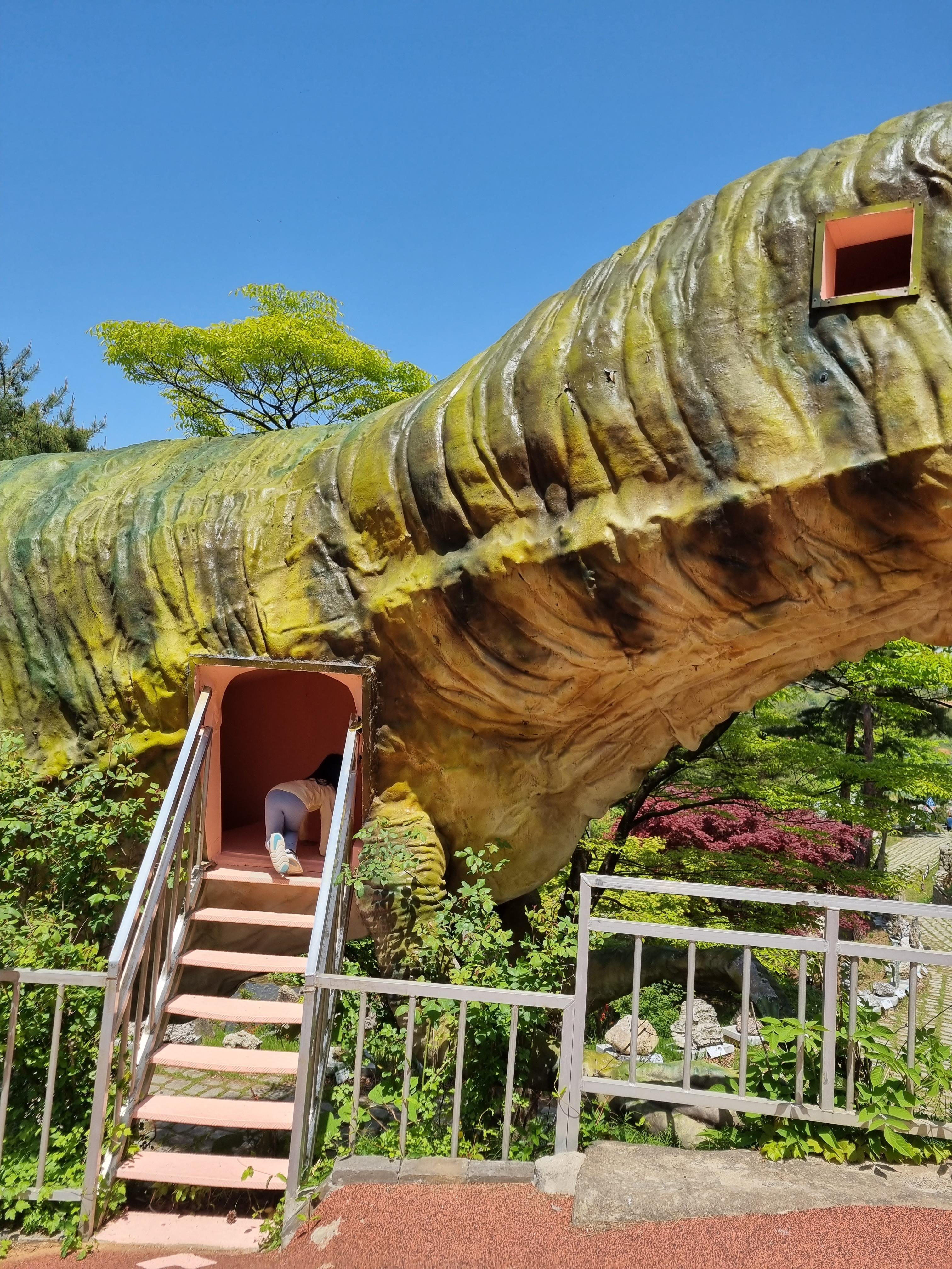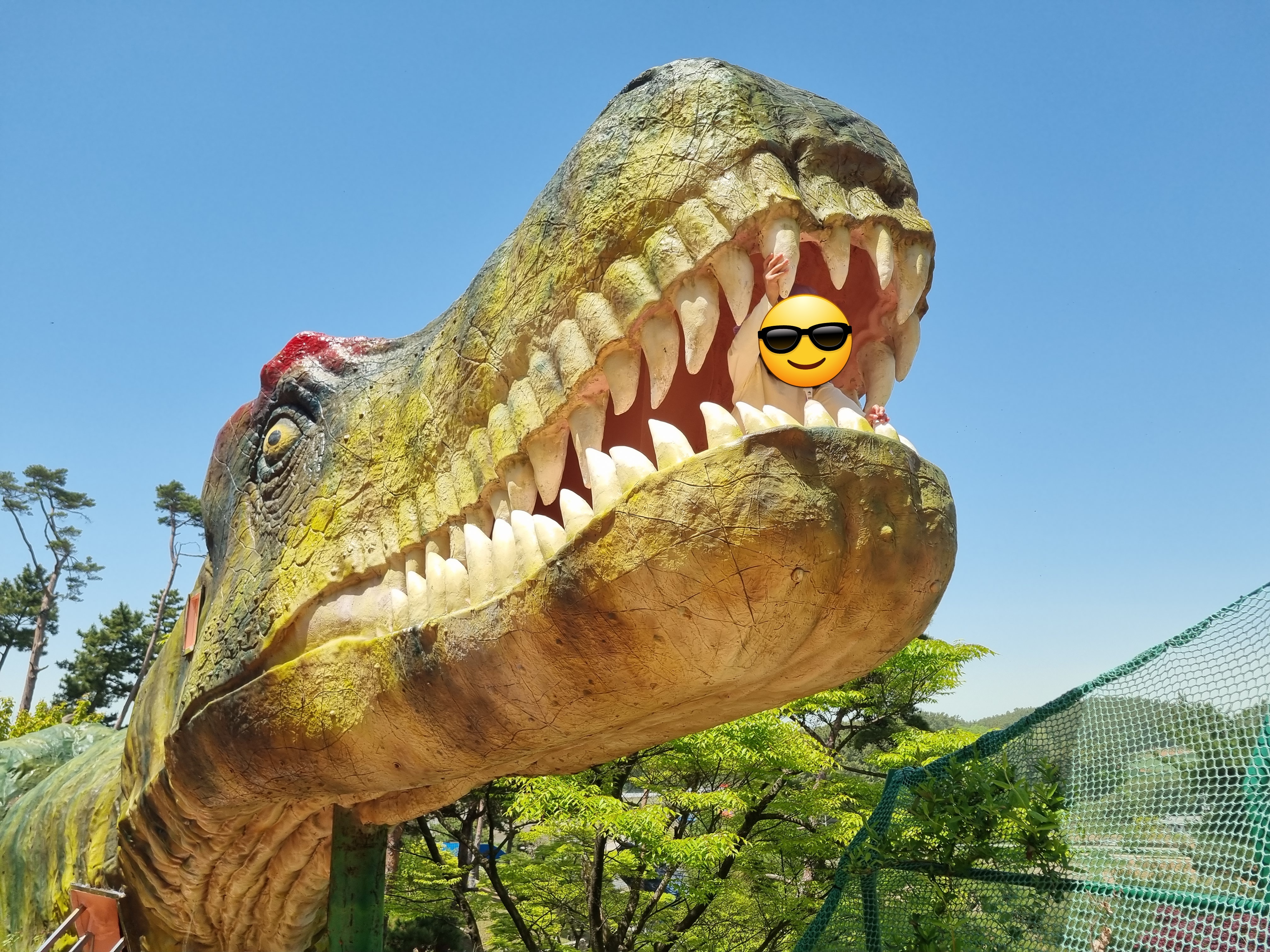 이곳은 곳곳이 포토존이지만 제 생각엔 이곳이 가장 최고의 포토존인 것 같습니다. 공룡 몸통으로 들어가서 왼쪽으로 가면 미끄럼틀을 탈 수 있고, 위로 올라가면 공룡 입까지 올라갈 수 있어요. 공룡 이빨 사이로 환하게 웃으면서 한 컷 남겼습니다. 이빨이 더러웠는지 저보고 공룡 이빨 썩었다고 하더군요. 이곳에서의 사진으로 안면도쥬라기박물관 내돈내산 후기를 마칩니다.