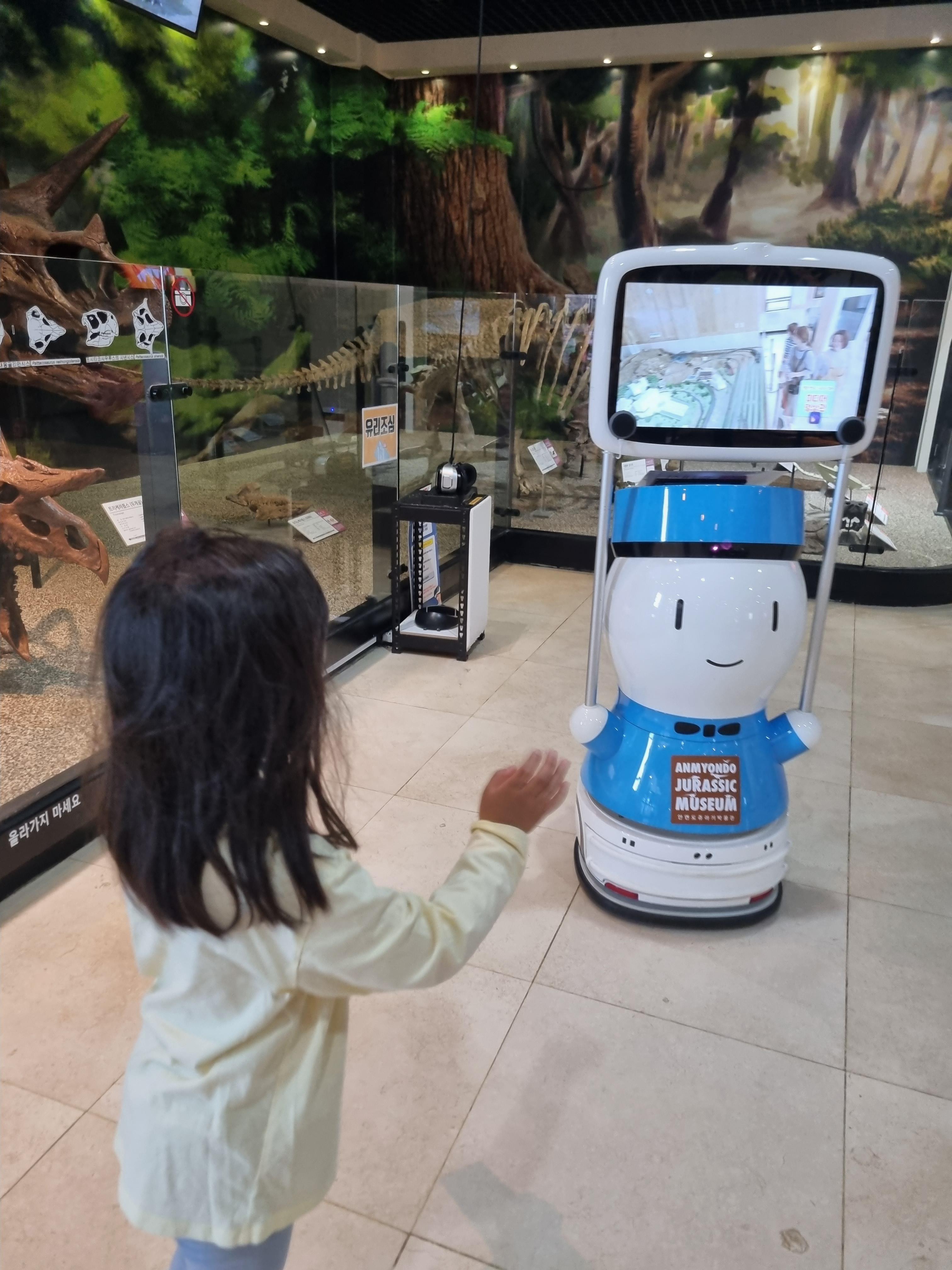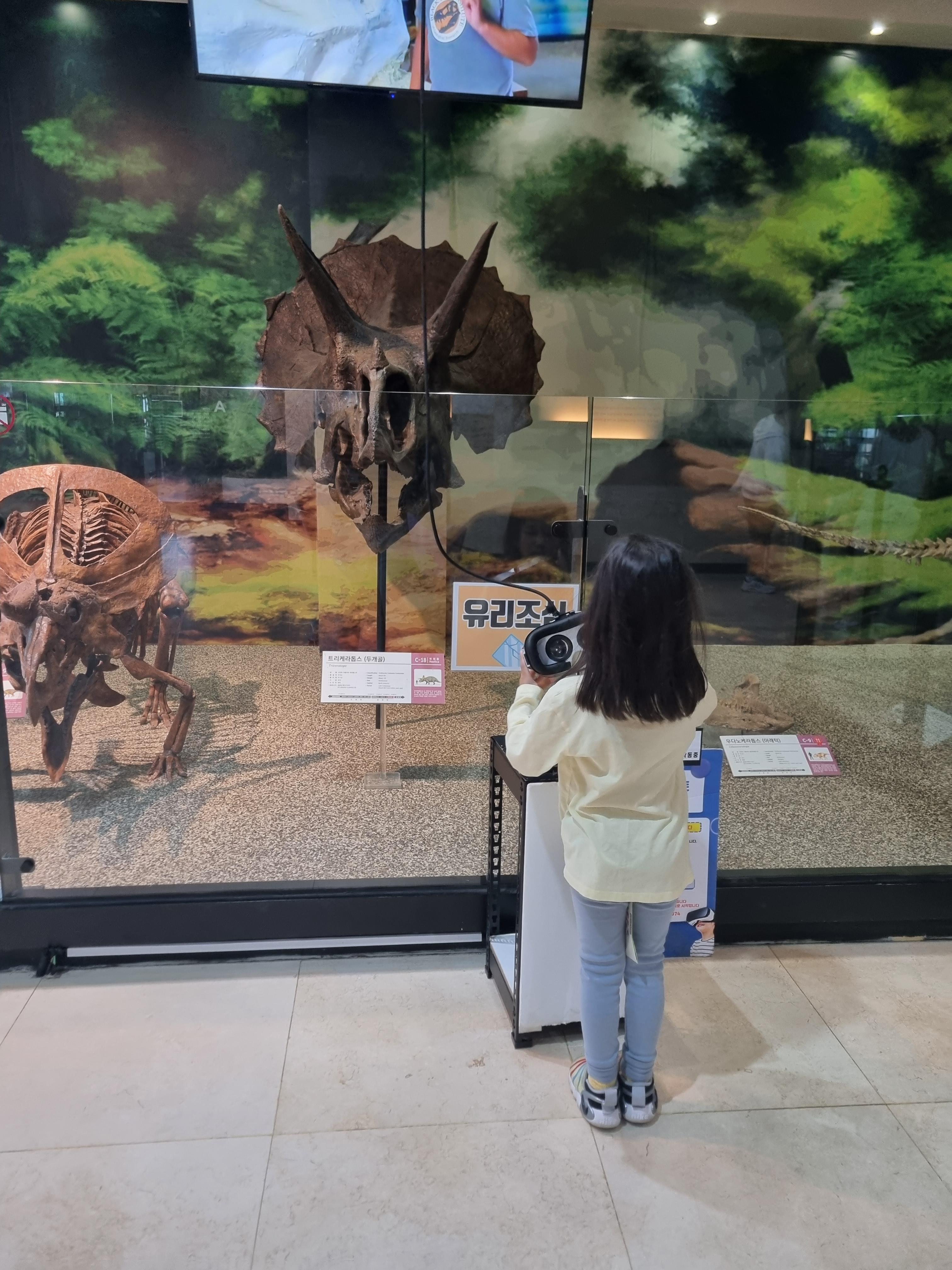 박물관 1층에 있는 움직이는 로봇이 신기한가 봅니다. 영상이 나오는 곳에서는 일단 서봅니다. 공룡 뼈에는 당최 관심이 없습니다. 호기심을 가지고 들여다보는 모습을 보질 못했네요.