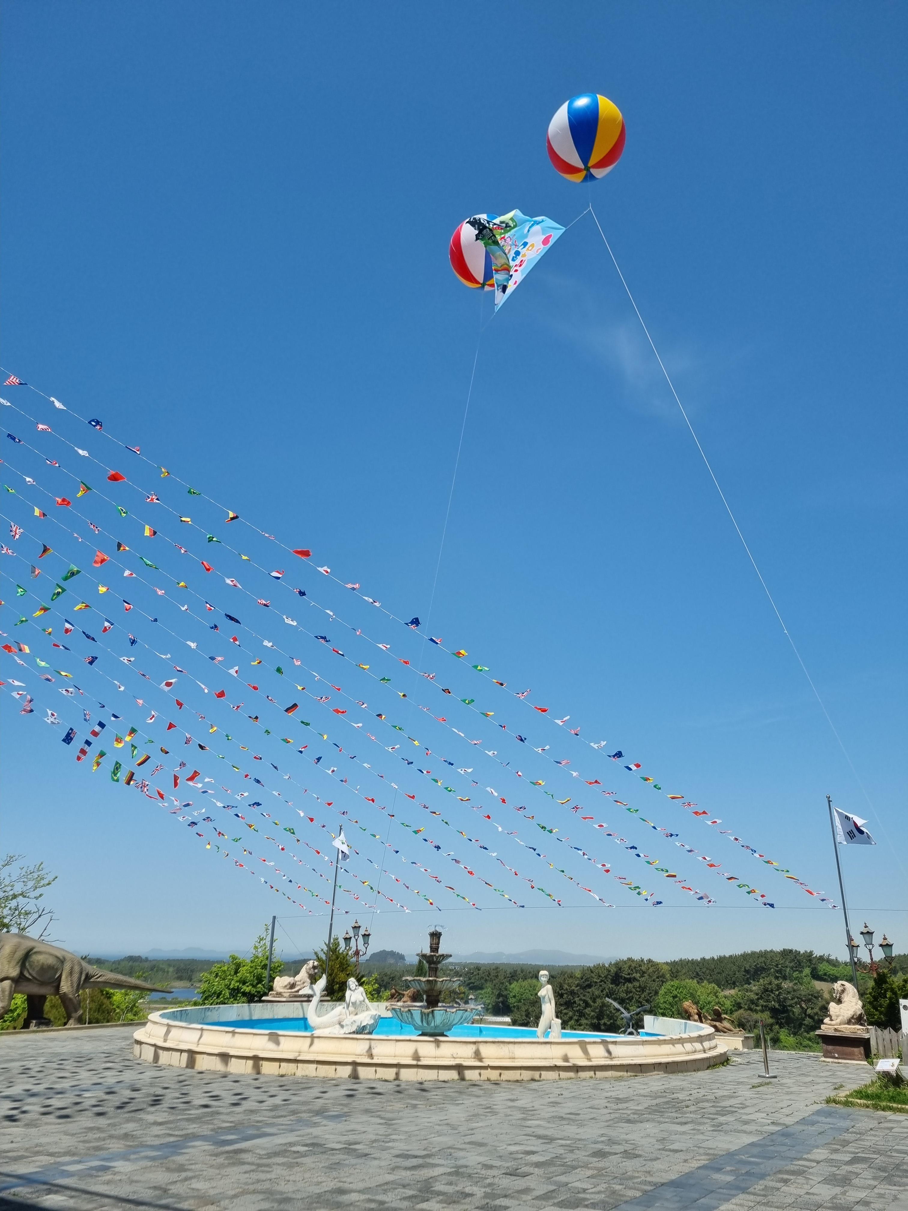 박물관 앞에 도착했어요. 공룡 모형이 있는 포토존이 있습니다. 그냥 지나칠 수 없으니 사진을 찍어봅니다. 다가오는 어린이날 행사를 알리는 풍선이 높이 떠 있습니다.