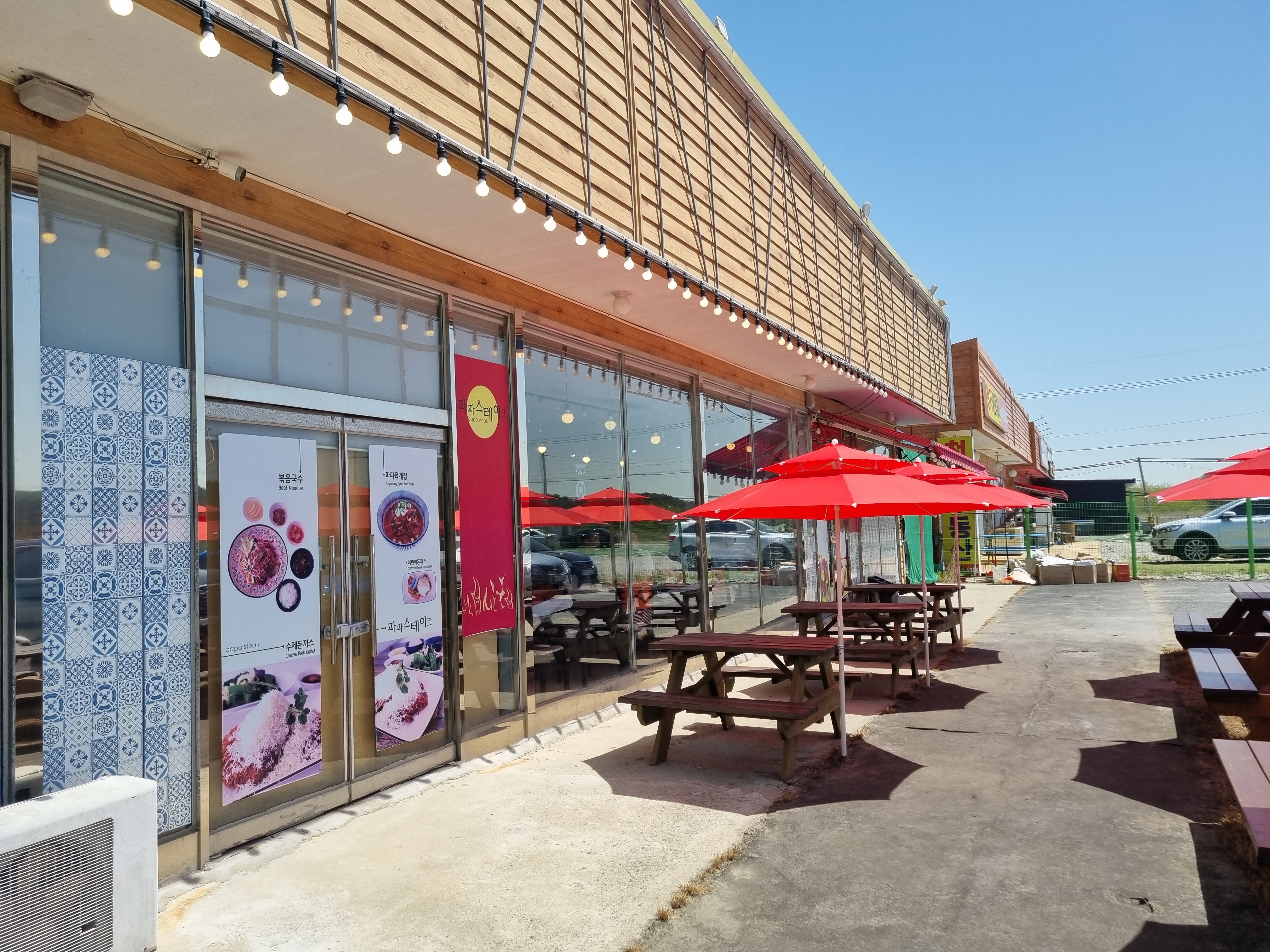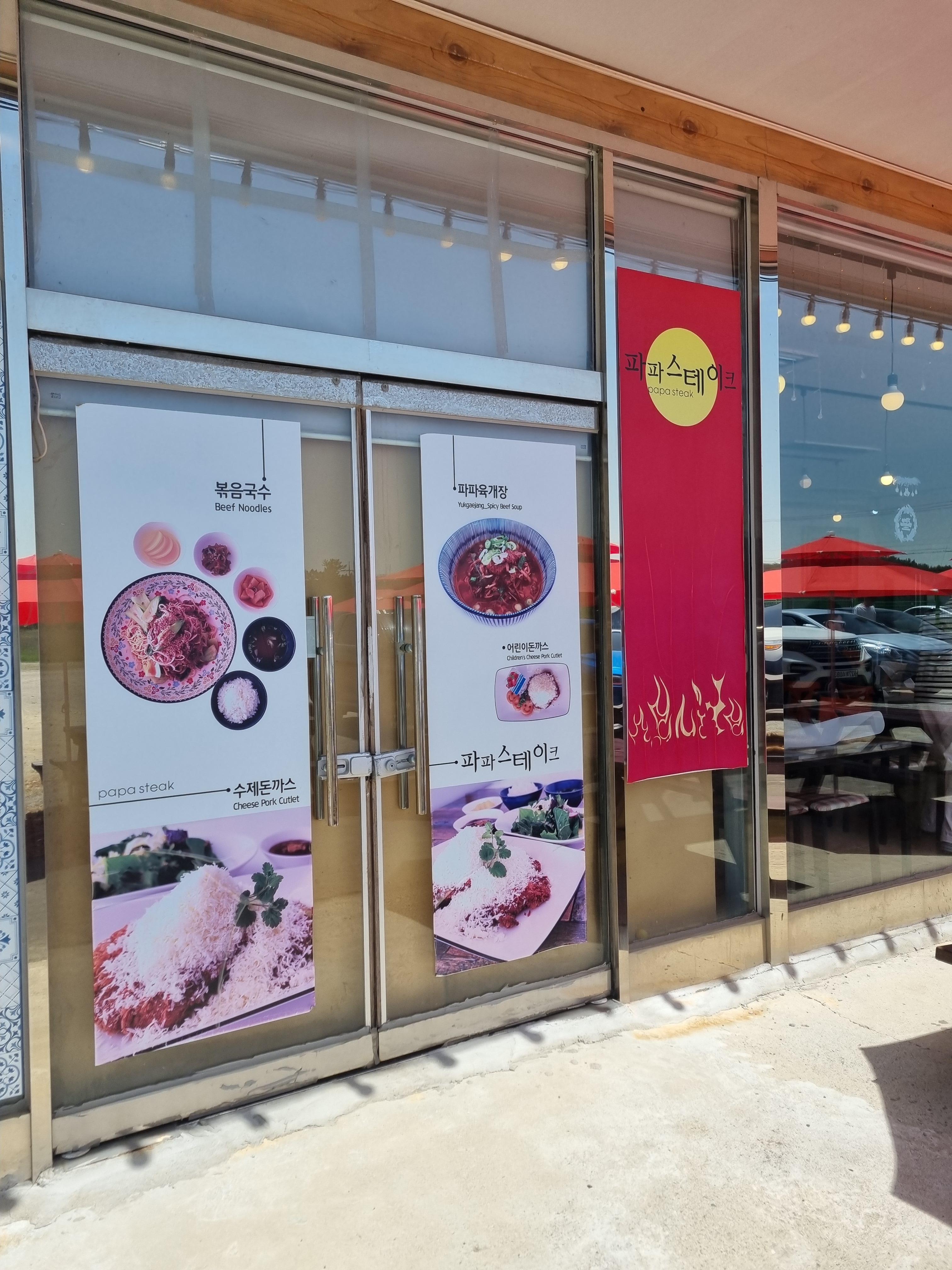 파파스테이크 주차장은 무척 넓어요. 주차 걱정은 안 하셔도 될 것 같습니다. 구획이 그어진 곳이 아니라 공터에 주차를 하게 됩니다. 파파스테이크를 네비 찍고 찾아오실 때 유의할 점은 빛축제 장소에서 들어올 때, 도로와 가까운 건물 쪽에는 펜스가 있어 파파스테이크로 들어올 수 없으니 조금만 더 직진해서 우회전 하여 들어오셔야 한다는 점입니다.