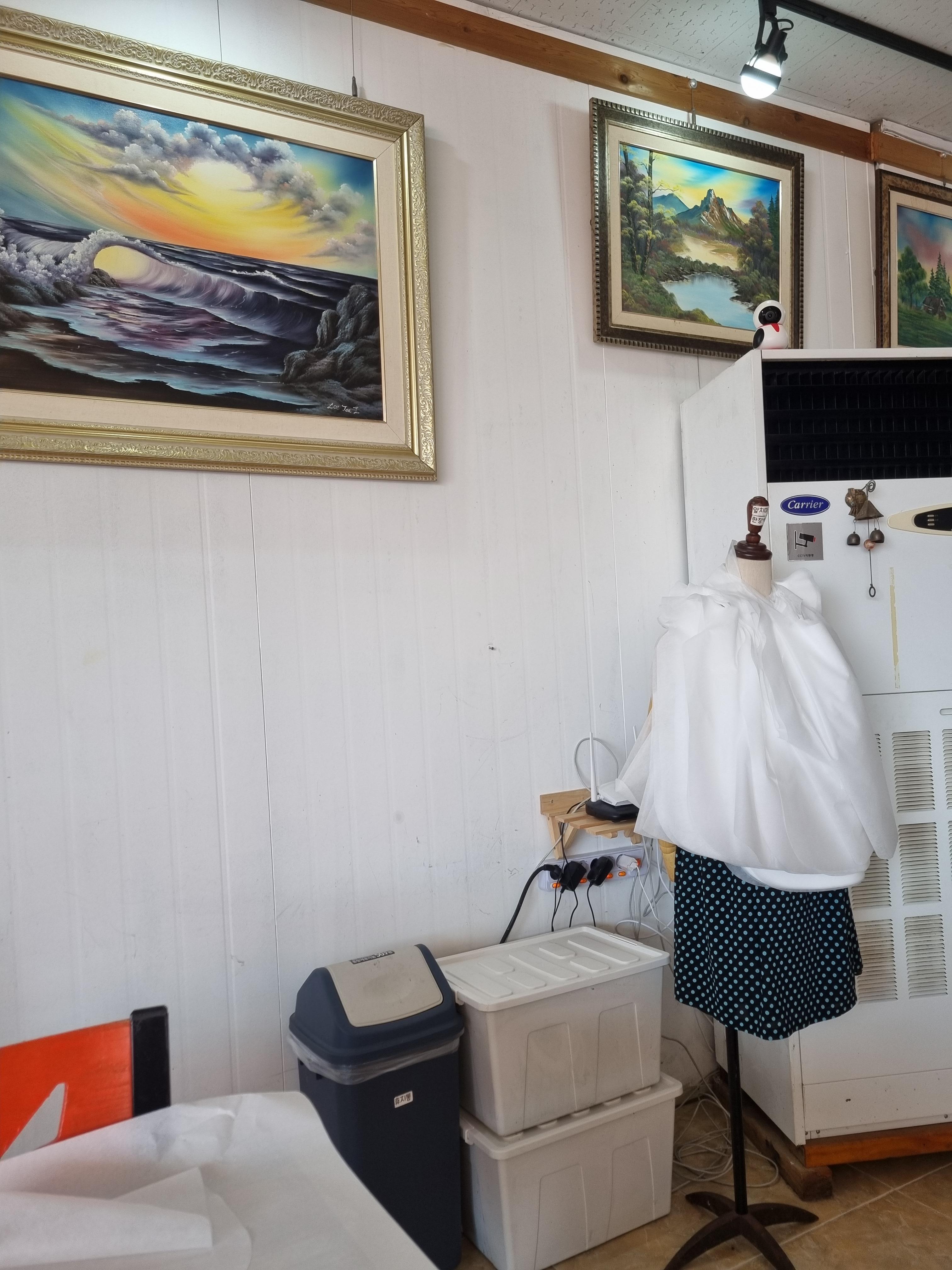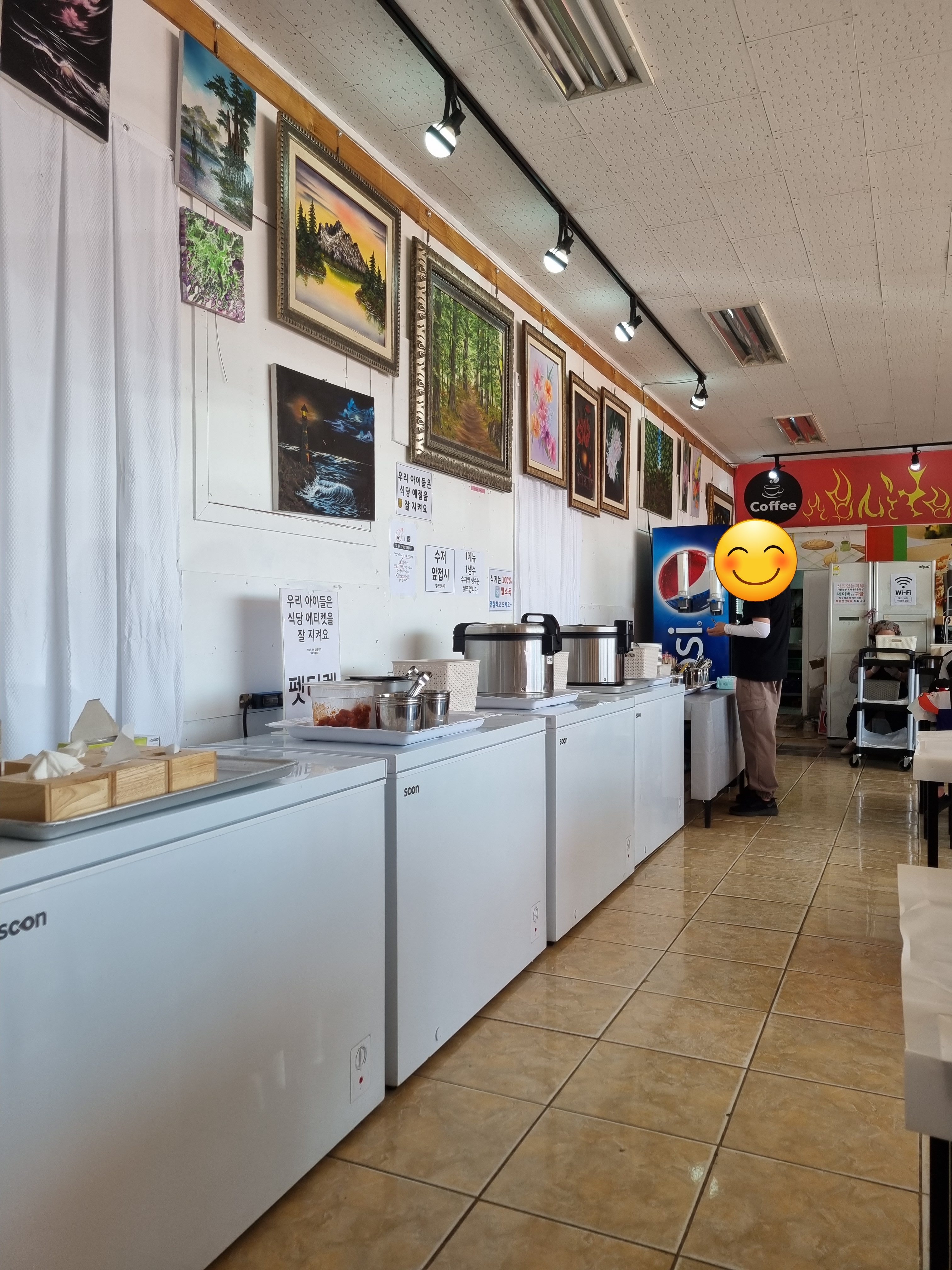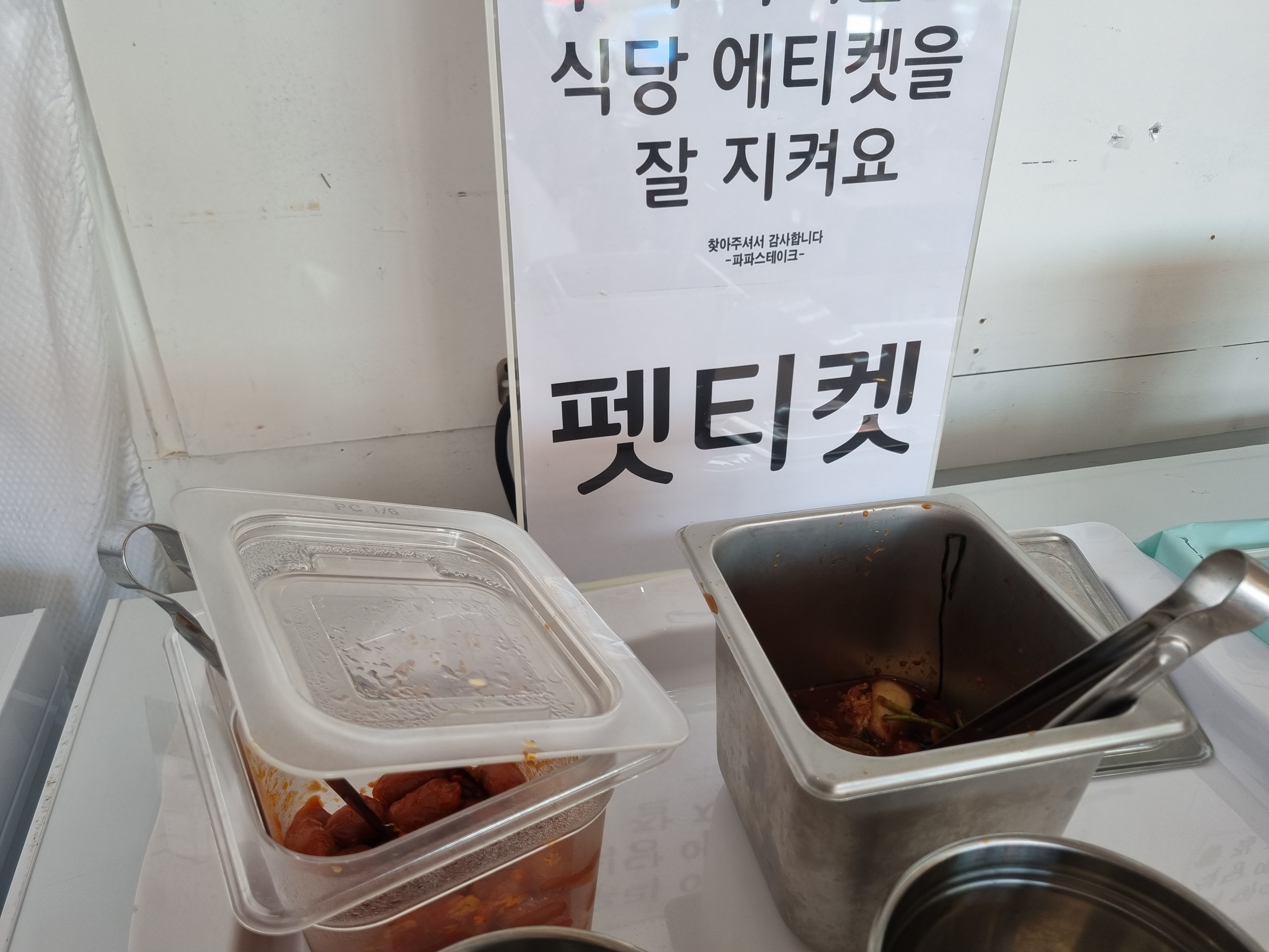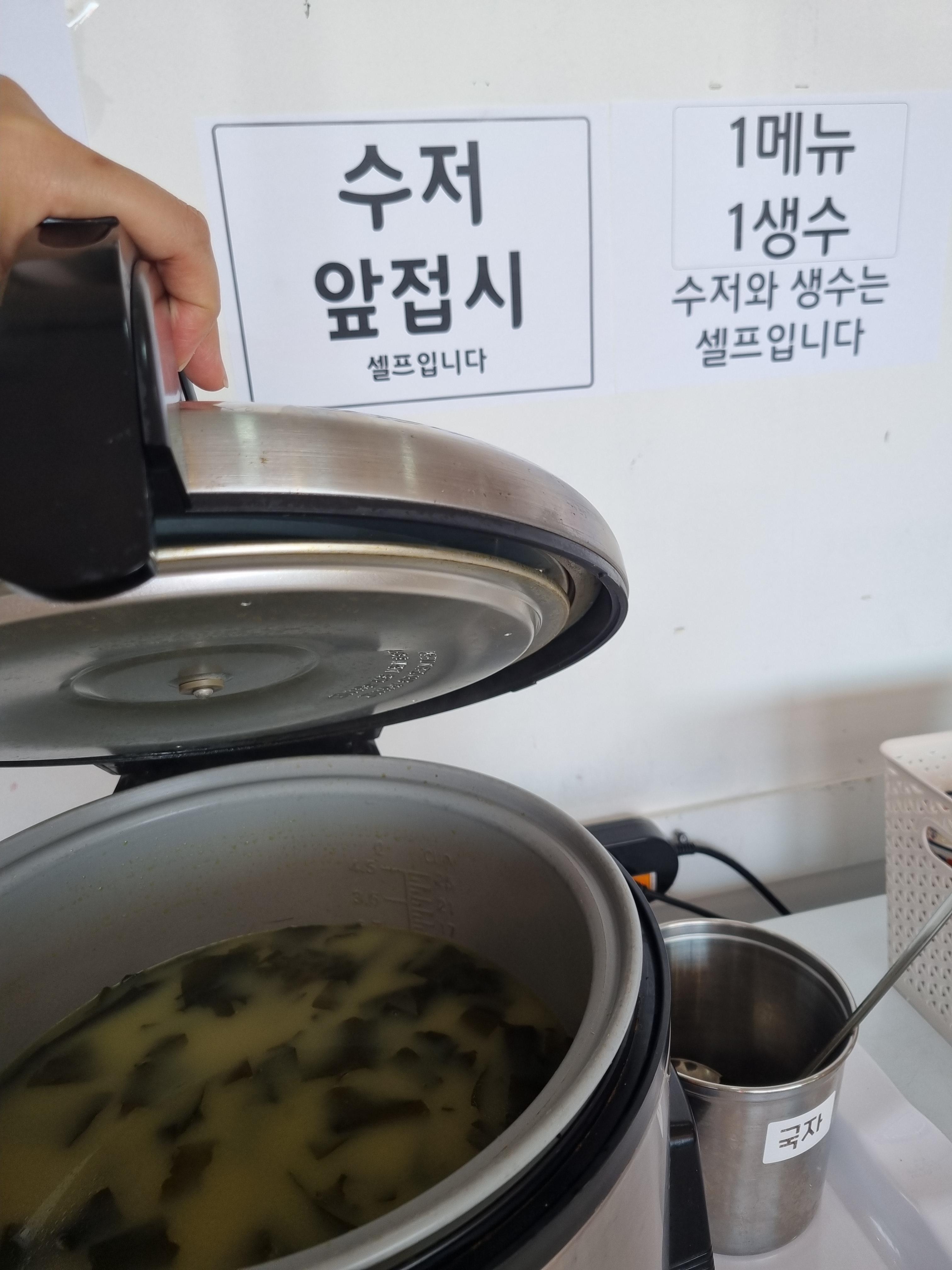 셀프바는 벽 한쪽을 차지하고 있어요. 냅킨부터 수저, 밥, 미역국, 반찬 등이 비치되어 있어요. 반찬은 깍두기와 소시지 볶음이었어요. 앉자 마자 배고프니 일회용 앞치마를 찾아 걸고, 미역국과 반찬을 퍼와서 얌얌 먹었던 기억이 납니다. 유아를 동반한 가족은 미역국에 밥 말아 먹이면 되겠다는 생각이 들었어요.