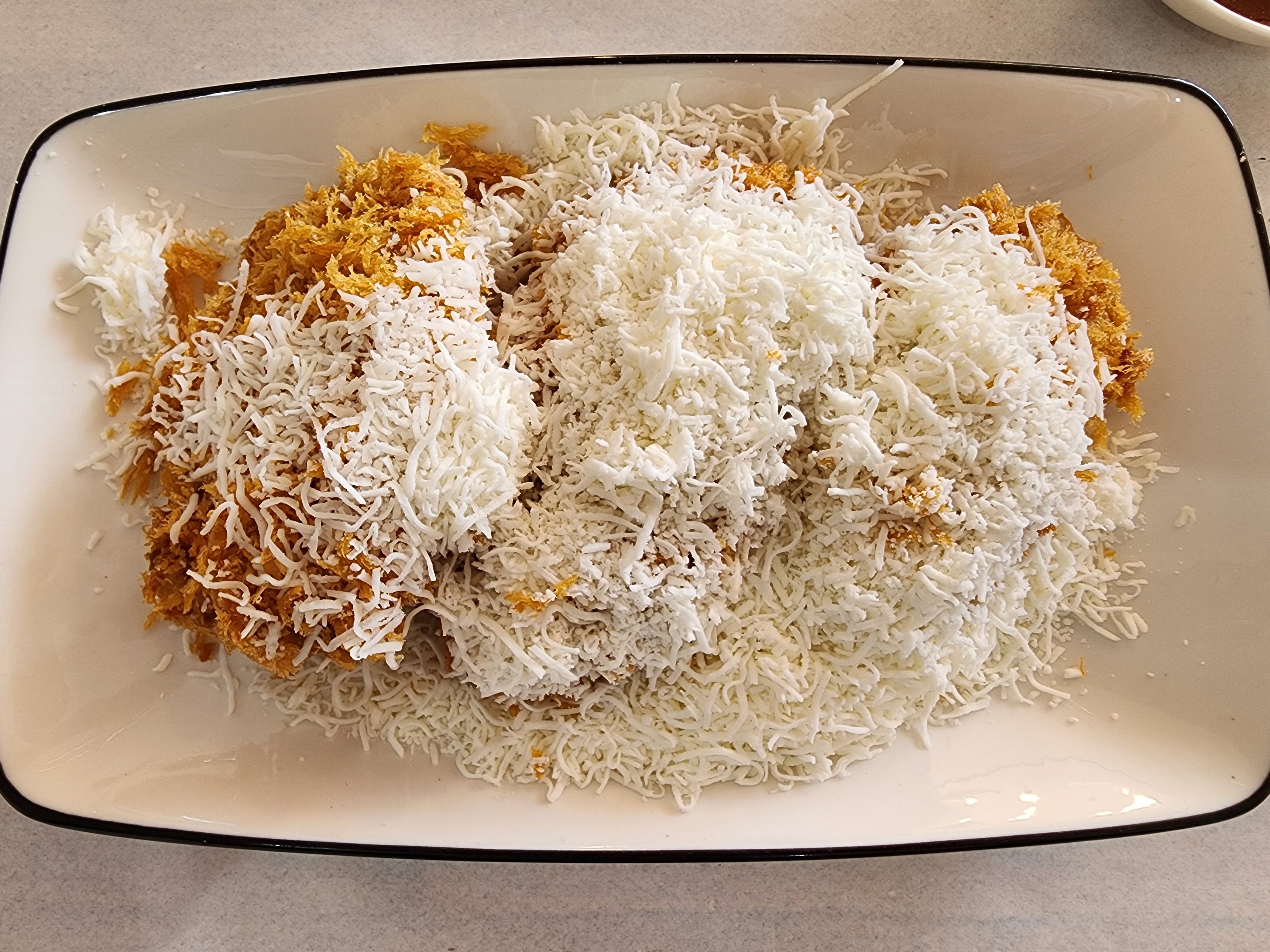 수제돈가스는 15,000원인데 돈까스는 세 덩이입니다. 양은 많아요. 양배추 샐러드와 같은 플레이팅은 없고 눈꽃 치즈가 뿌려져 있습니다. 치즈는 차가운 게 특징이에요. 튀김이나 익힘 정도는 적당했지만 저는 눈꽃 치즈의 차가운 식감과 돈가스가 어울린다는 느낌을 받지 못했고, 비싸다고 느꼈습니다.