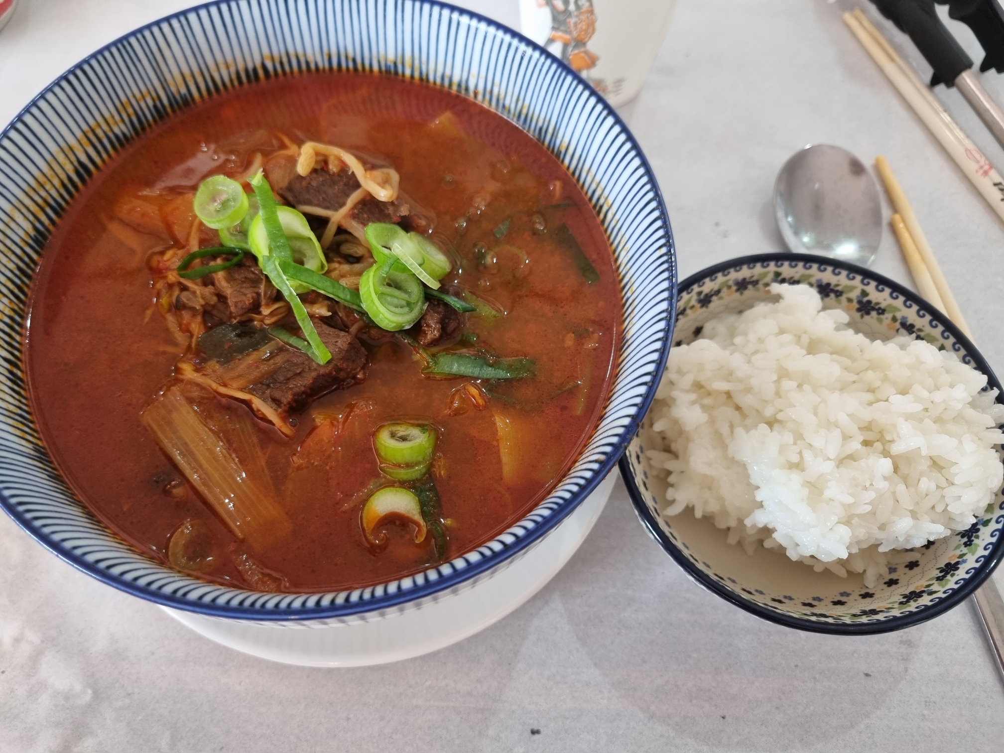 식당 이름은 스테이크였는데 파파육개장을 팔더군요. '해장용일까?'라는 생각을 잠시 했는데, 아주 맵진 않아도 매운 편이었어요. 건더기도 많았고, 고기도 튼실했어요. 하지만 저는 육개장 건더기에서 이제 막 끓인 느낌을 받진 못했어요. 푹 끓인 건 맞는데 말이죠. 육개장 체인점에[서 맛보던 맛은 아니어서 제가 선호하는 맛은 아니었어요. 이것도 15,000원으로 비싸다고 느껴졌어요.