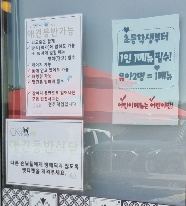 식당 입구에 안내되어 있는 사항이에요. 애견동반 식당입니다. 실제로 식사할 때 엄청 큰 애완견도 함께 있더라고요. 주인이 잘 컨트롤 하시는 모습을 보아 안심했어요.