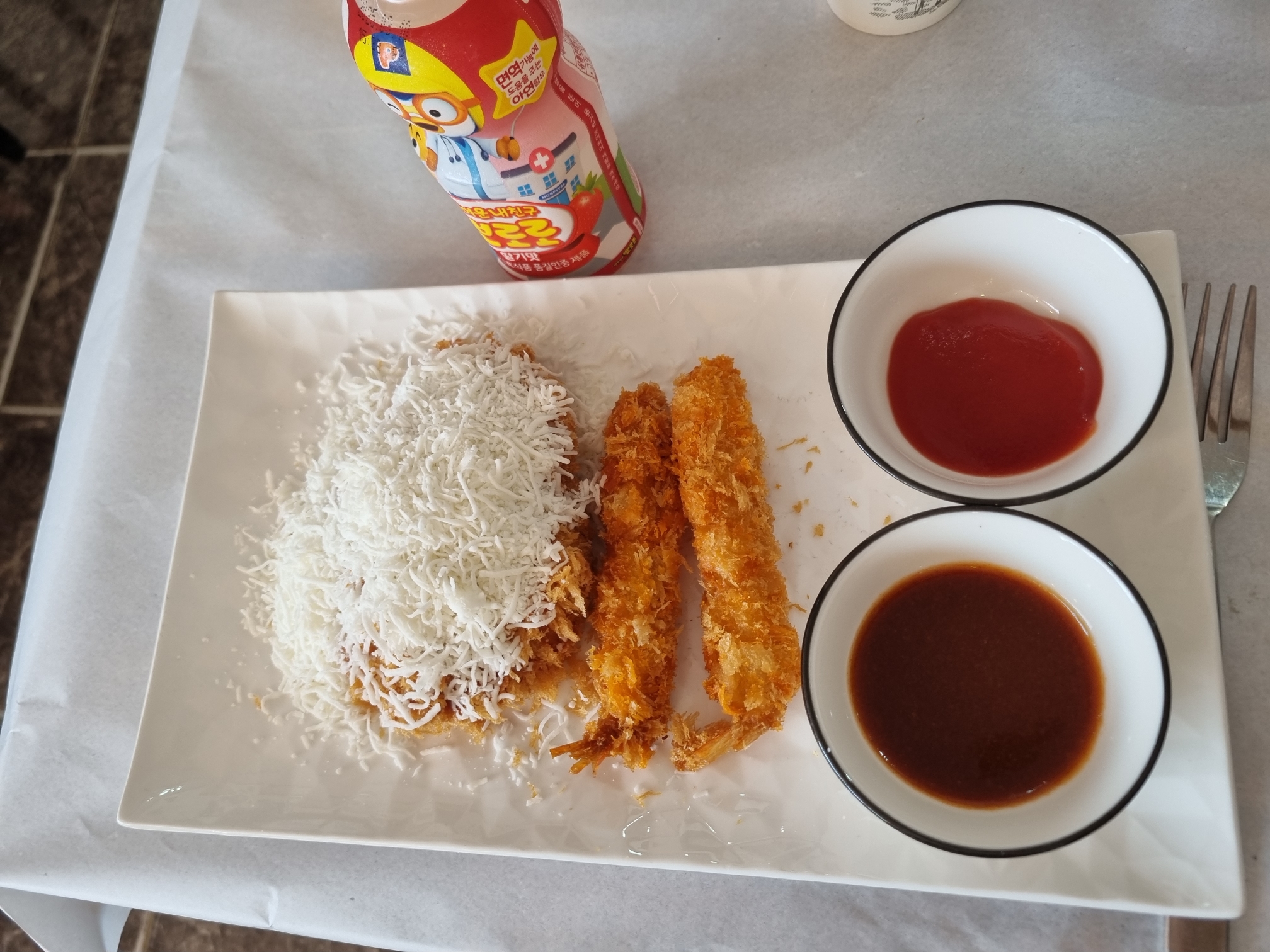 아이 메뉴인 어린이돈가스입니다. 뽀로로 음료수까지 함께 나오는 메뉴예요. 수제돈가스에서 한 덩이만 가져온 것 같아요. 돈가스 위에 눈꽃치즈가 있고 새우튀김 두 개 더 나와요. 소스는 케첩과 돈가스 소스가 나옵니다. 아이가 생각보다 잘 먹지 않았어요. 새우뒤김은 엄빠가 다 먹었지요.