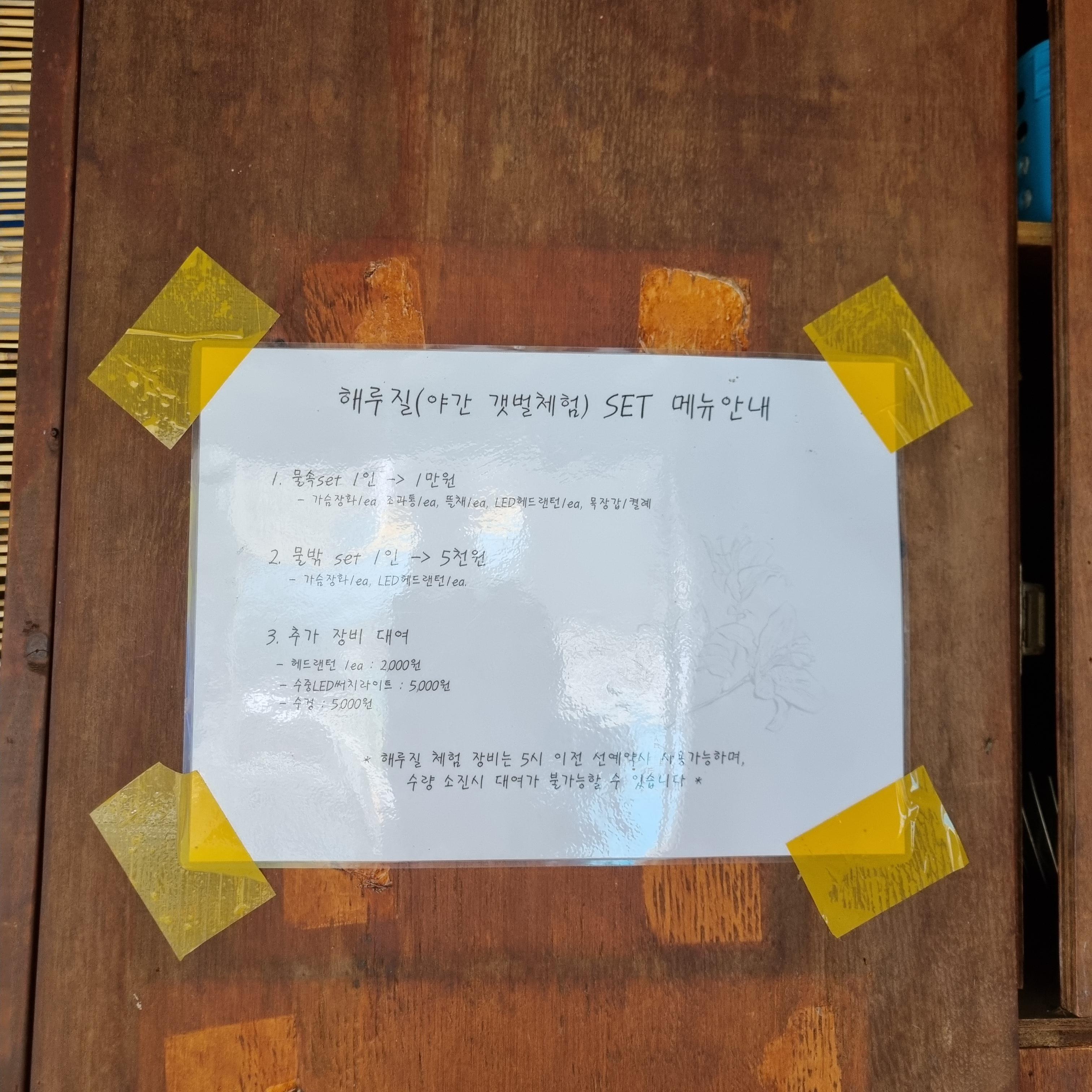 백합펜션에서 야간 해루질은 장비를 유료로 대여해 주지만 일반 해루질은 장화, 플라스틱 통은 그냥 빌려주시더라고요. 단 호미나 삼발이, 삽은 없었습니다. 가져갔던 도구를 썼답니다
