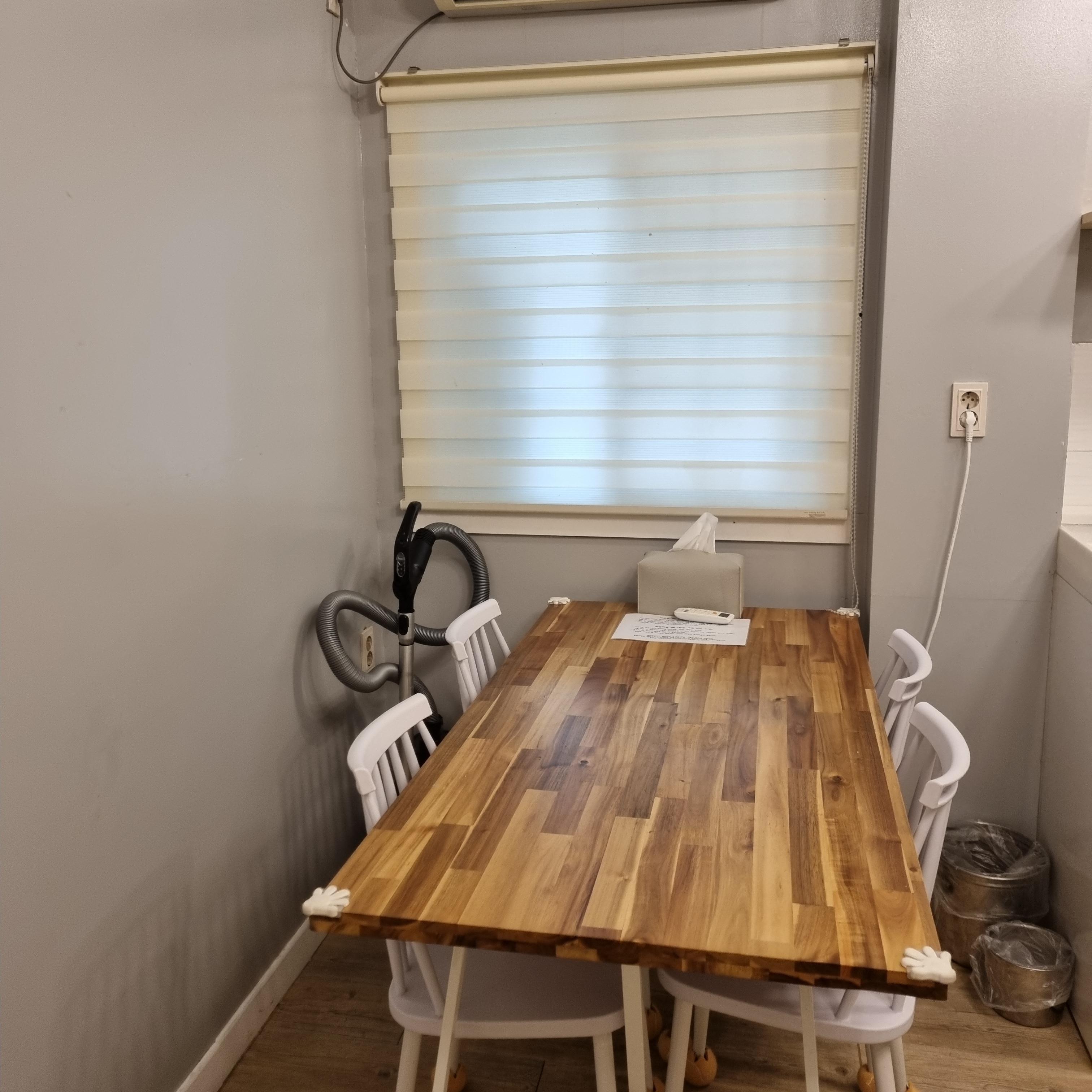 열쇠로 문을 열고 들어가 보았습니다. 정면에 식탁이 보입니다. 현관 우측에는 화장실이 있고, 화장실과 식탁 사이에 싱크대와 냉장고 등이 있습니다.