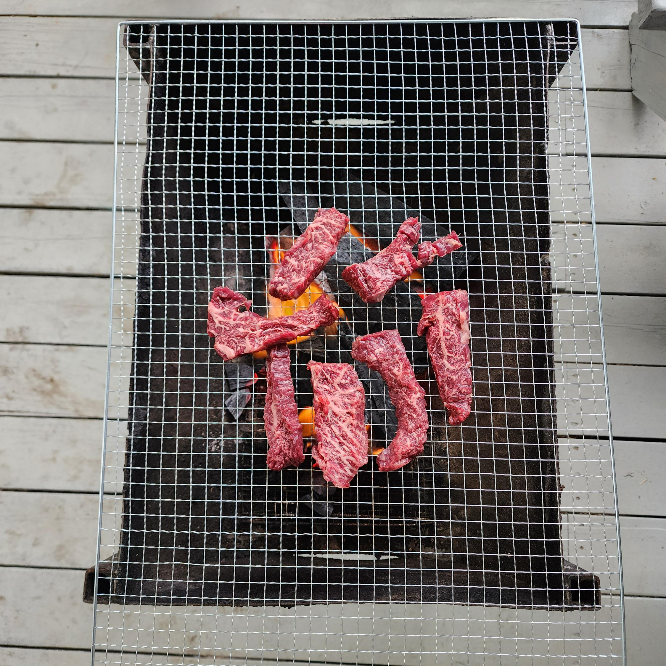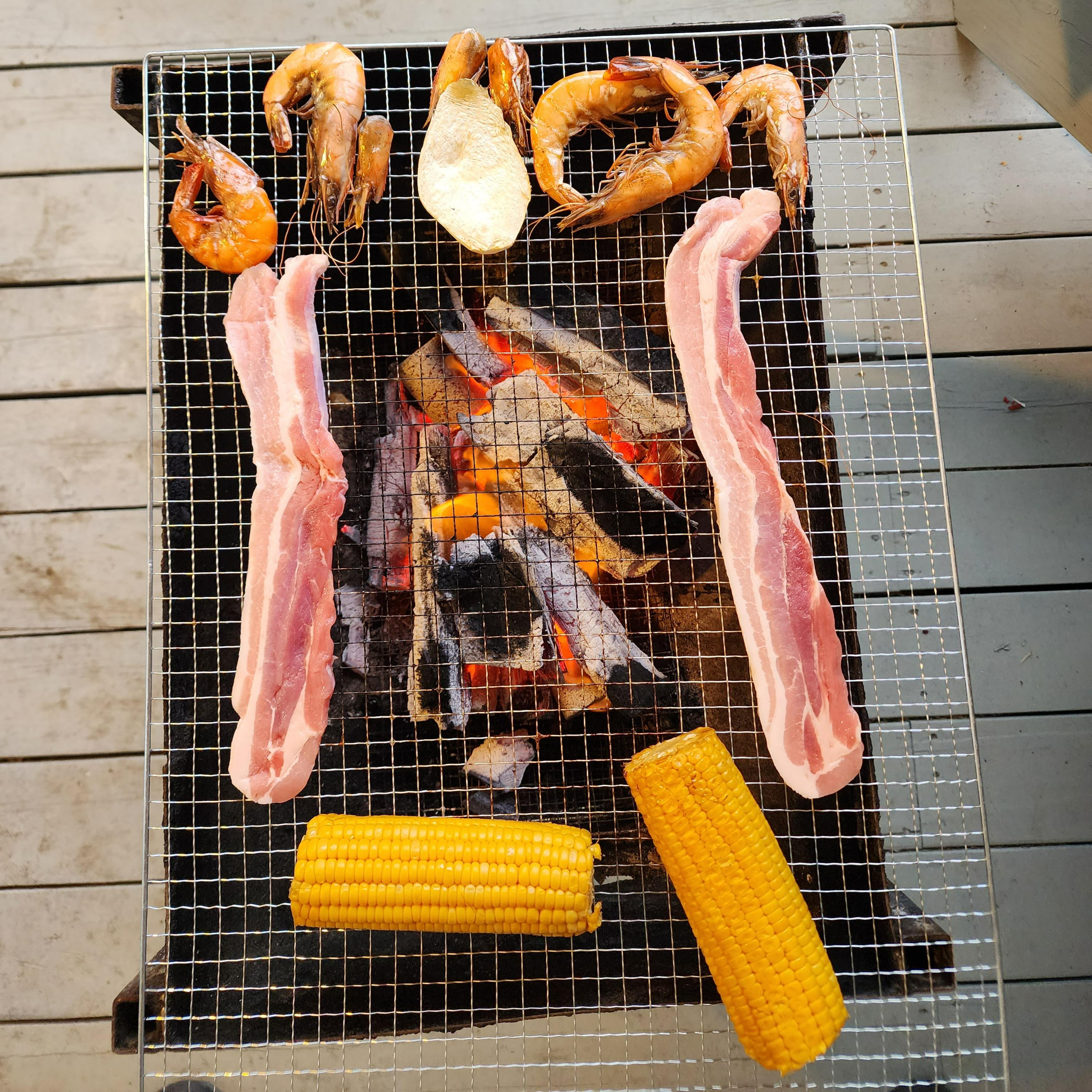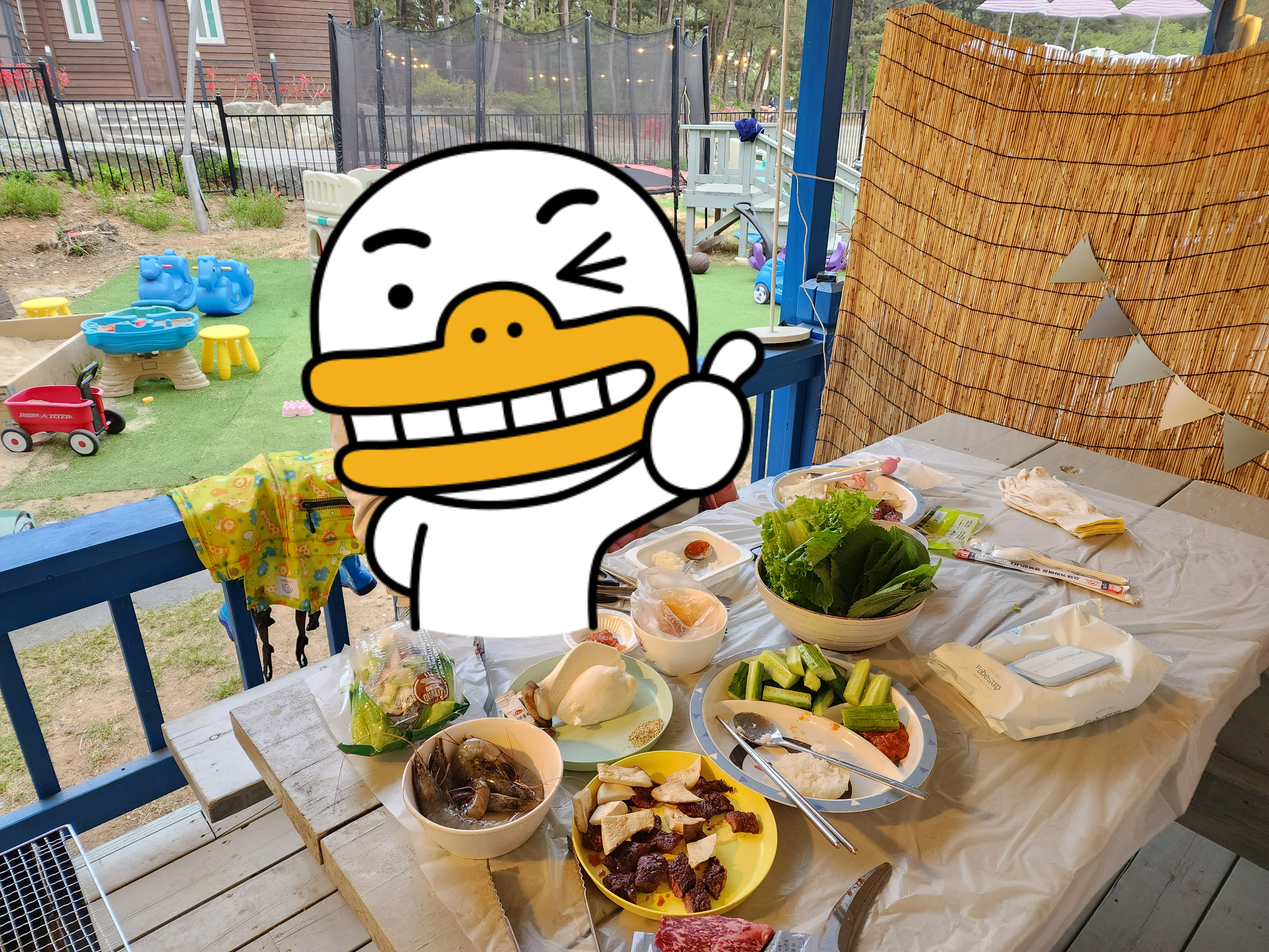 모모룸은 야외 바비큐가 가능한 방이었습니다. 방 앞에 테라스가 있고, 바비큐 신청을 하면 불까지 피워서 세팅해 주십니다. 저희는 아이까지 셋이라 2만 원 냈습니다. 불 피우기 전에 여유롭게 말씀드리는 것이 좋은 것 같습니다. 화력도 좋고 고기를 태우지 않고 나름 잘 구울 수 있었습니다.