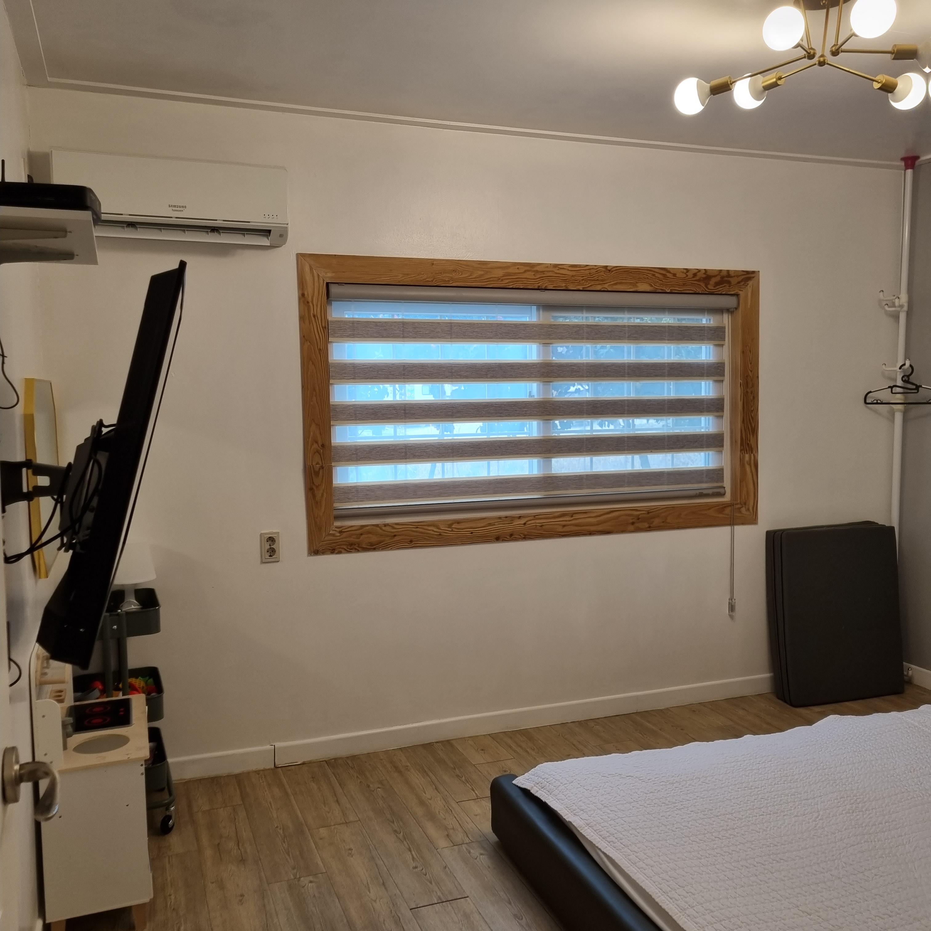 정글짐 우측에는 침실문이 있습니다. 문을 열고 들어가면 왼편에 TV와 주방놀이 장난감이 있습니다. 오른편에 낮고 넓은 침대가 있습니다. 아이랑 자기에 충분했고 침구는 깨끗했습니다. 침대 맞은편에는 창문이 있었는데, 나중에 블라인드 내려보니 꽃나무에 꽃이 피어있더라고요.
