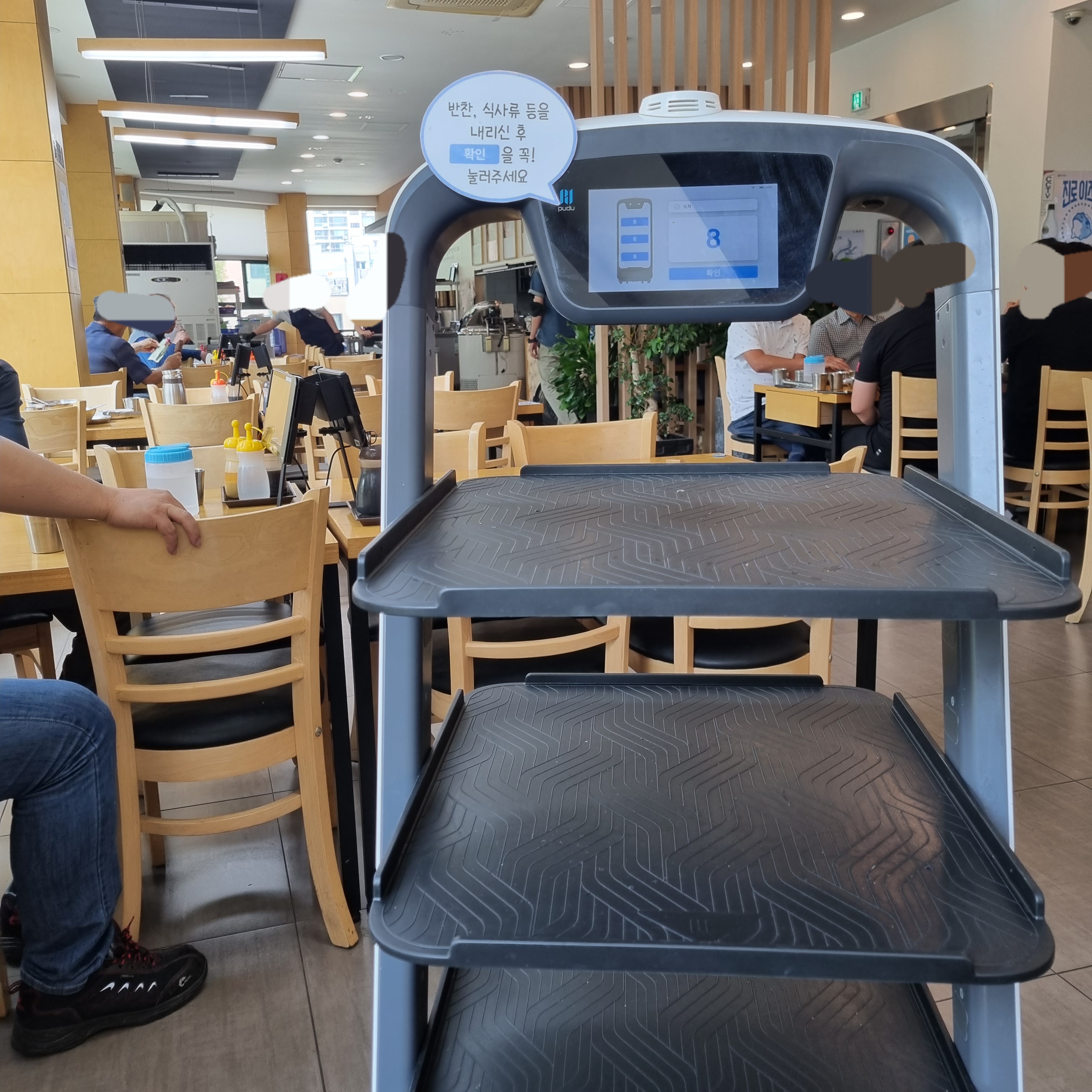 주문 넣고 좀 있으니 서빙로봇이 음식을 배달해줬어요. 음식을 내린 다음에 찍었네요. 음식을 다 내리고 확인을 눌러줘야 서빙로봇이 돌아가요.