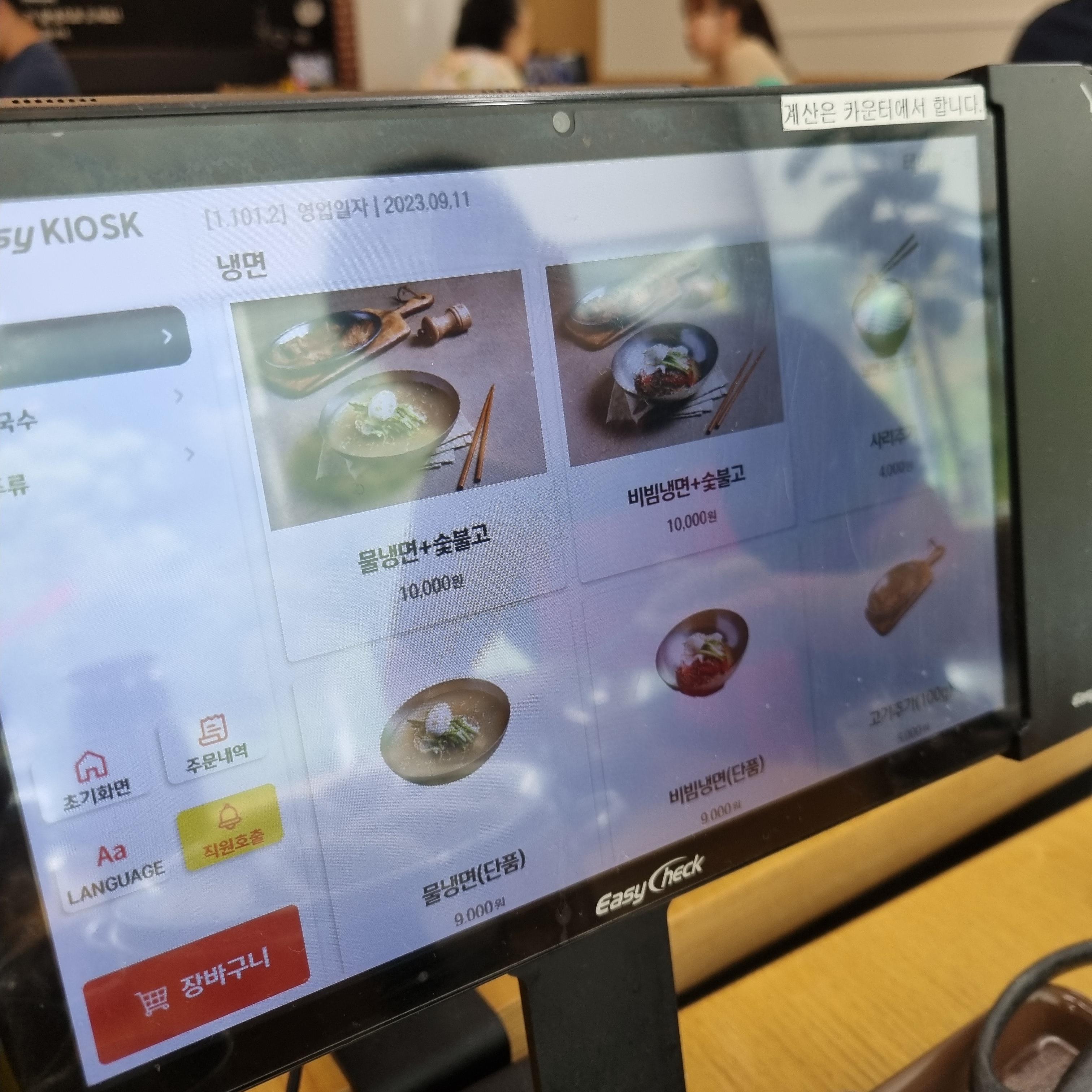 테이블에 앉아서 비대면으로 주문할 수 있어서 편리했습니다. 저희가 주문했던 것은 냉면과 숯불고기가 함께 나오는 메뉴인데요, 물냉면을 선택하든, 비빔냉면을 선택하든 모두 10,000원입니다. 물론 냉면만 파는 단품도 가능해요. 단품은 9,000원입니다.