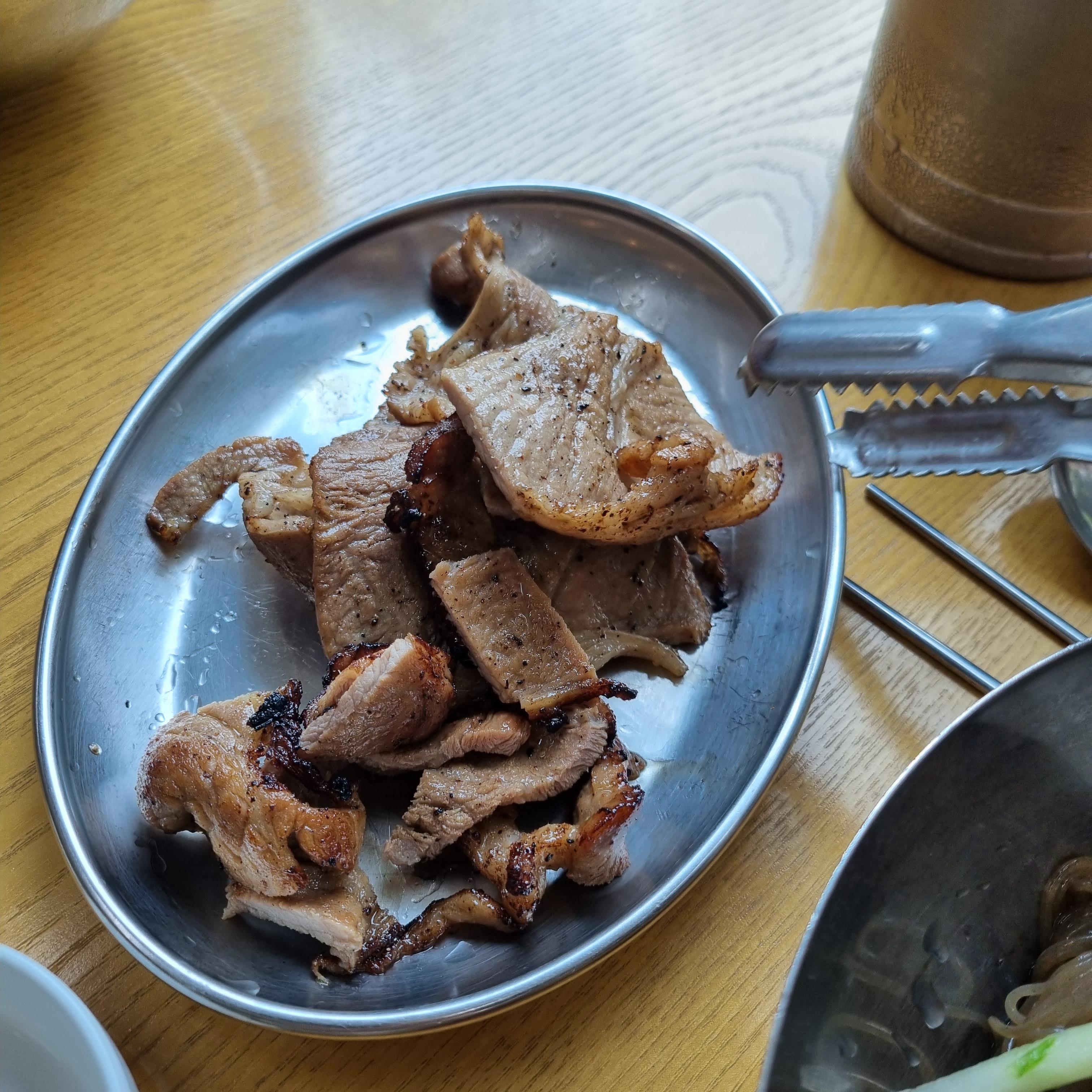 3인분 숯불고기가 나왔습니다. 크게 나오는데 집게와 가위로 잘라줬어요. 기름기 적당히 있으면서 냉면과 함께 먹기 좋았어요.