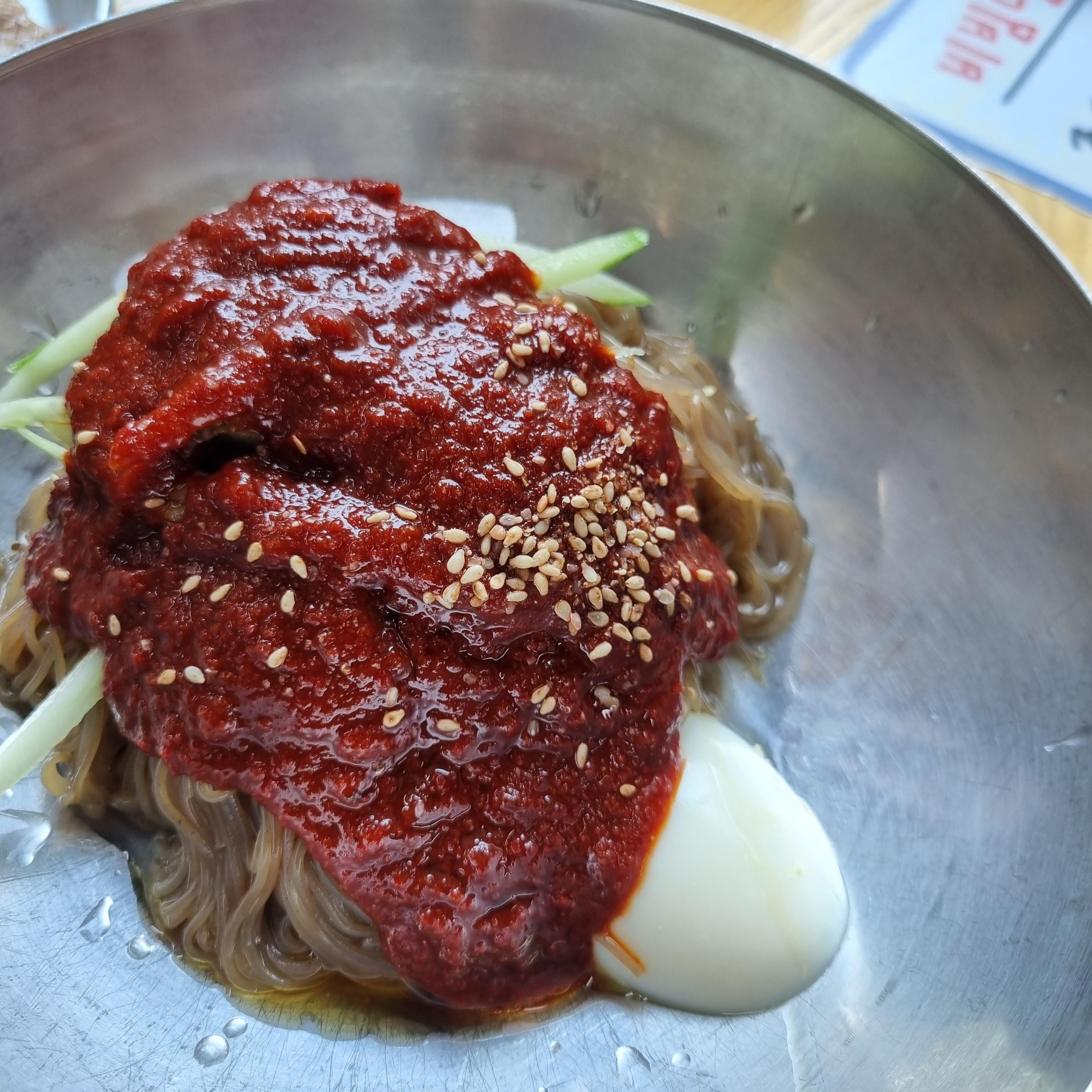 비빔냉면입니다. 좀 매콤하다고 해요. 그리고 팁인데 여기에 냉육수를 부어서 같이 먹으면 더 맛있다고 해요. 중간에 종업원께서 알려주셔서 그렇게 드렸어요. 빨간 소스가 더 필요하면 얘기하면 챙겨다 주시더라고요.