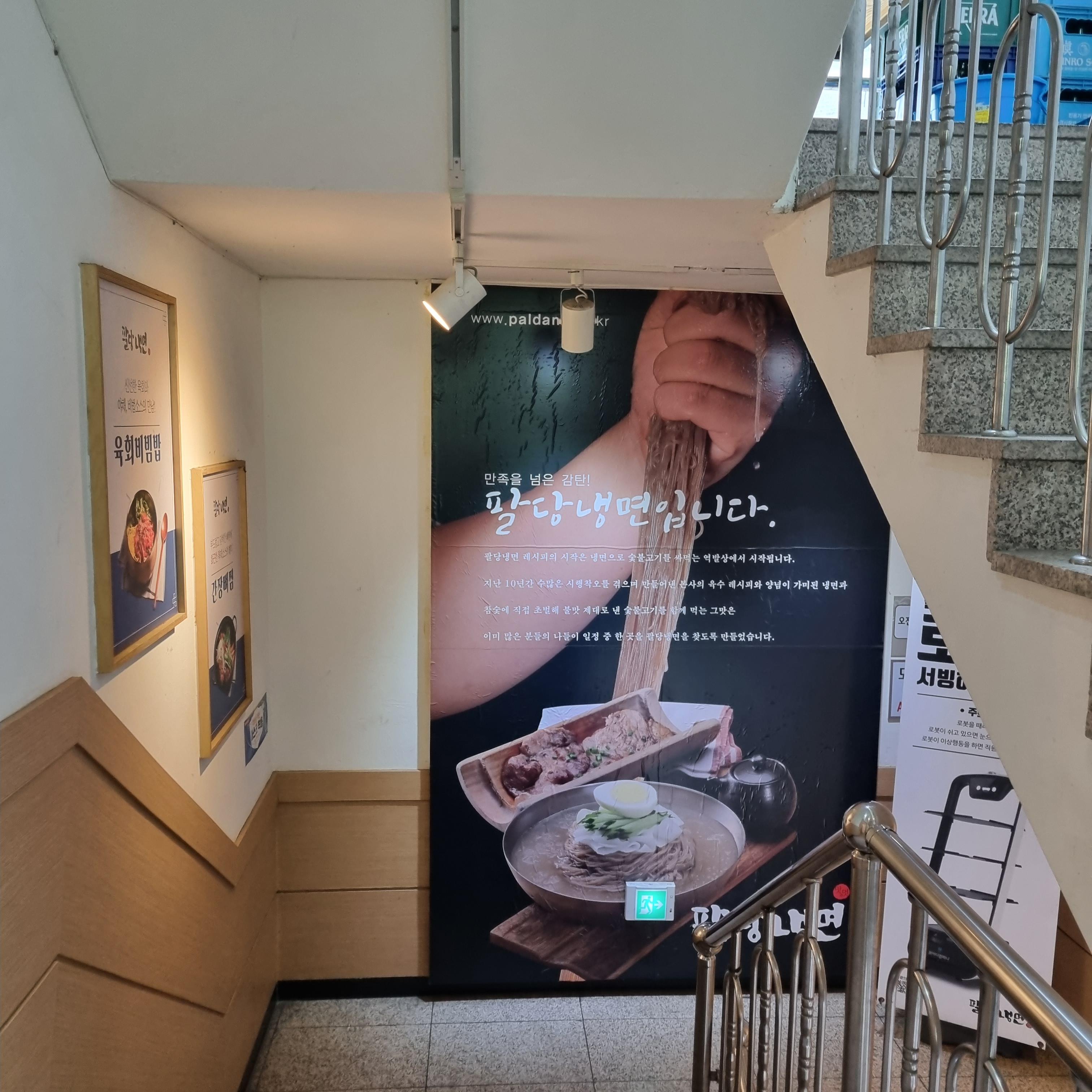 1층 갈비탕 집을 뒤로하고 2층 냉면집으로 갔어요. 올라가는 계단에 육회비빔밥도 팔고 간장뼈찜도 파는 걸 알게 됐어요.