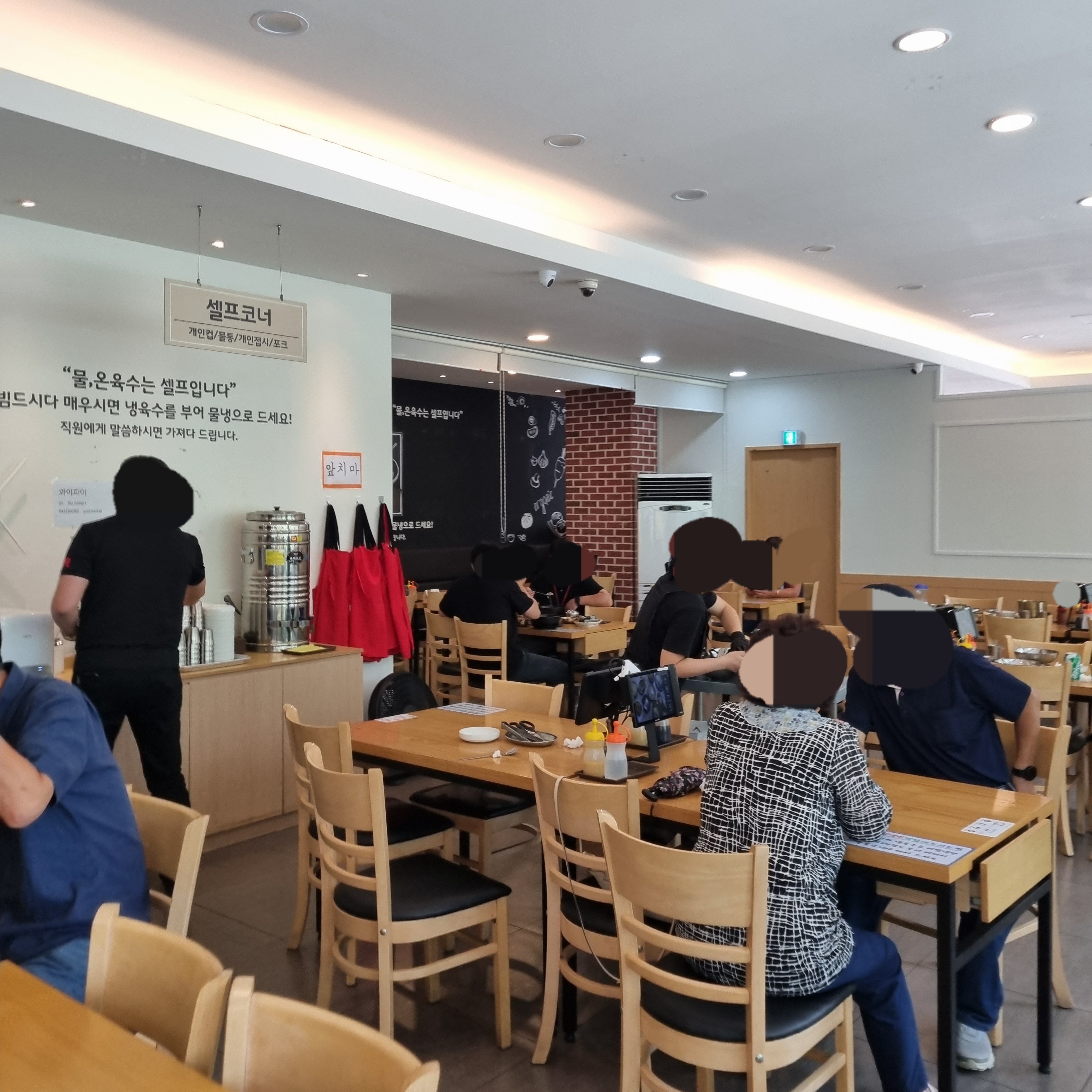 출입구에서 왼쪽을 찍은 사진이에요. 사진에 보이는 셀프코너에서는 물도 셀프고 온육수, 앞치마도 셀프였어요. 온육수가 맛있더라고요.