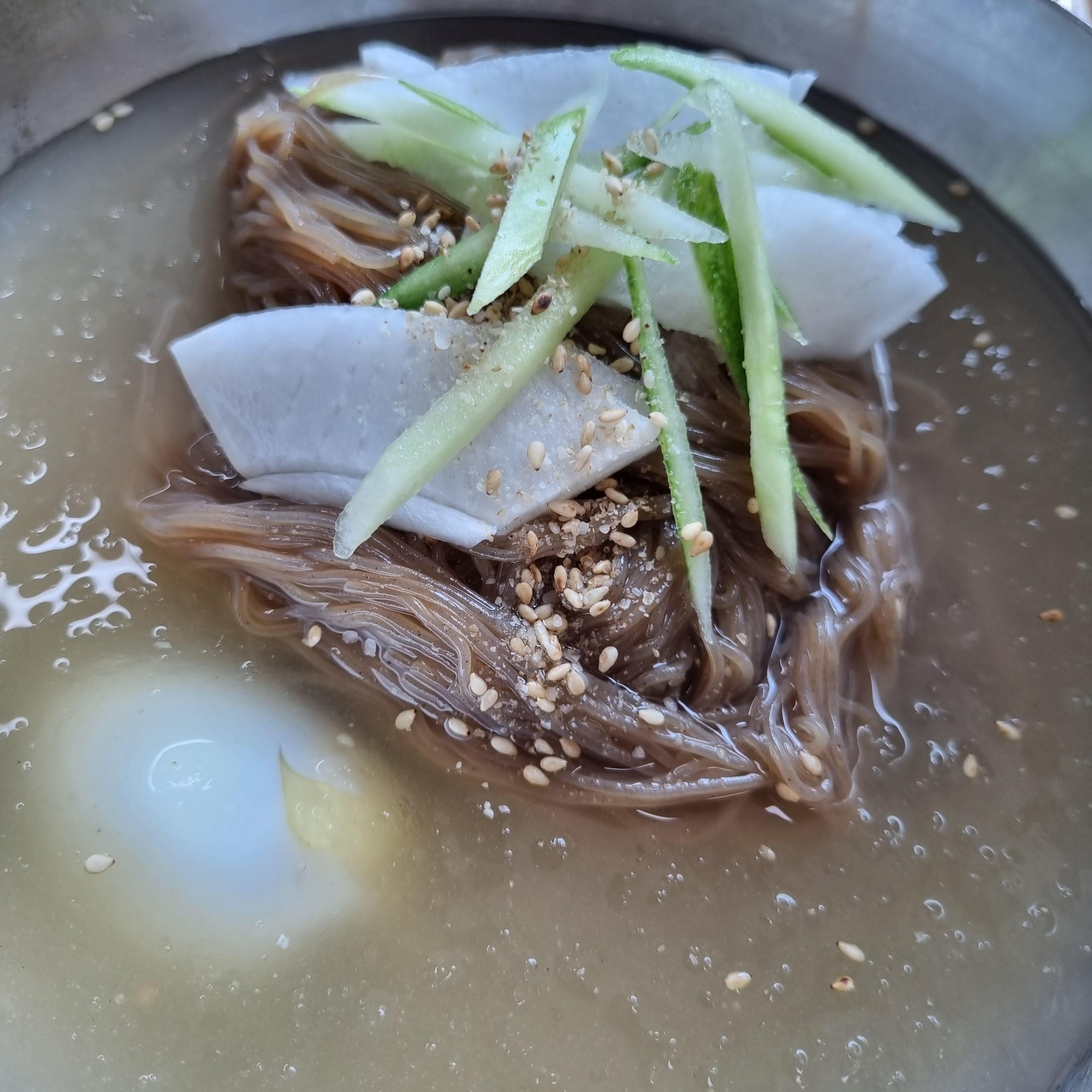 물냉면이 나왔어요. 얇은 면이 쫀득하니 시원하고 맛있었어요.