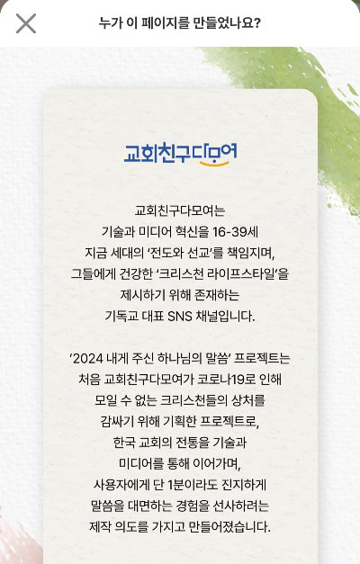 안 그래도 누가 이 페이지를 만들었는지 궁금했는데 소개되어 있네요. 소개된 제작의도, "단 1분이라도 진지하게 말씀을 대면하는 경험"이라는 말이 맘에 와닿습니다.